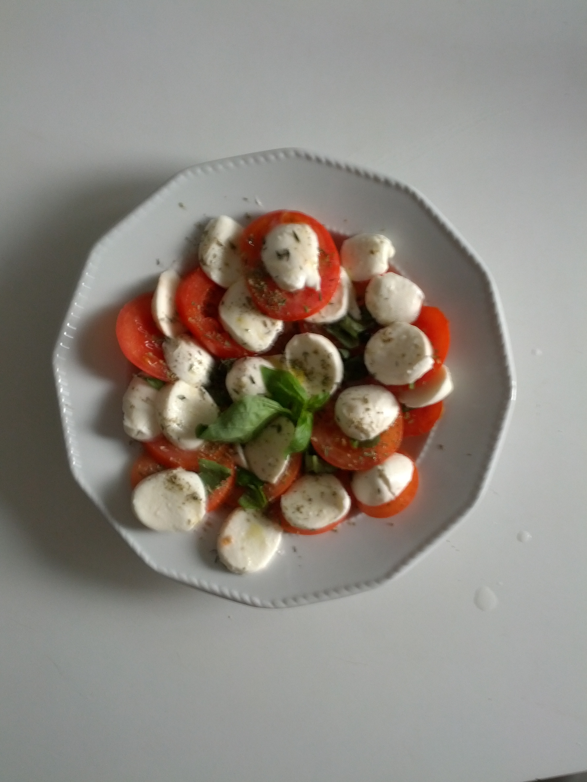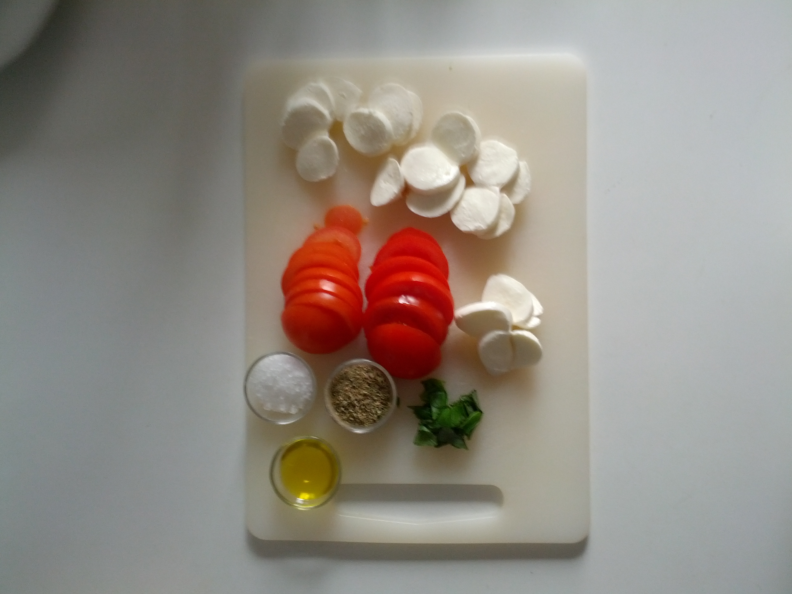 After 30(or more…) minutes, distribute the mozzarella slices on the tomato, add the oil….now all is done, reay to enjoy it!
