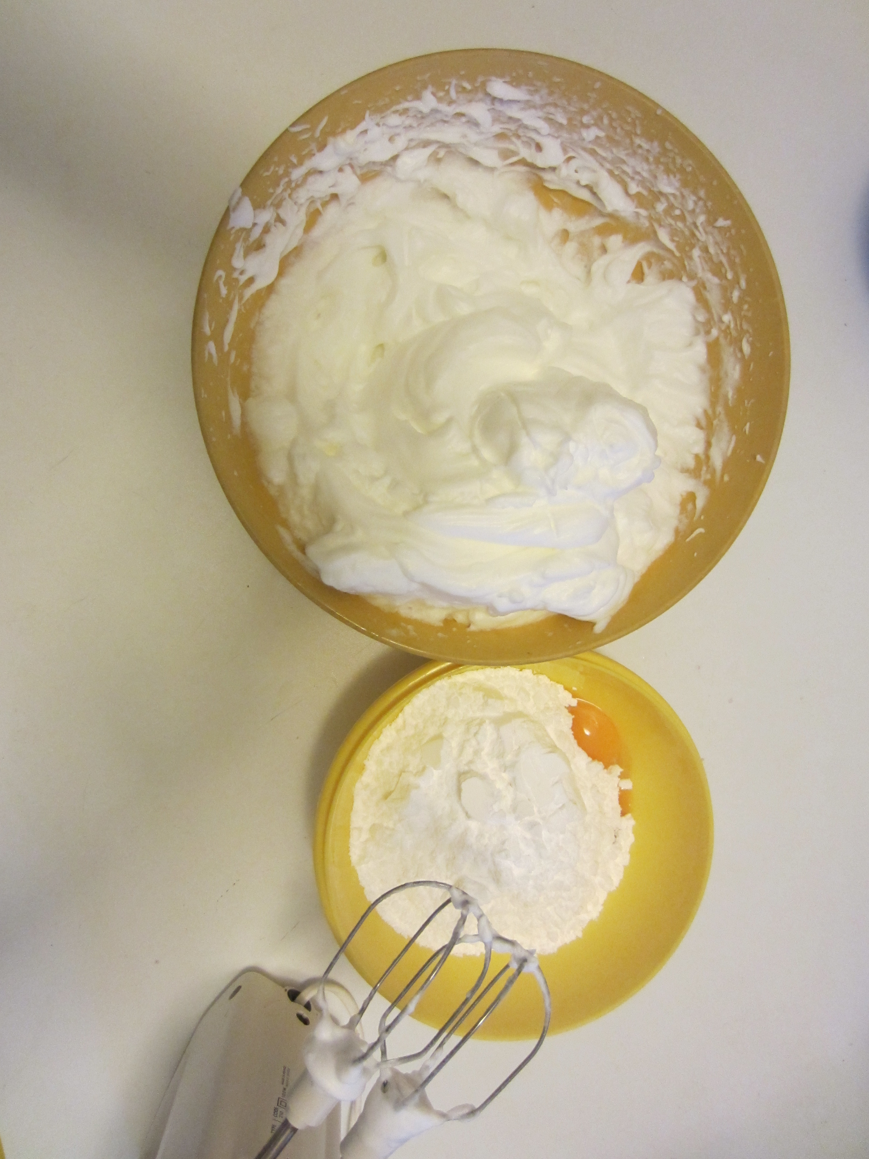 Put together the mixture of egg yolks and sugar with half of the egg whites. Do it with a wood spoon and a gentle top down motion,  till you will get a smooth cream.
