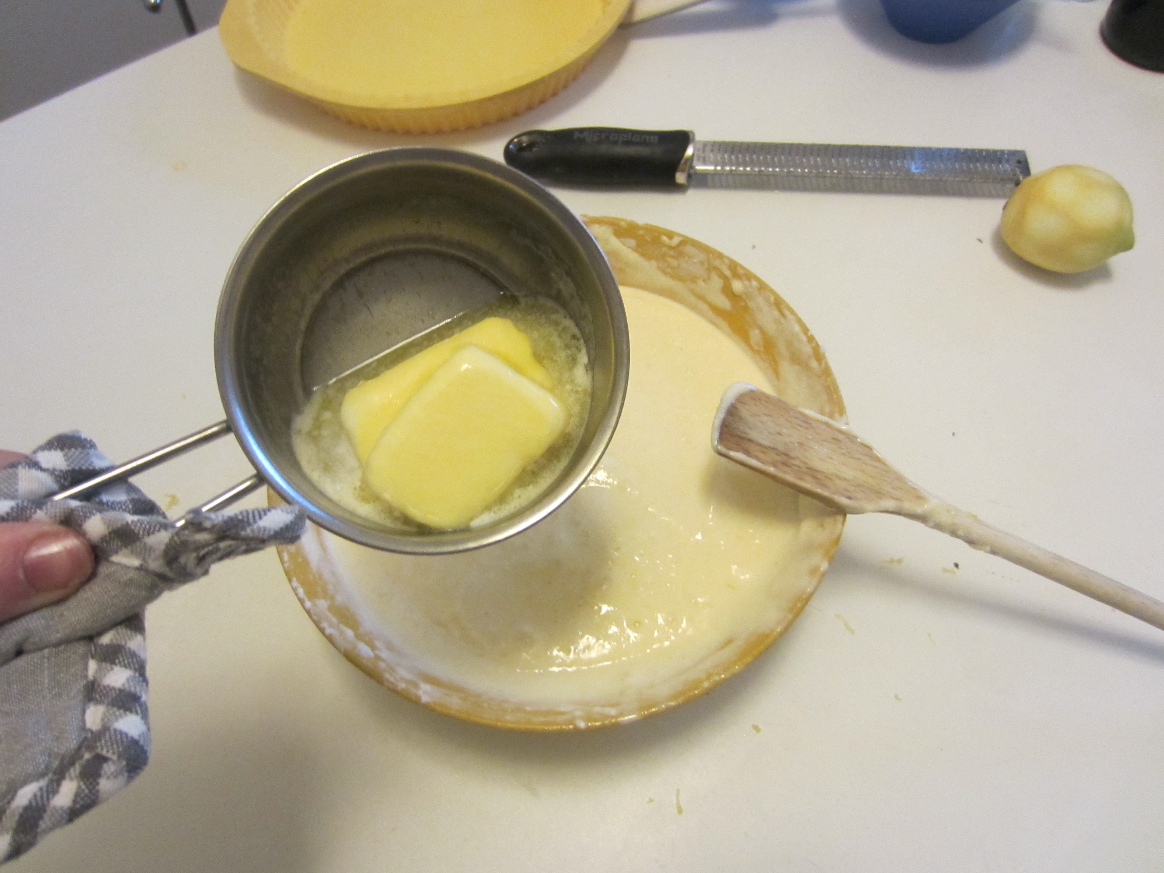 Now is time to add the lemon grated limb or the vanilla extract. Then pour half of egg whites and finally the melted butter very gently warmed .