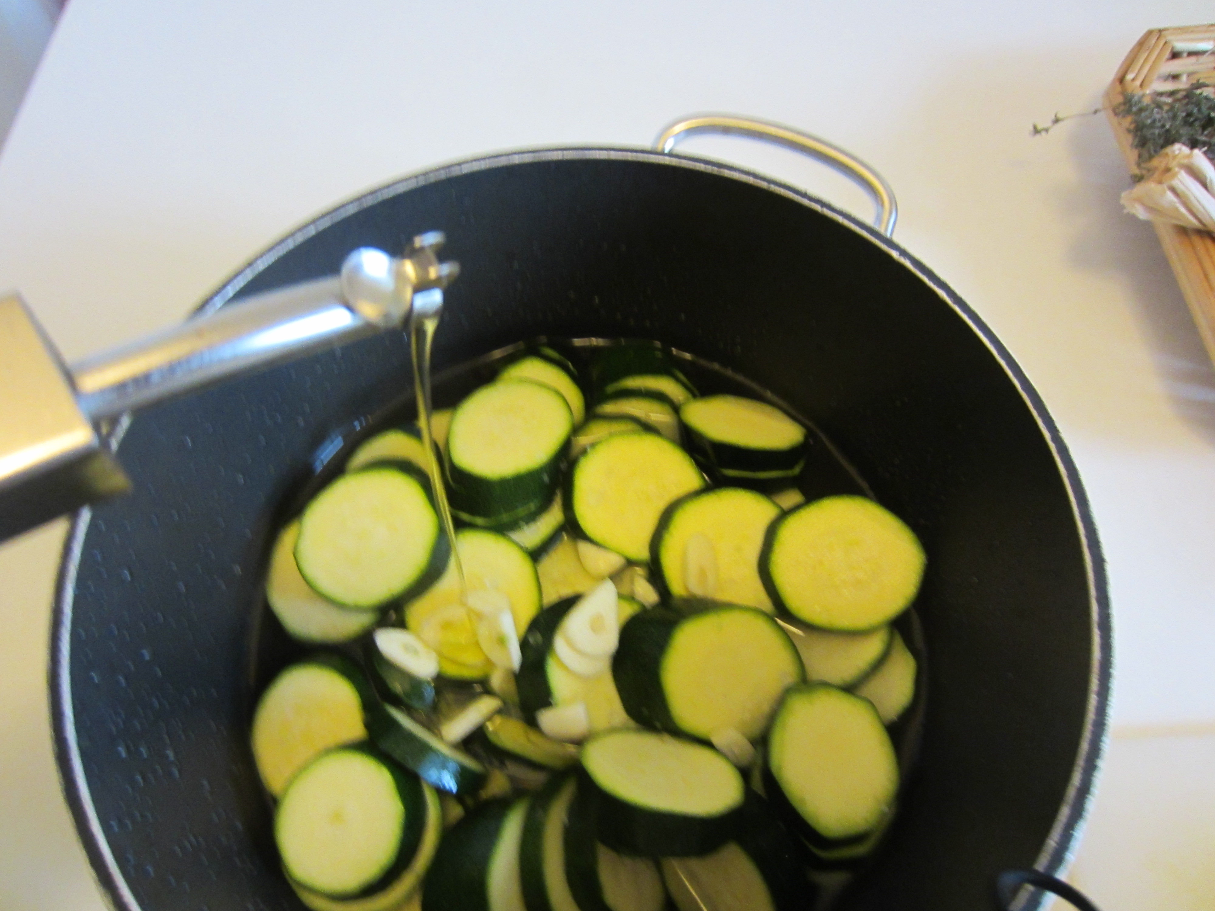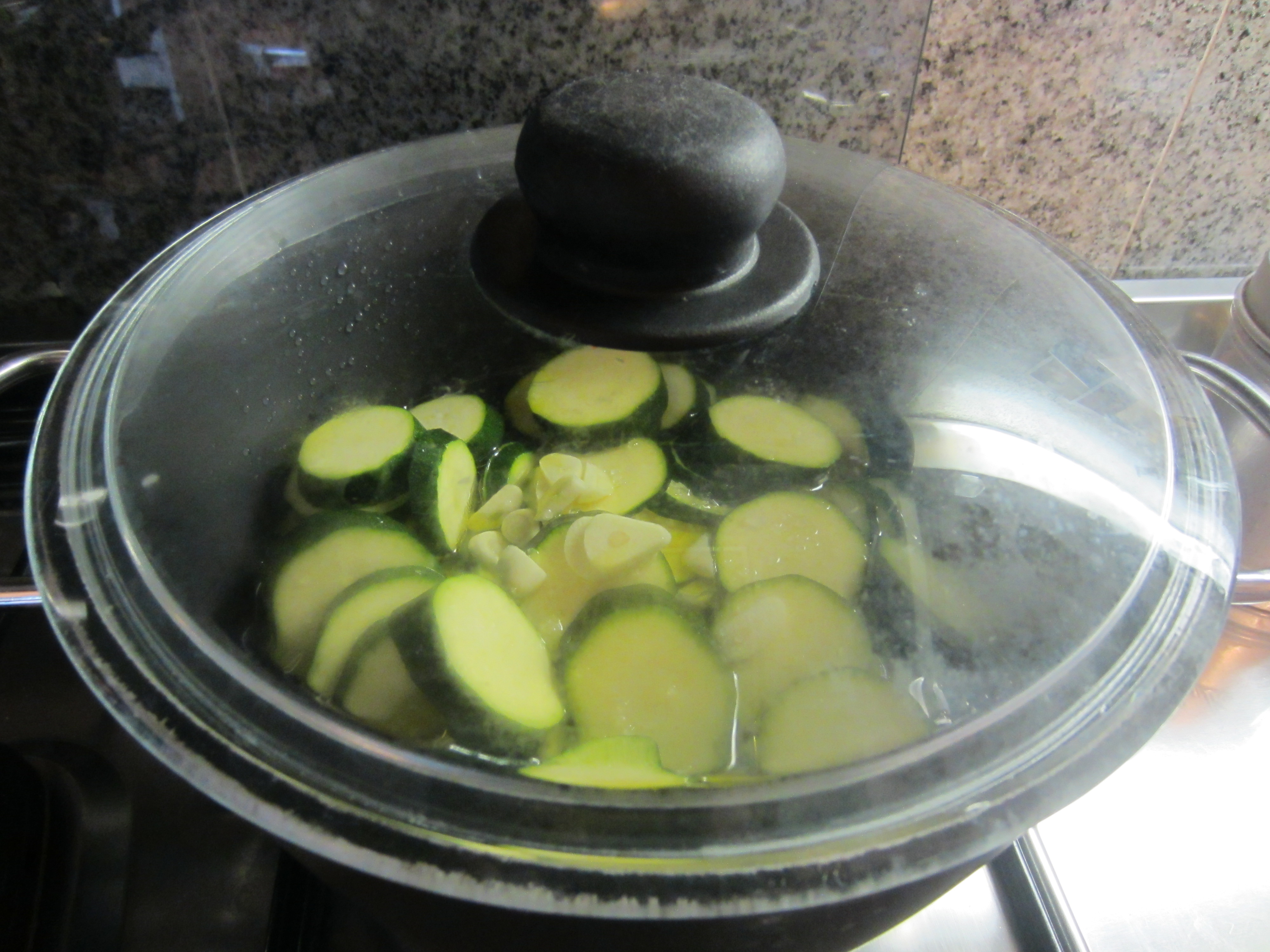 Put the sliced zucchini, garlic and salt and 3 tablespoon of EVO oil in a saucepan and cover with water up to the middle. Cover with the lid and bring to a boil.