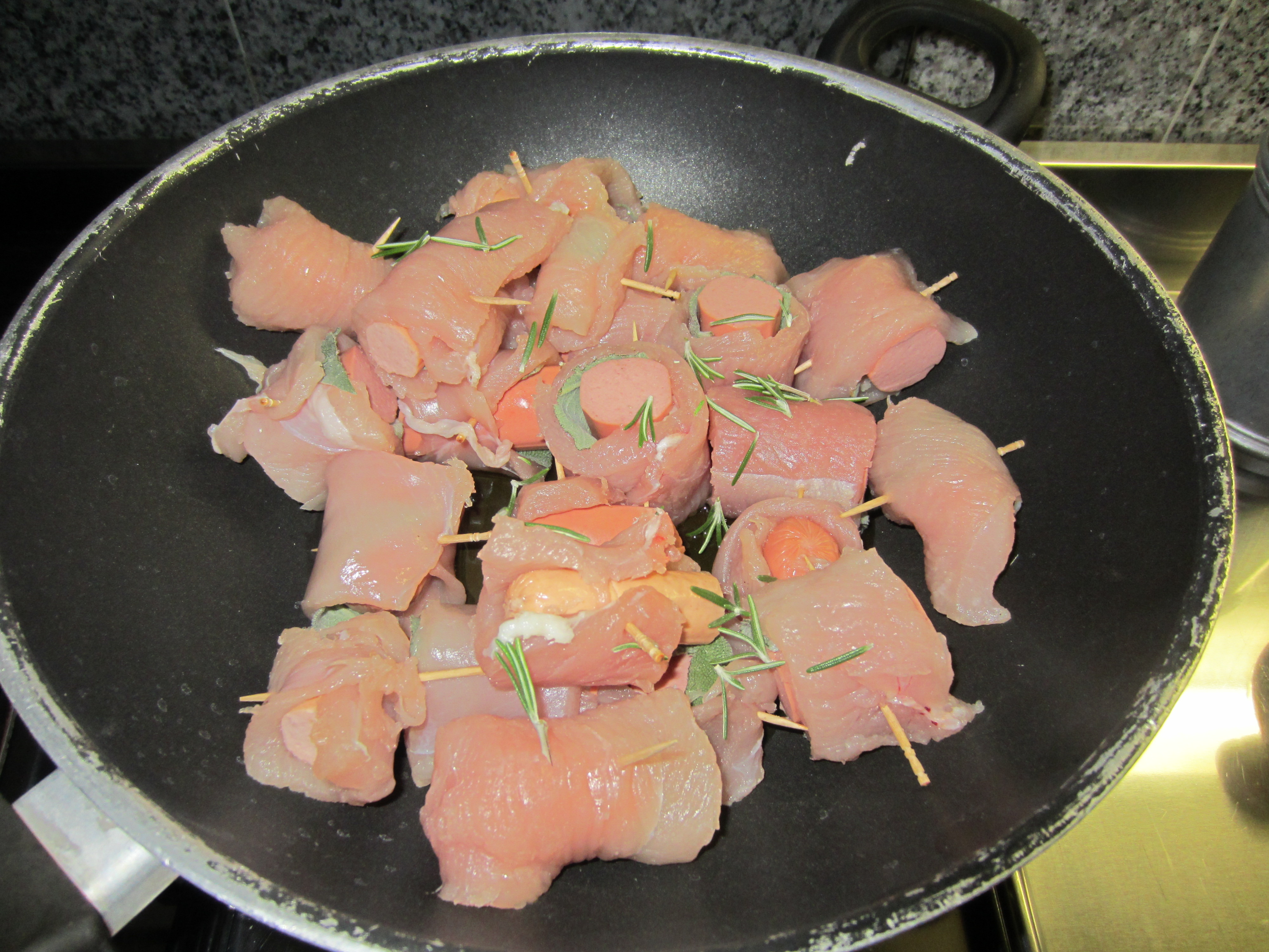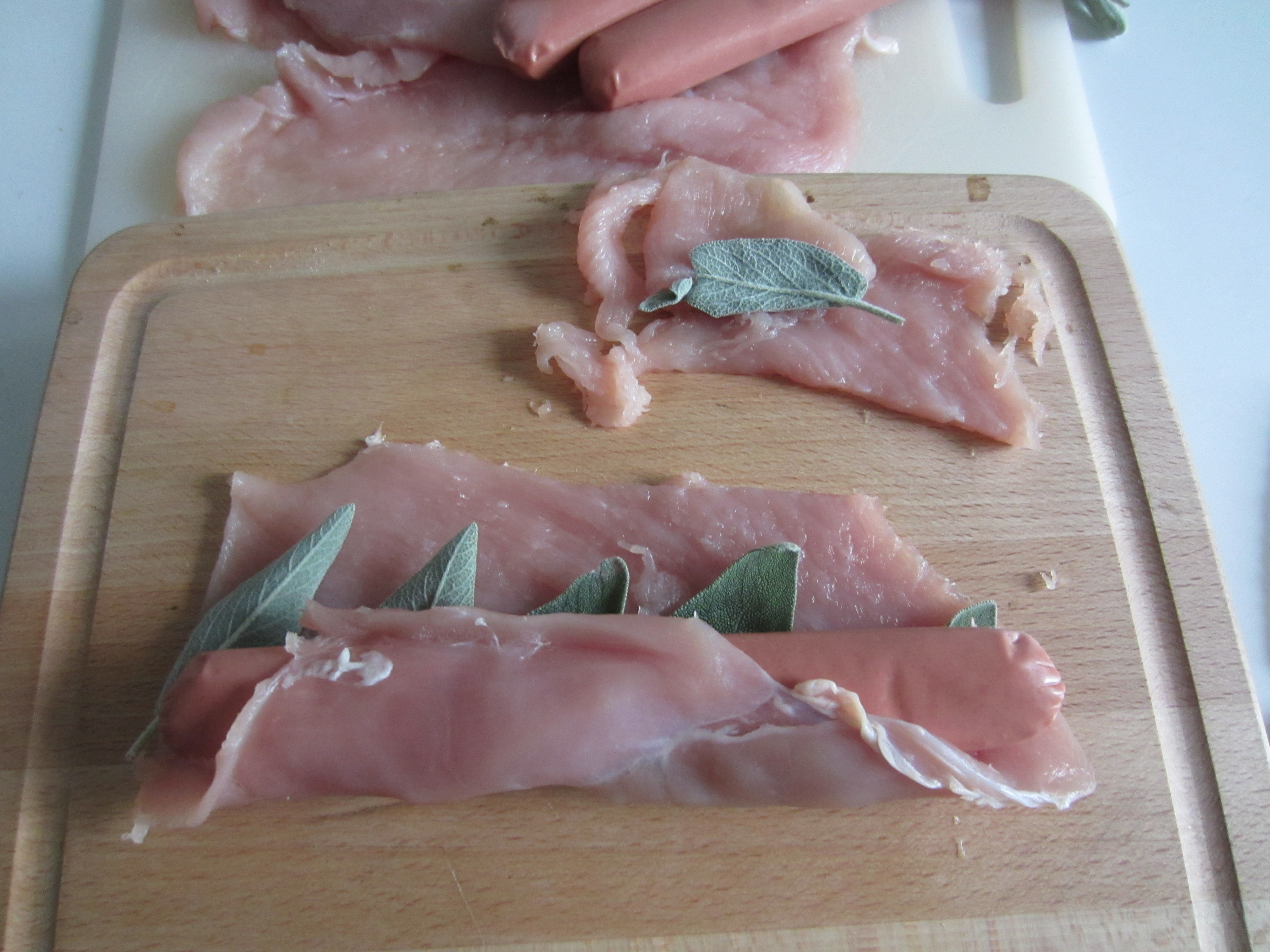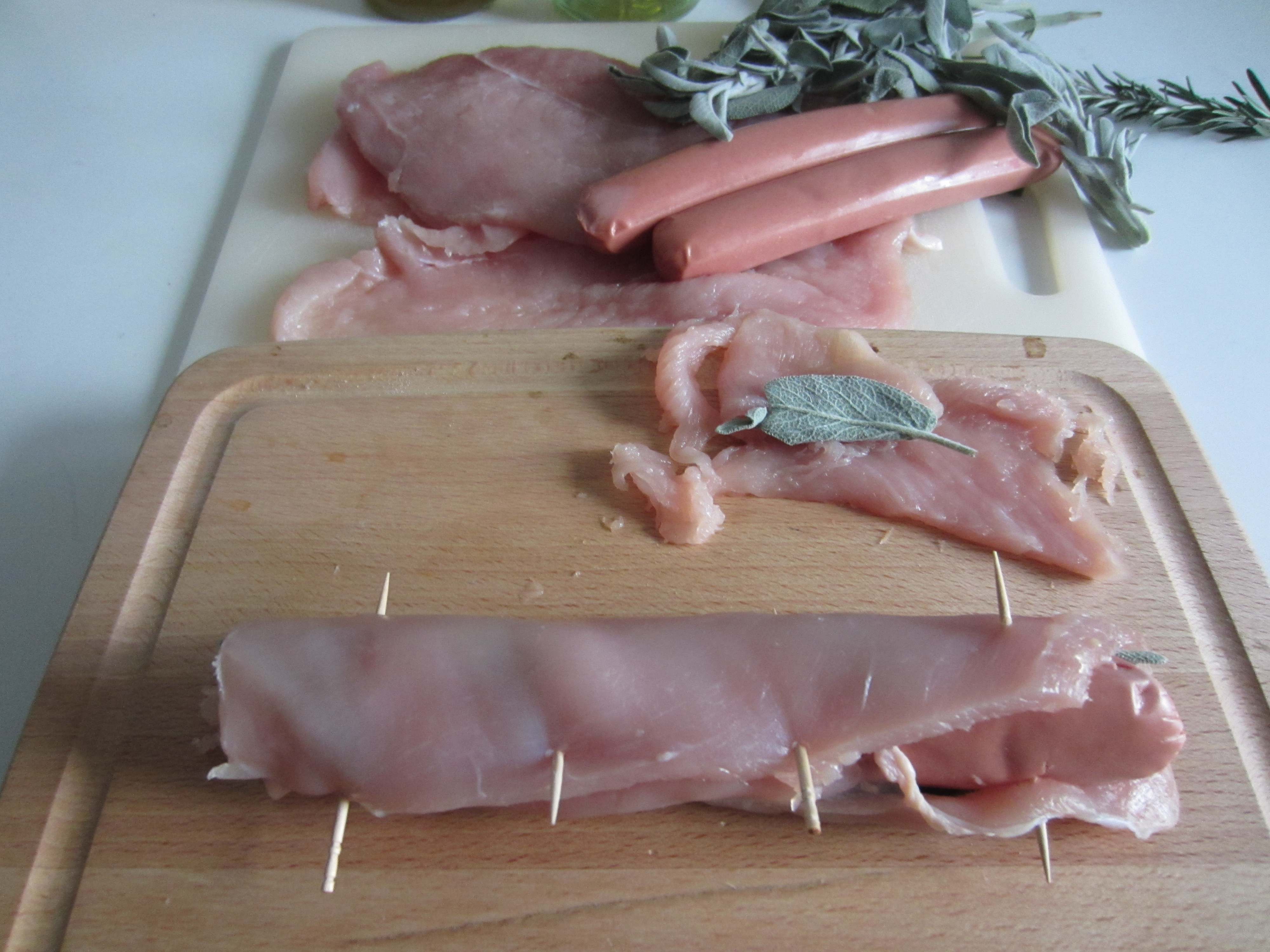 3 tablespoons extra virgin olive oil, 2 glasses of white wine, 2 cups of milk, plenty of fresh sage, fresh rosemary, 3 large, thin slices of turkey breast, 250 grams of wiener sausage, toothpicks to block the roasts