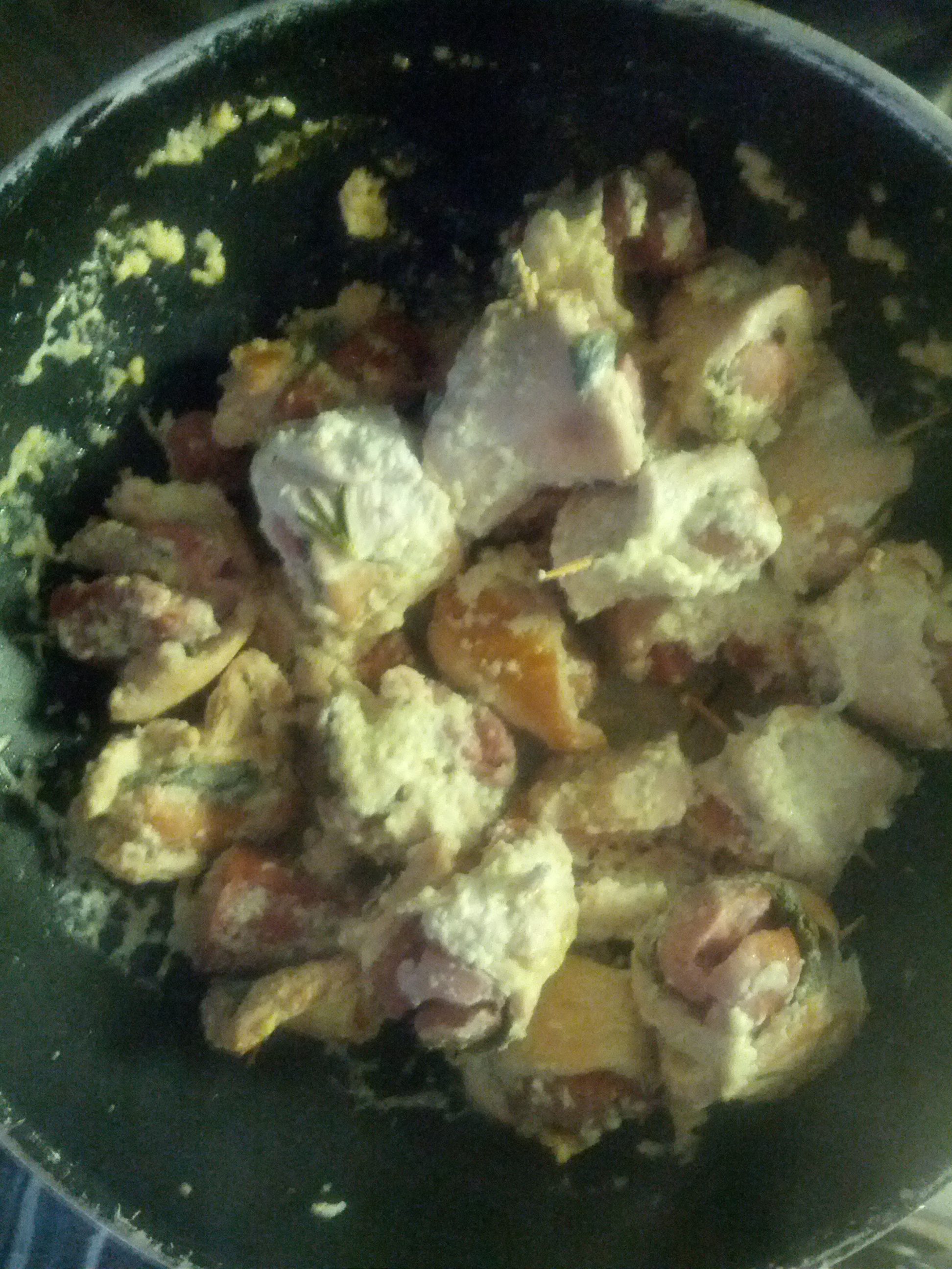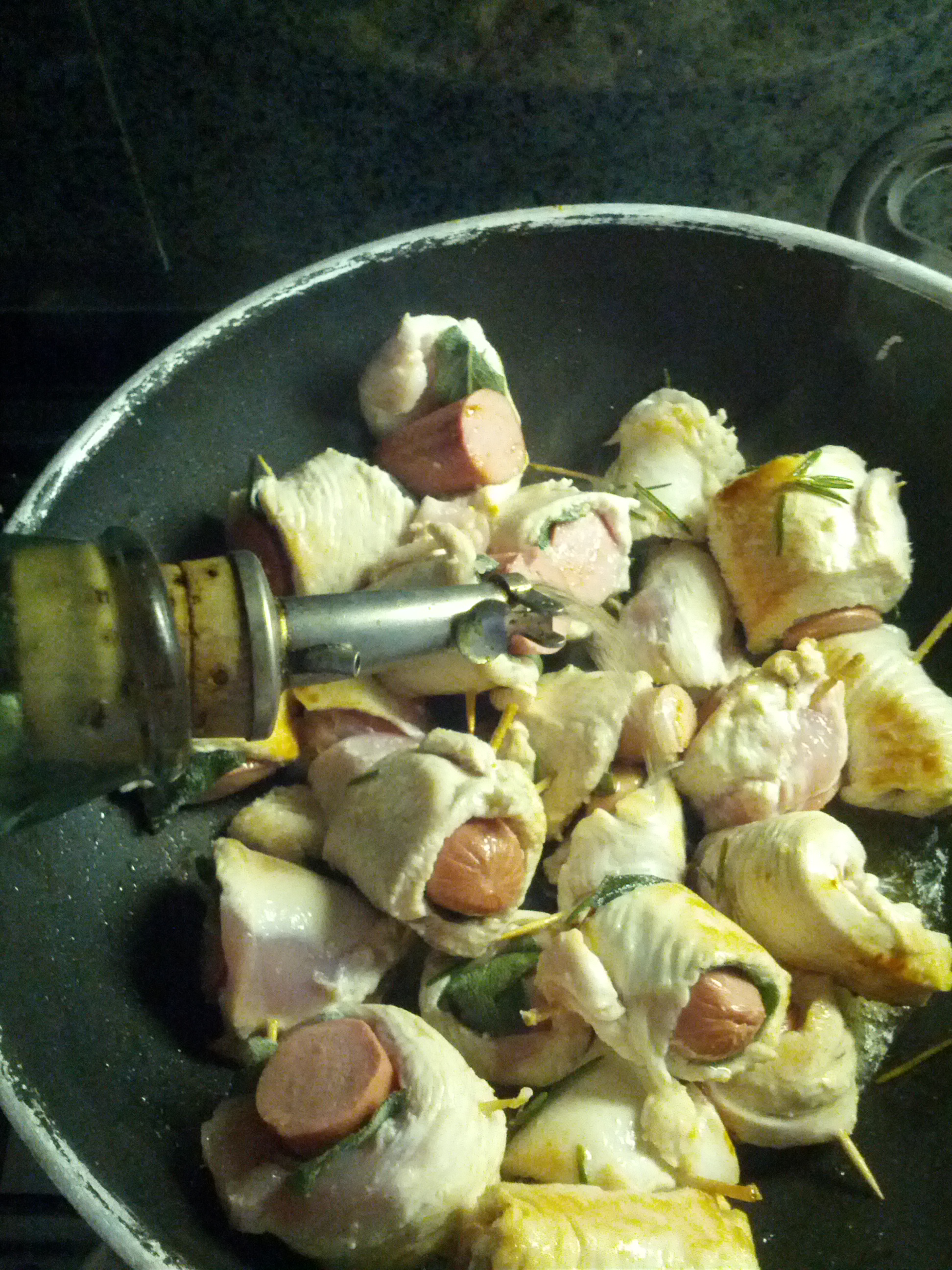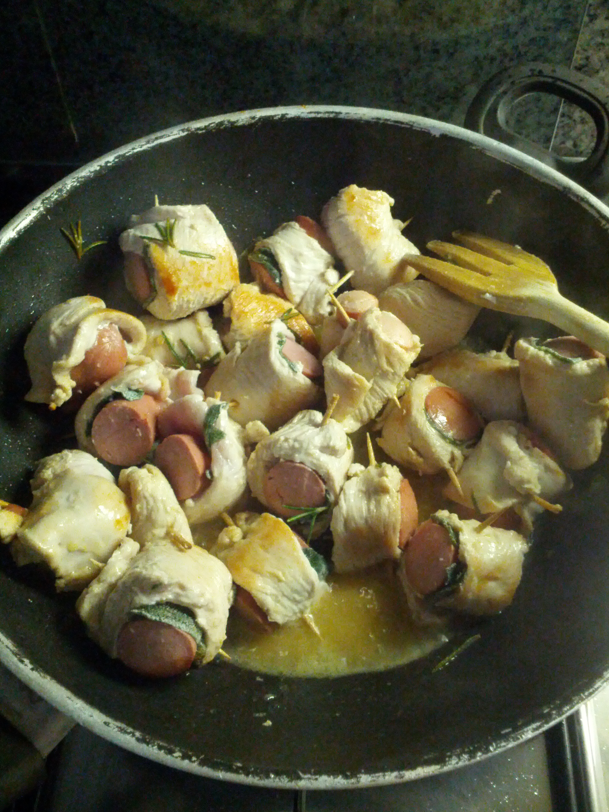 3 tablespoons extra virgin olive oil, 2 glasses of white wine, 2 cups of milk, plenty of fresh sage, fresh rosemary, 3 large, thin slices of turkey breast, 250 grams of wiener sausage, toothpicks to block the roasts