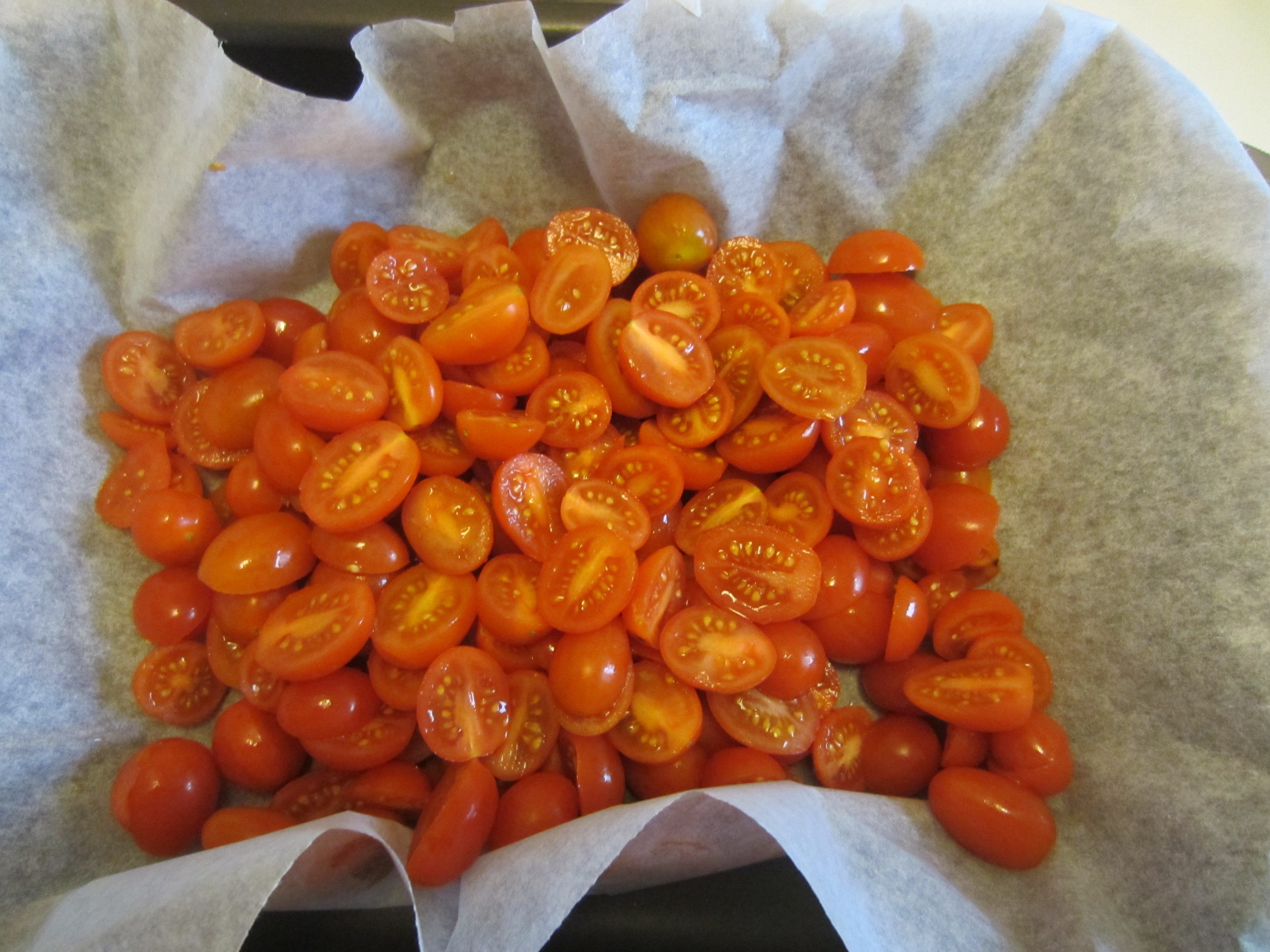 Put the baking paper into the pan, grease with a couple of tablespoons of oil the bottom and pour the tomatoes cut in half.