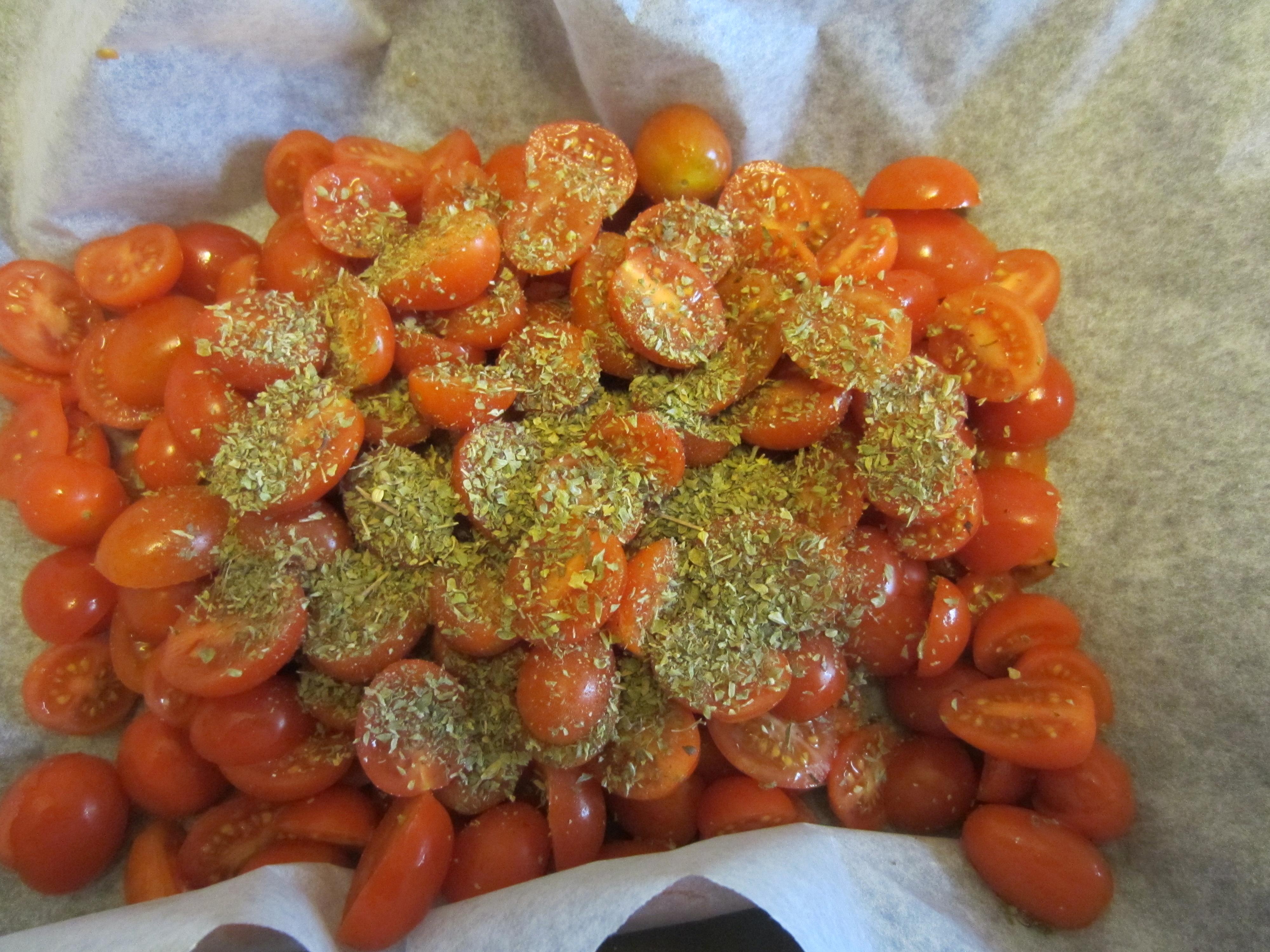 600 grams of cherry tomatoes or Pachino tomatoes, 2 cloves of peeled garlic into small pieces, 8 tablespoon of EVO oil, coarse salt to taste, abundant oregano, a bit of sugar, baking paper