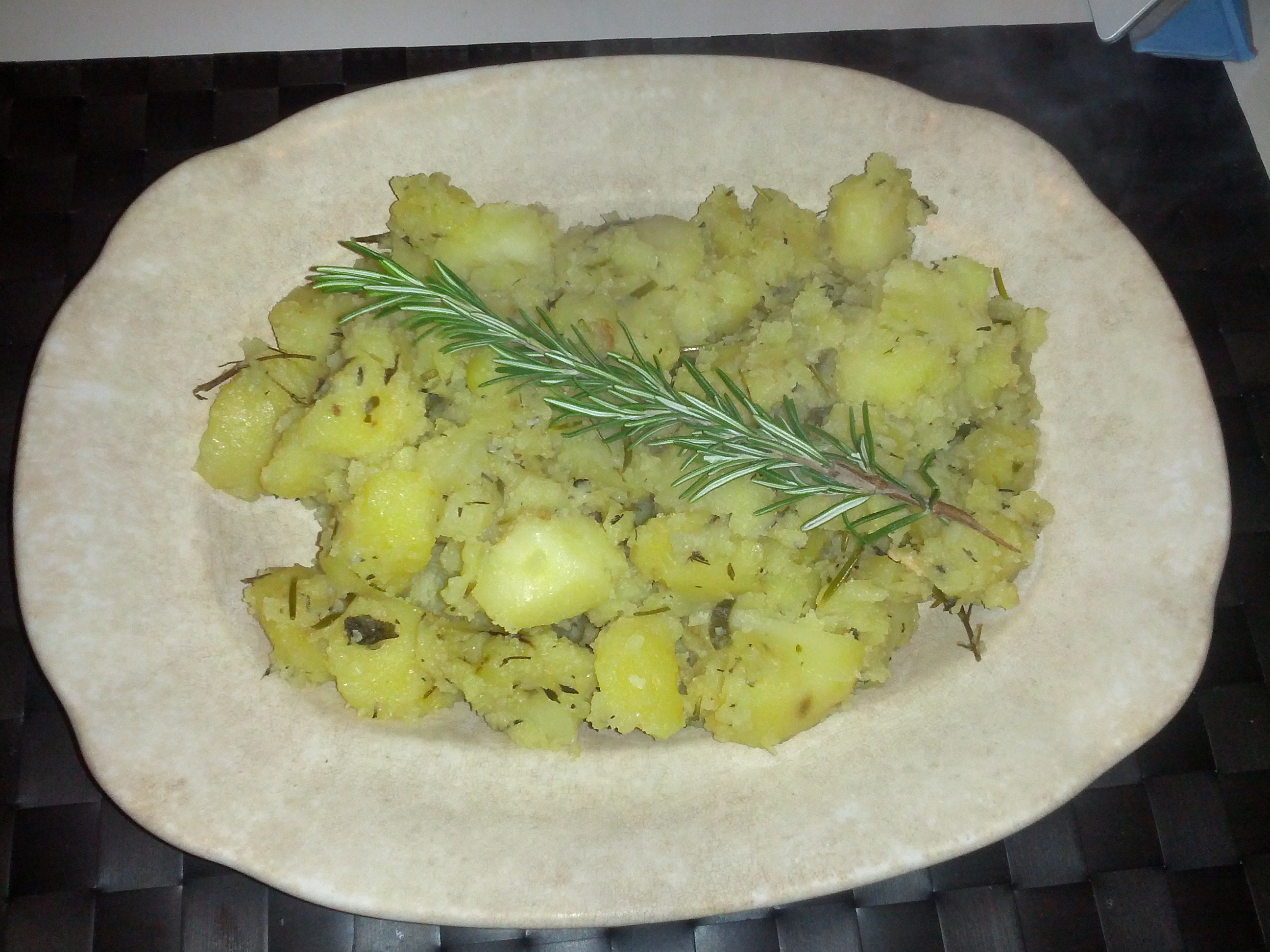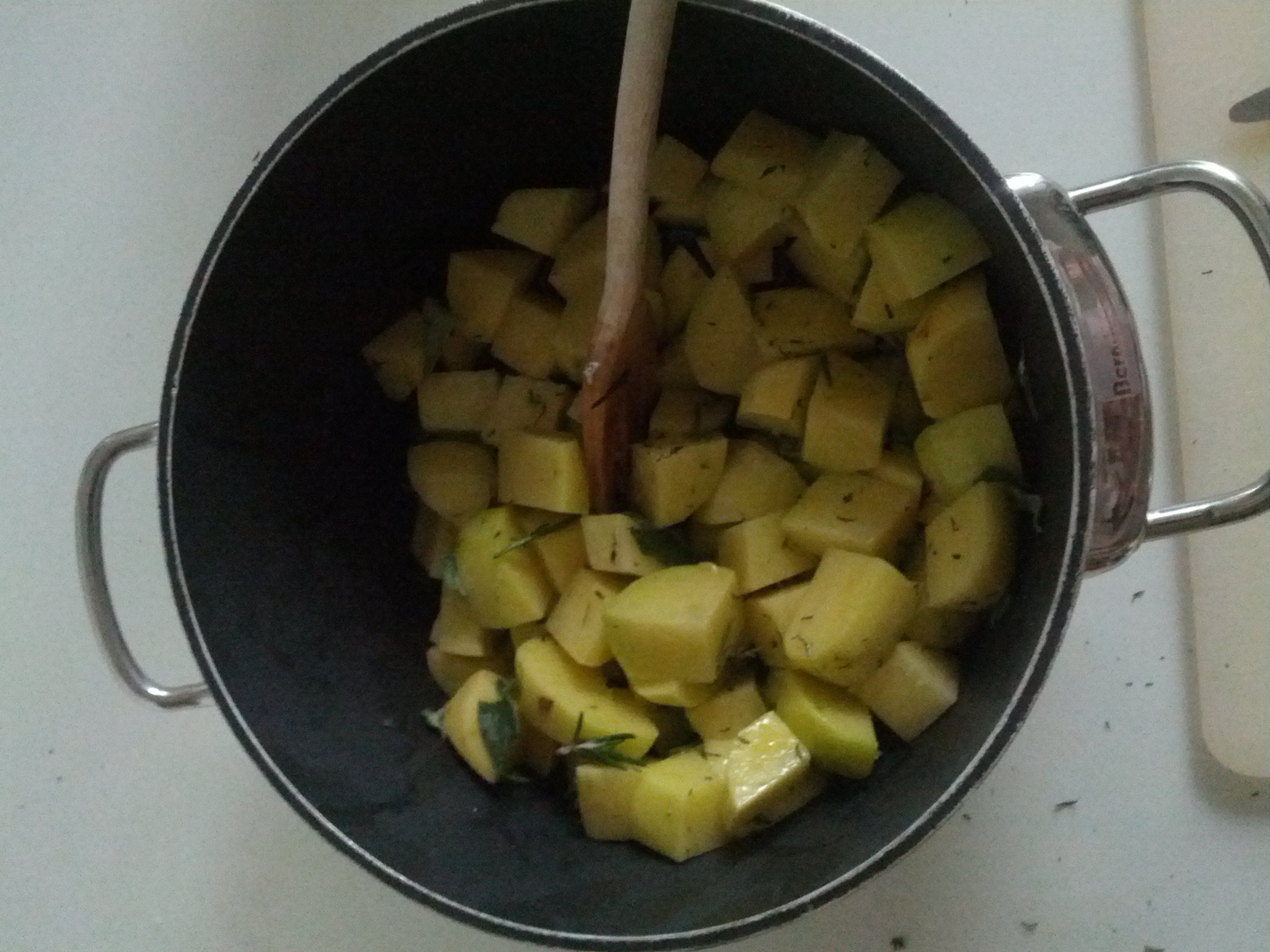 1 kg potatoes , plenty of fresh rosemary , fresh sage, fresh thyme, a clove of garlic, 4 tablespoons of extra virgin olive oil , 1 large glass dry white wine, salt , water.First of all, wash and peel the potatoes . If they are organic potatoes , do not throw the skins : you can add them to a good vegetable stock or make chips with a little ‘ extra virgin olive oil boiling . Will still be delicious and rich in vitamins.