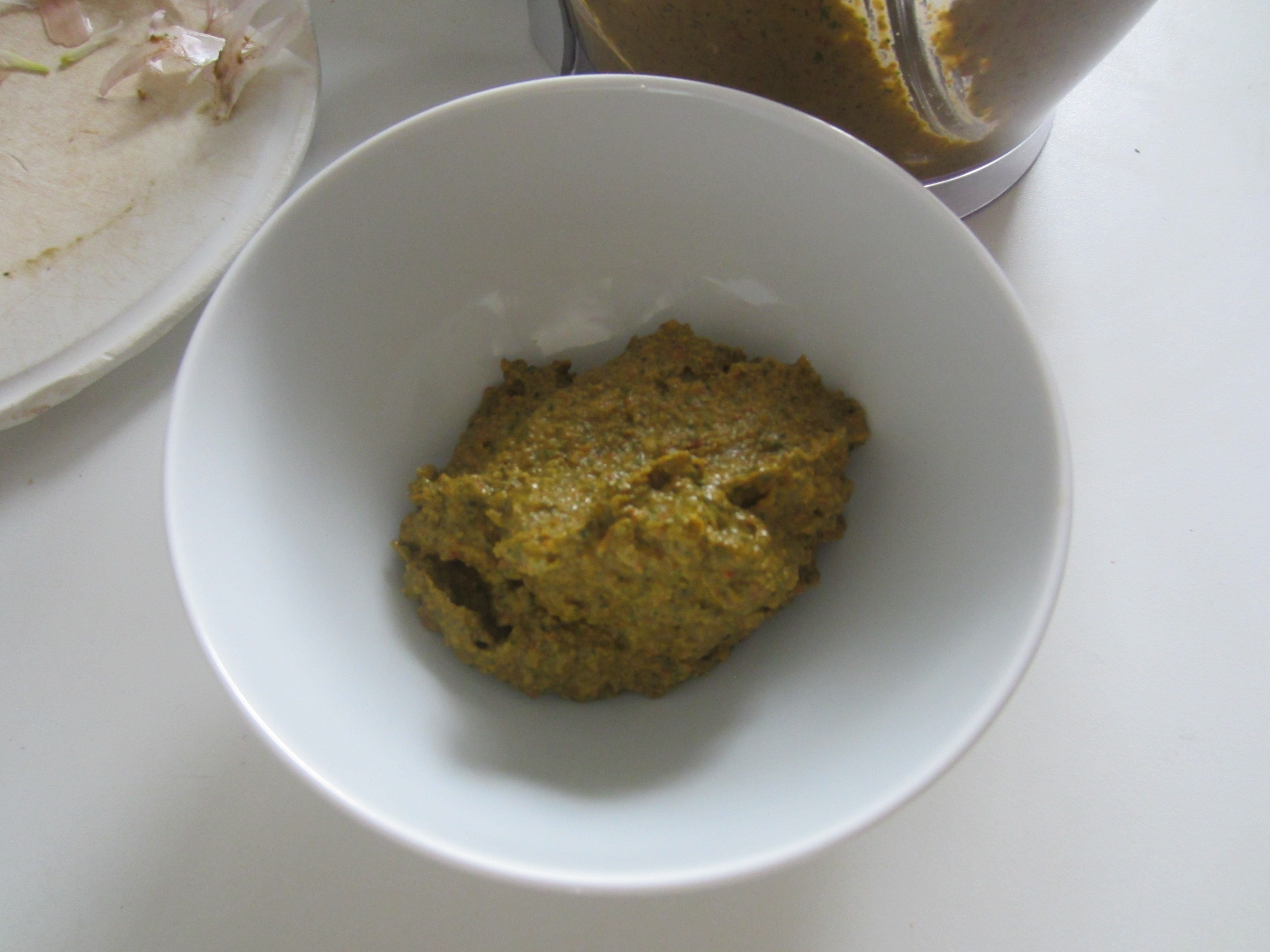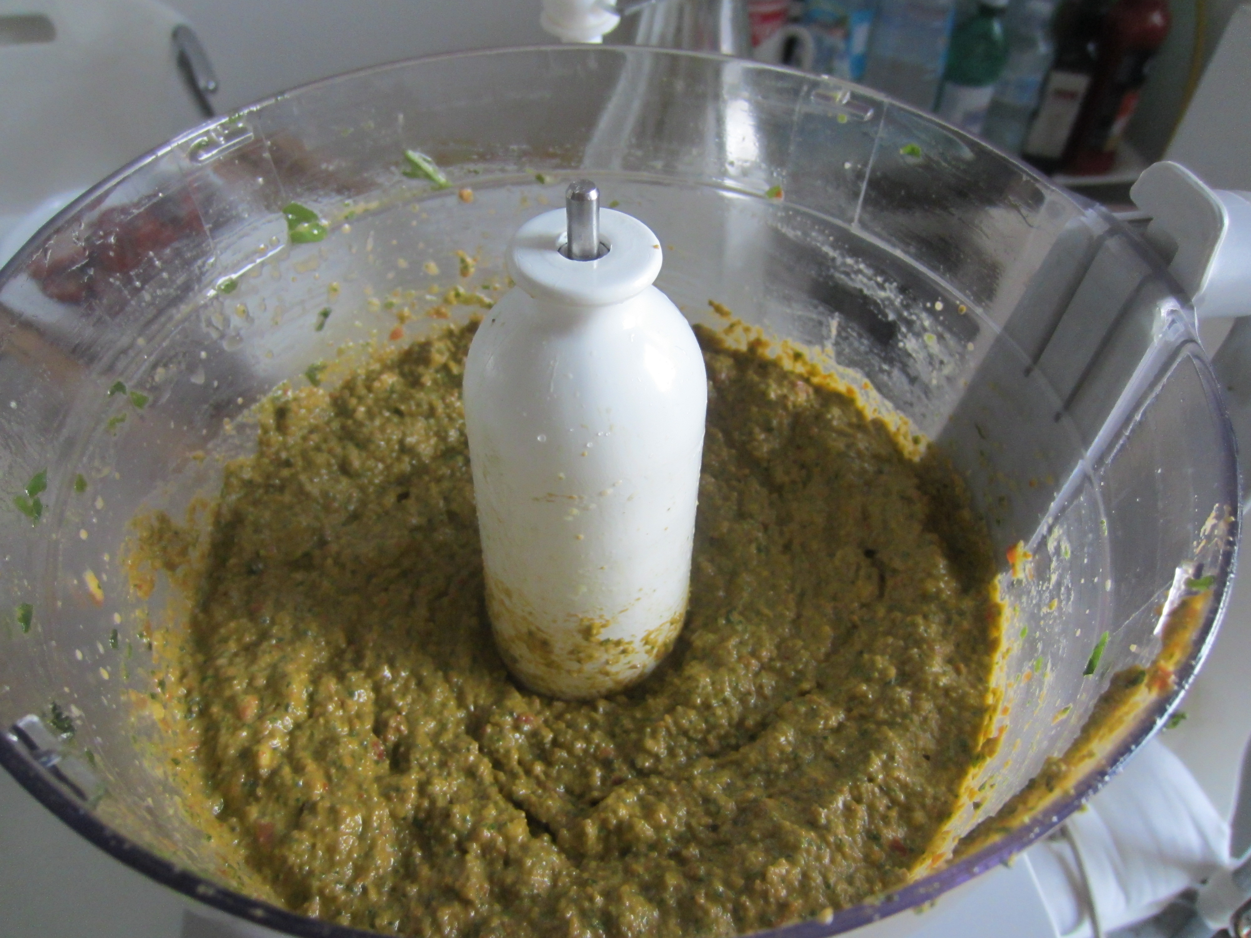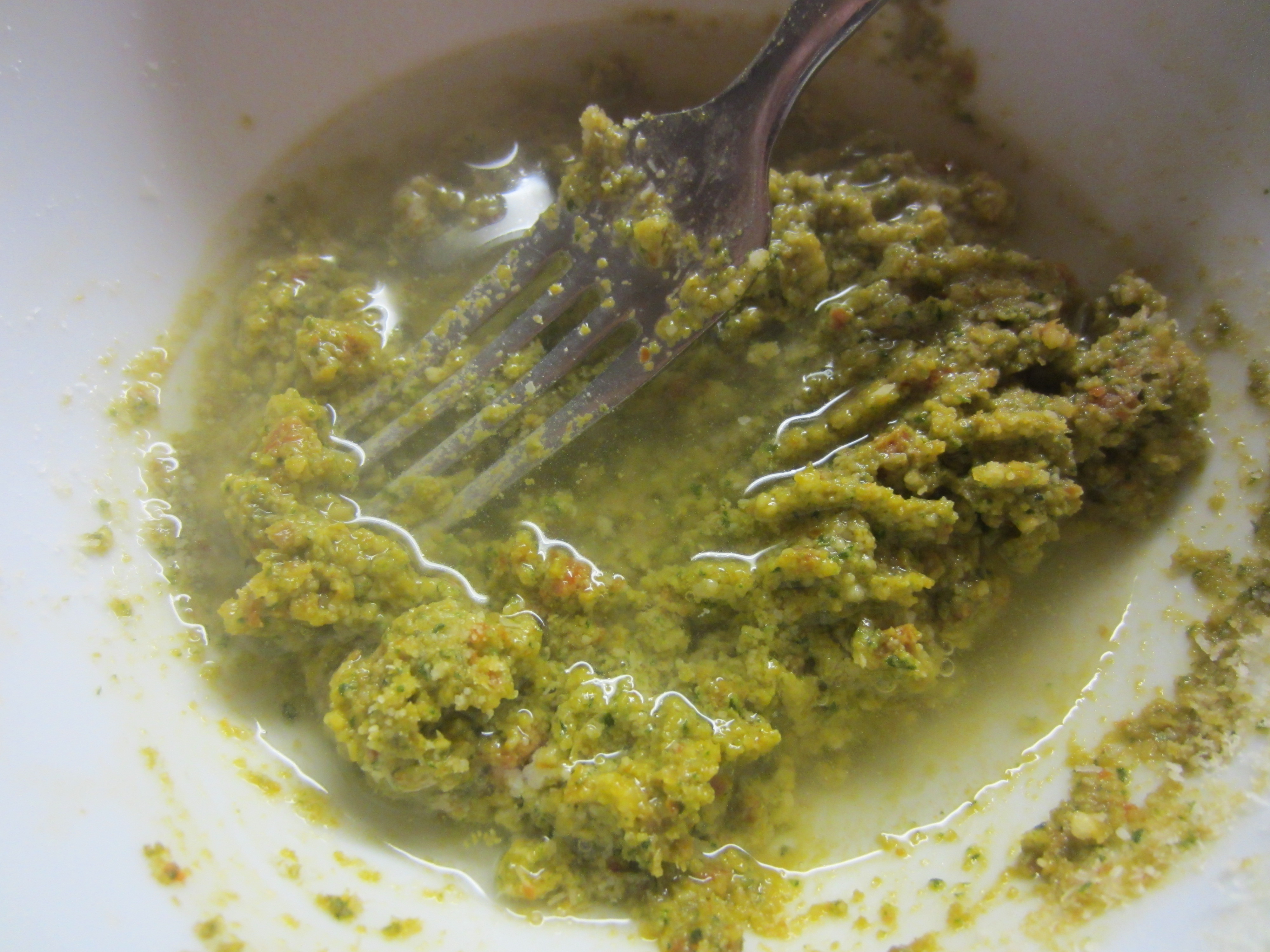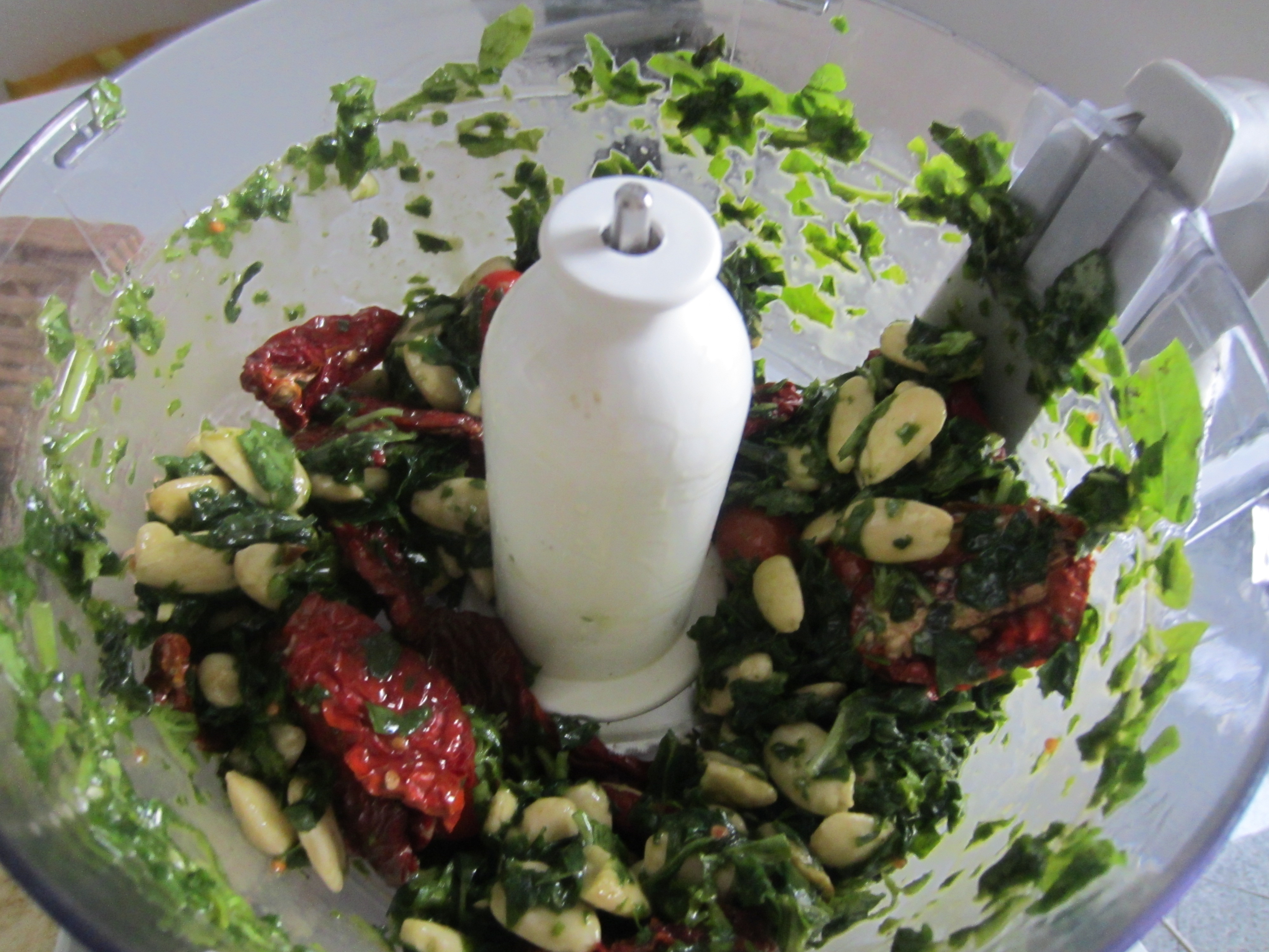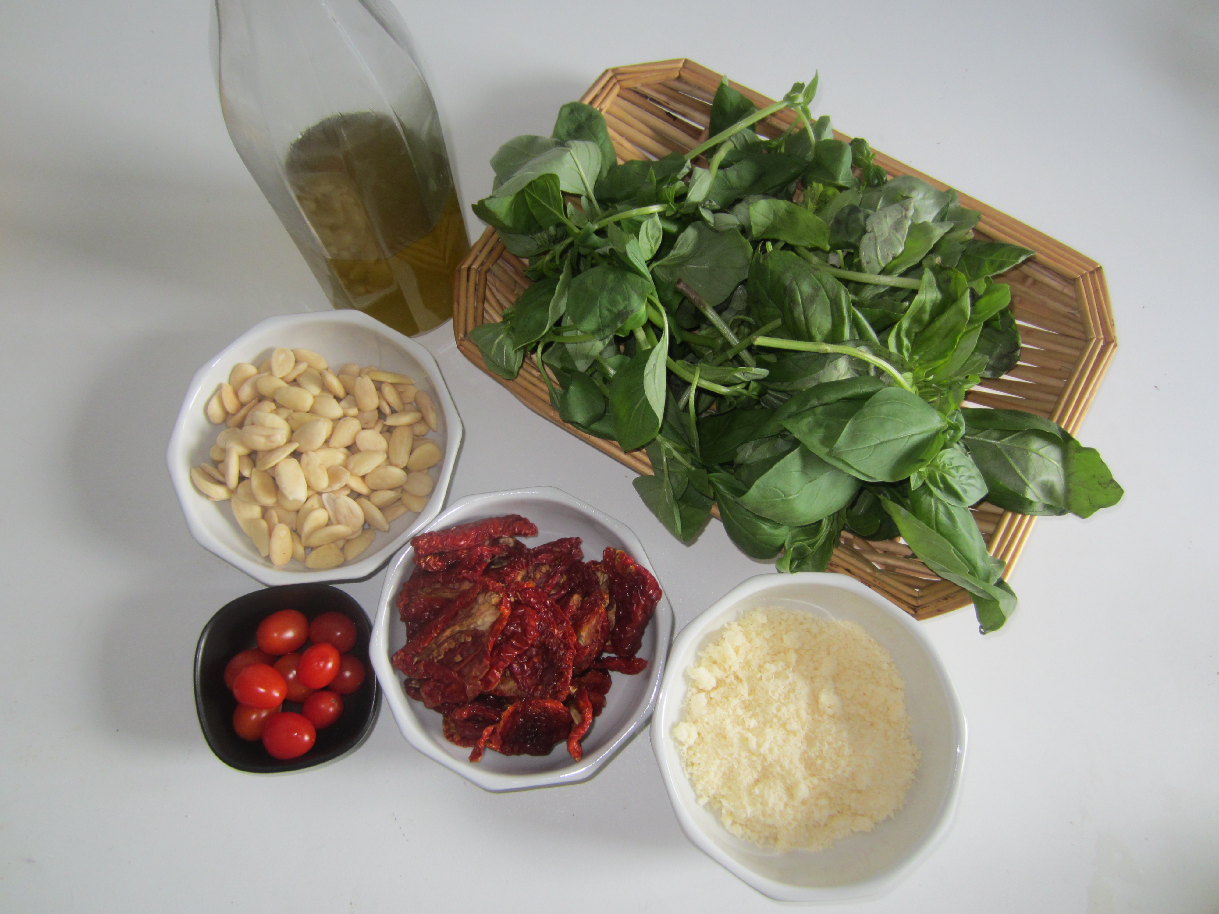 The procedure is very simple: just put the washed basil , garlic , almonds, sugar, sun-dried tomatoes and fresh tomatoes in a blender and blend well together slowly adding the oil. If necessary, add a bit ‘ of water and a little’ oil and continue to whisk until the whole thing will become a thick and creamy sauce .