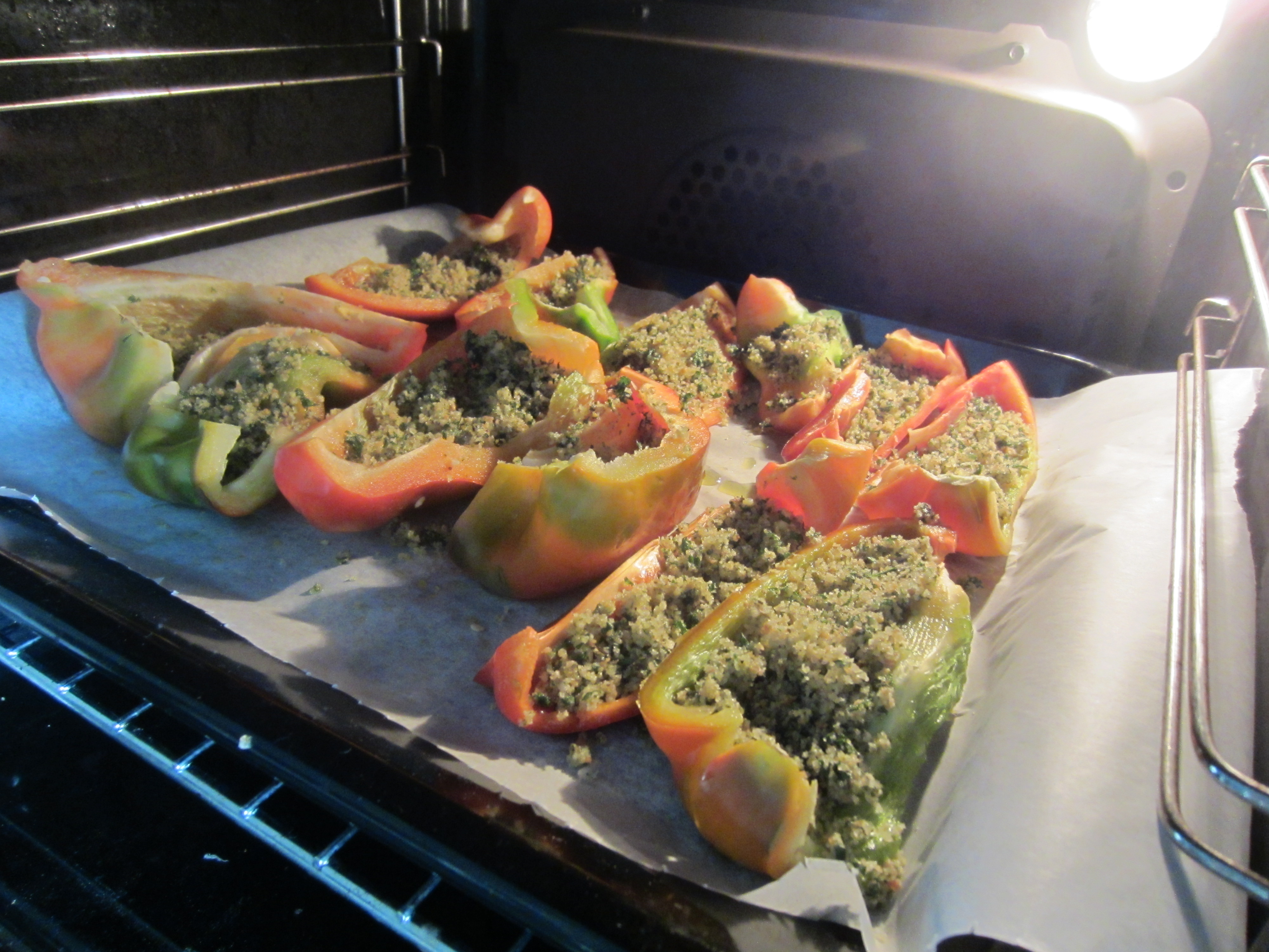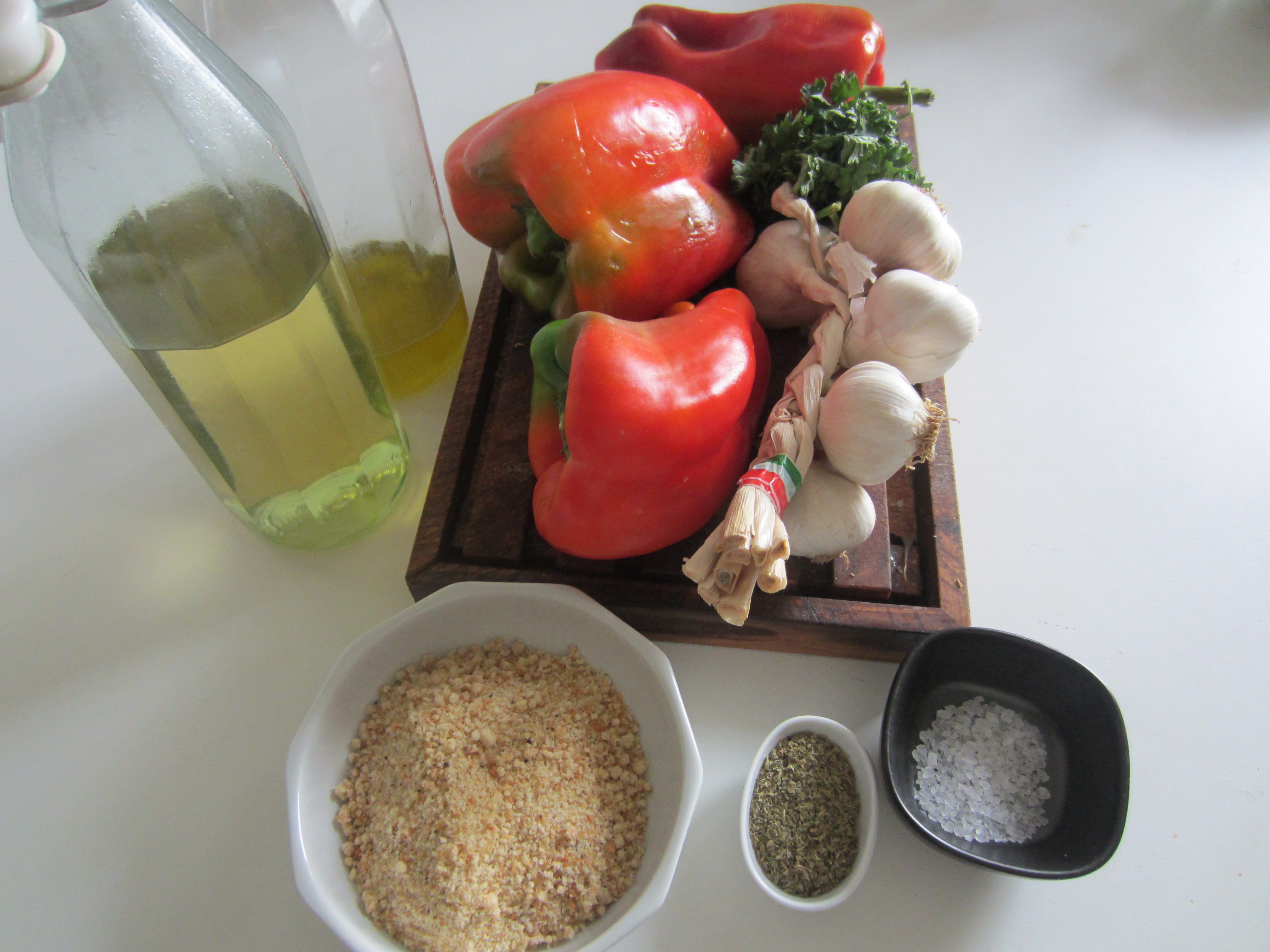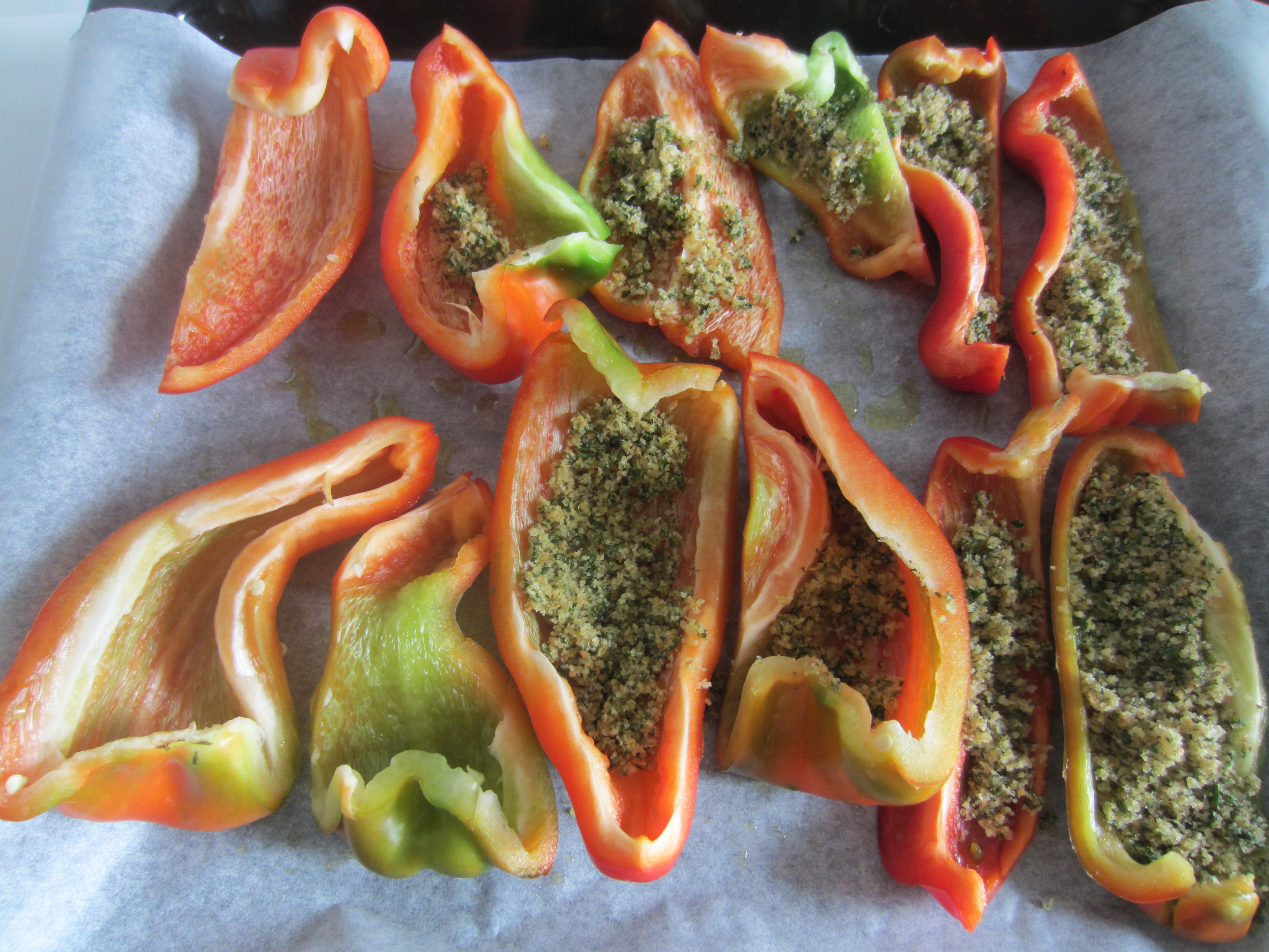 You will need 3 beautiful peppers , 100 grams of stale bread crumbs, 30 grams of fresh parsley, a clove of garlic, half a glass of dry white wine 5 tbsp extra virgin olive oil , salt, 1 tablespoon of oregano.