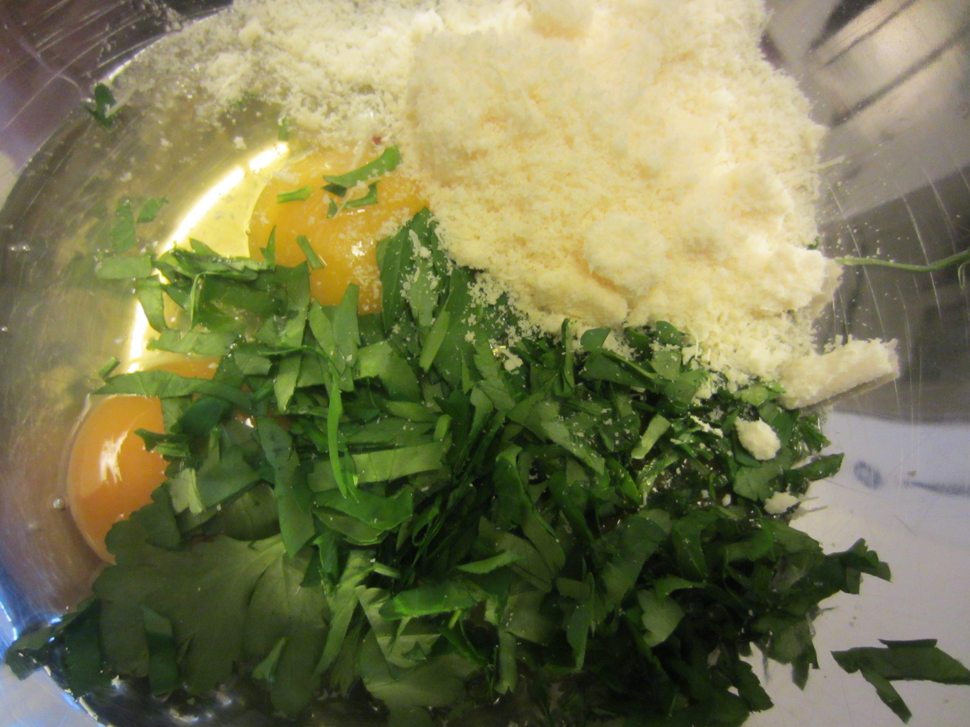 First, beat the eggs with 2/3 of grated parmesan cheese, and add the parsley, coarsely chopped (I cut it with kitchen scissors).