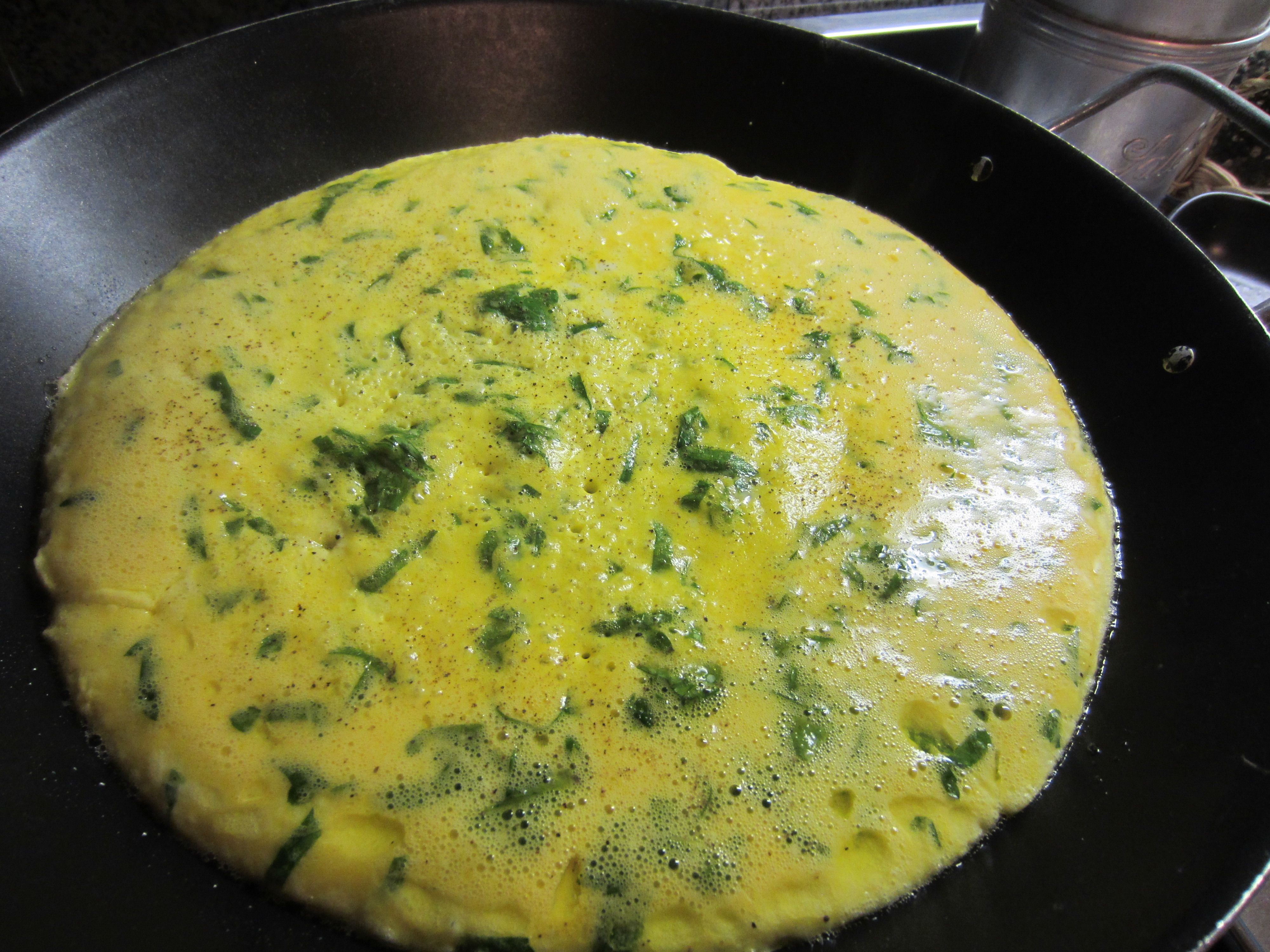 Grease very little with a tablespoon of extra virgin olive oil a large non-stick pan and when the oil is hot, pour the beated eggs. Cook for a few minutes only from one side so that the top remains soft and creamy.