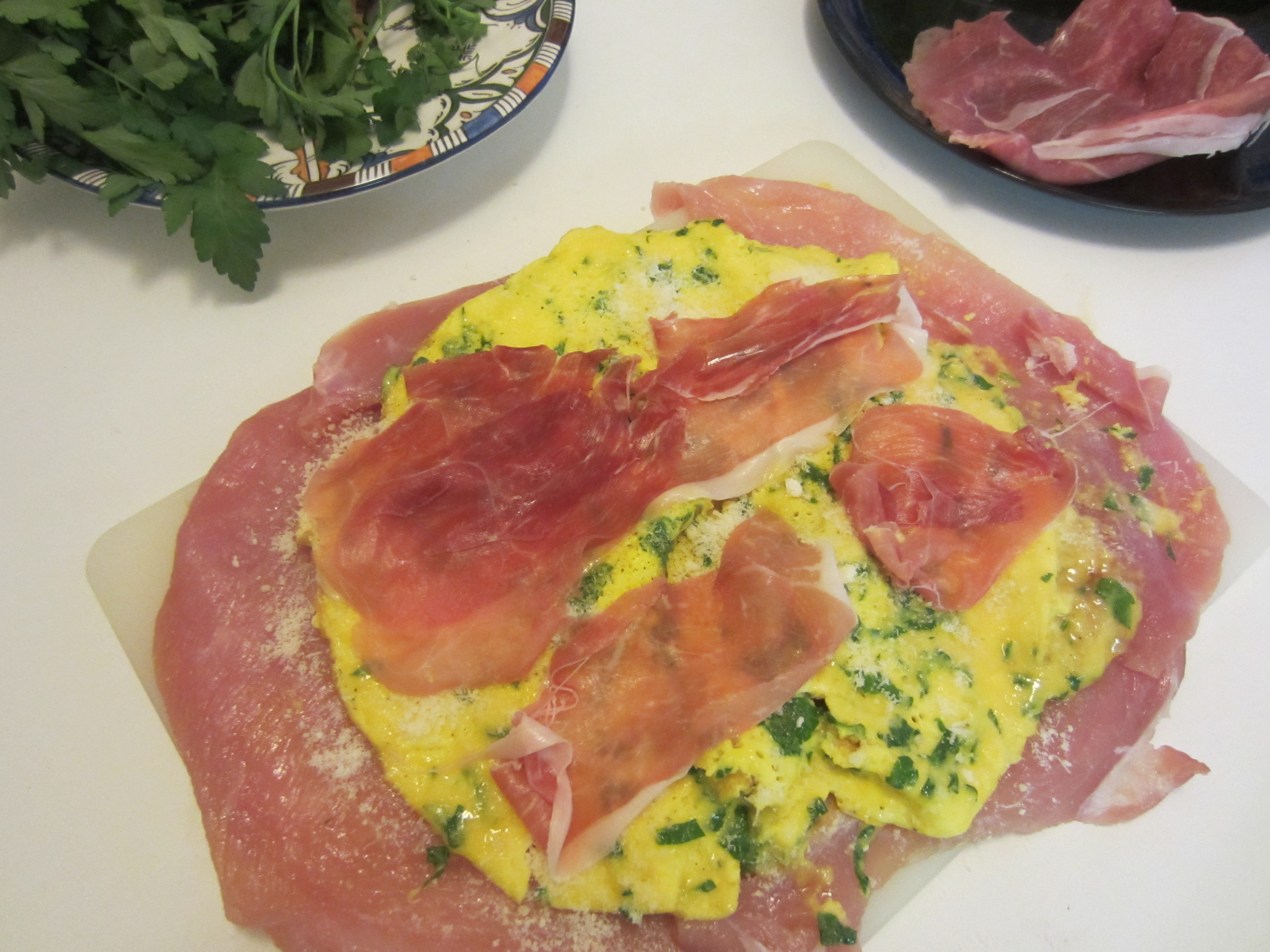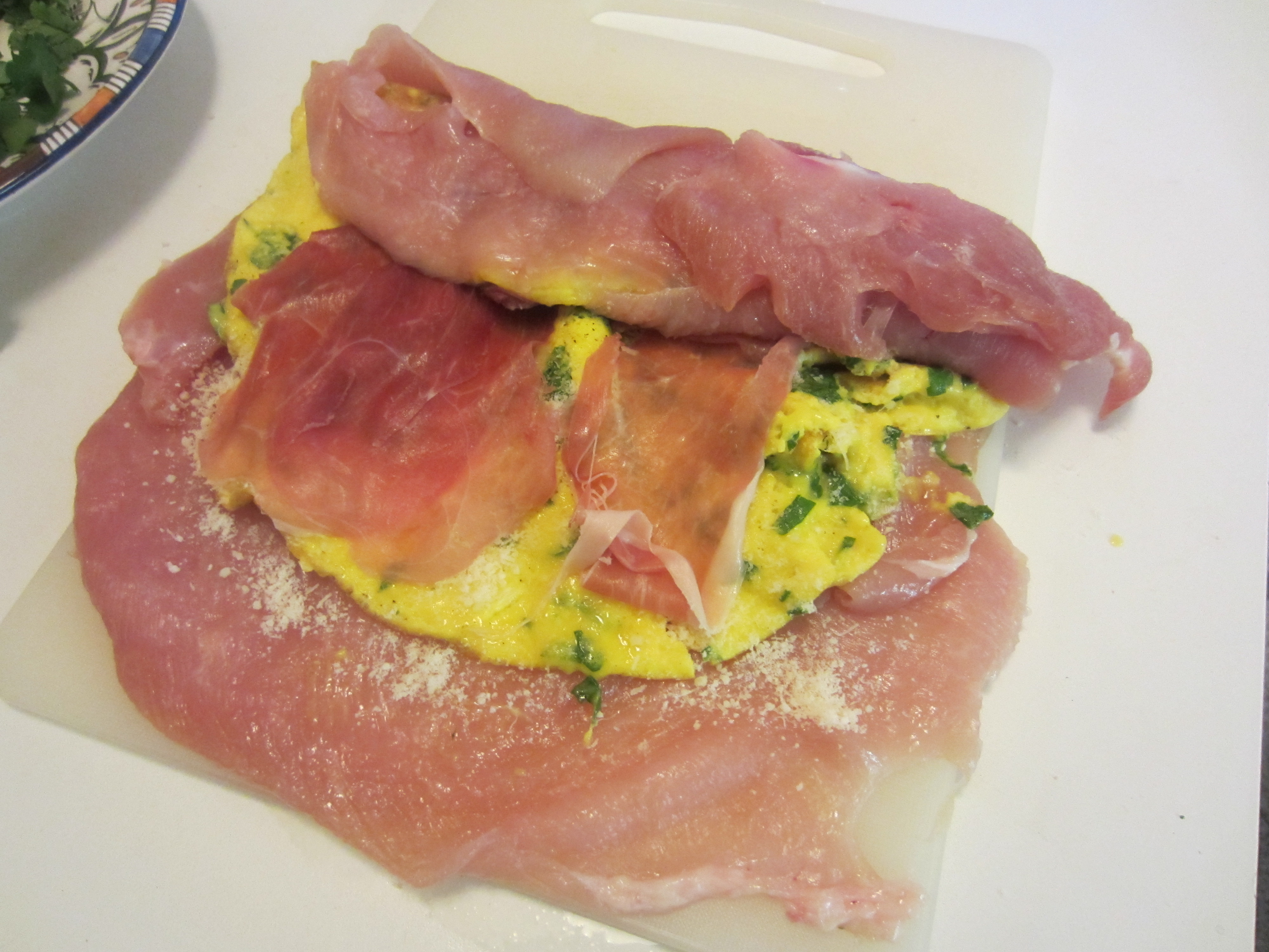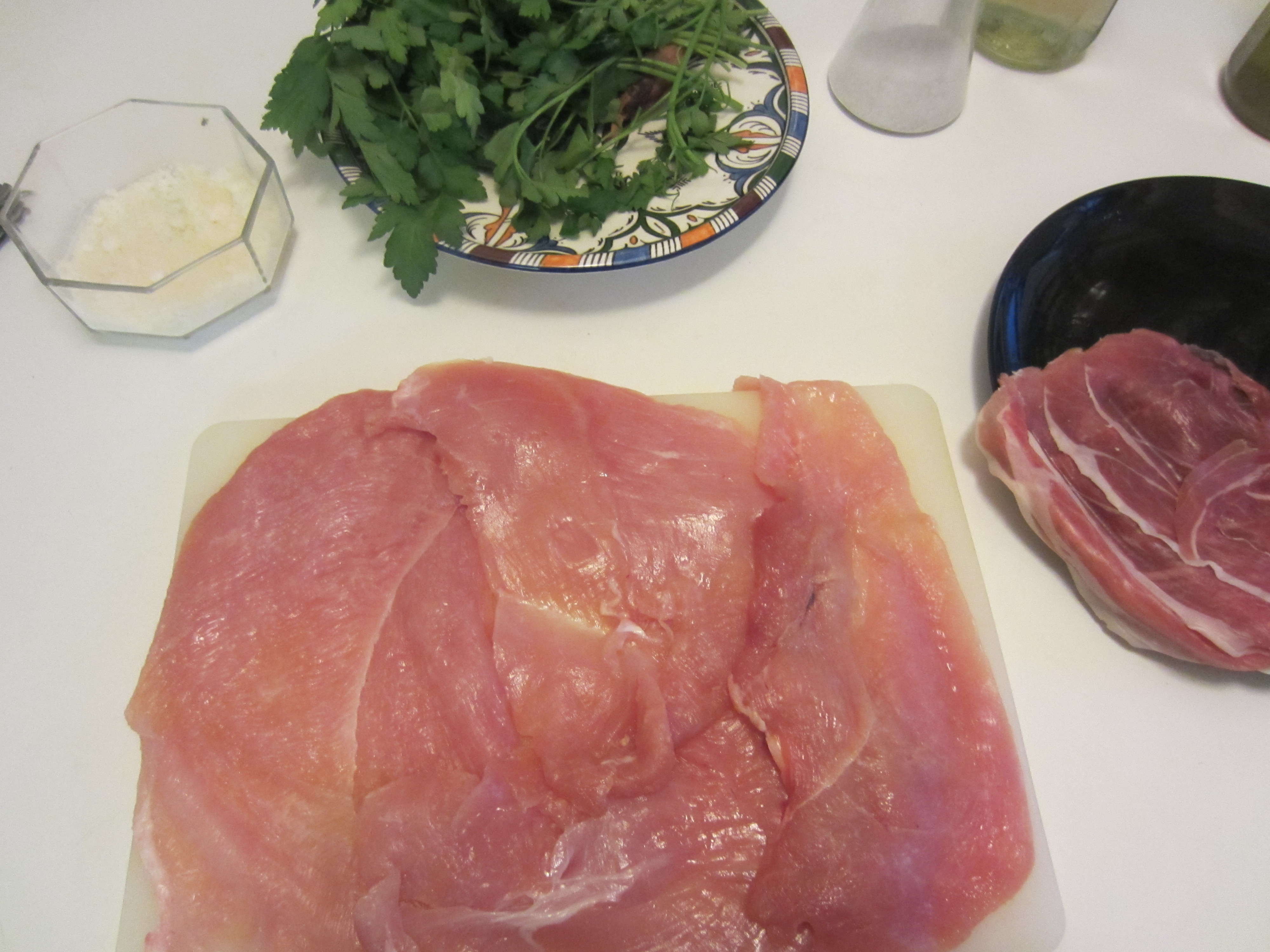6 hg chicken breast slices, 2 hg sweet raw ham, 4 eggs, 150 grams of grated parmesan cheese, 20 grams of chopped parsley, 2 glasses of white wine, 4 tablespoons of extra virgin olive oil, a glass of milk, a bit of grated pepper, kitchen wire.