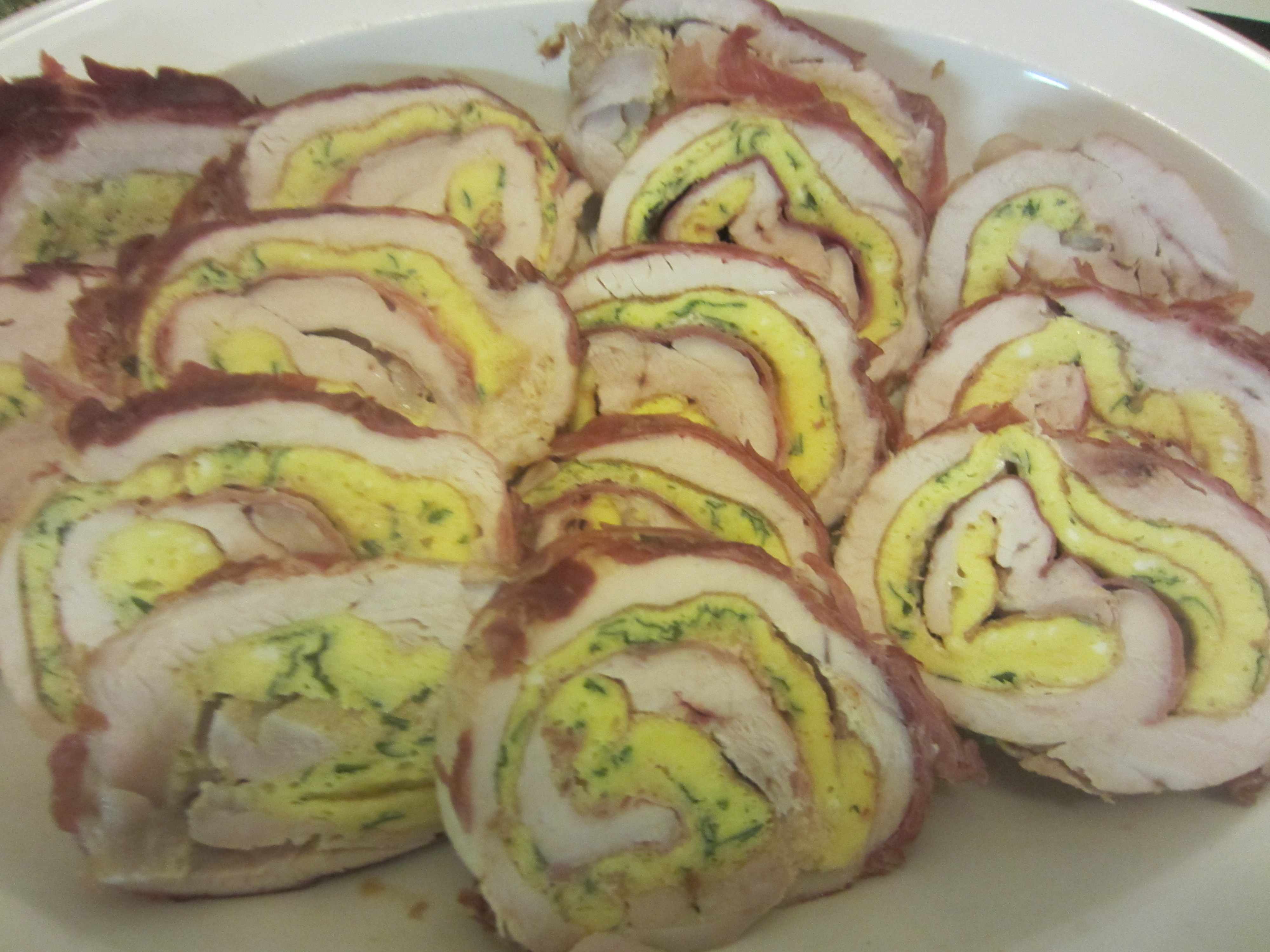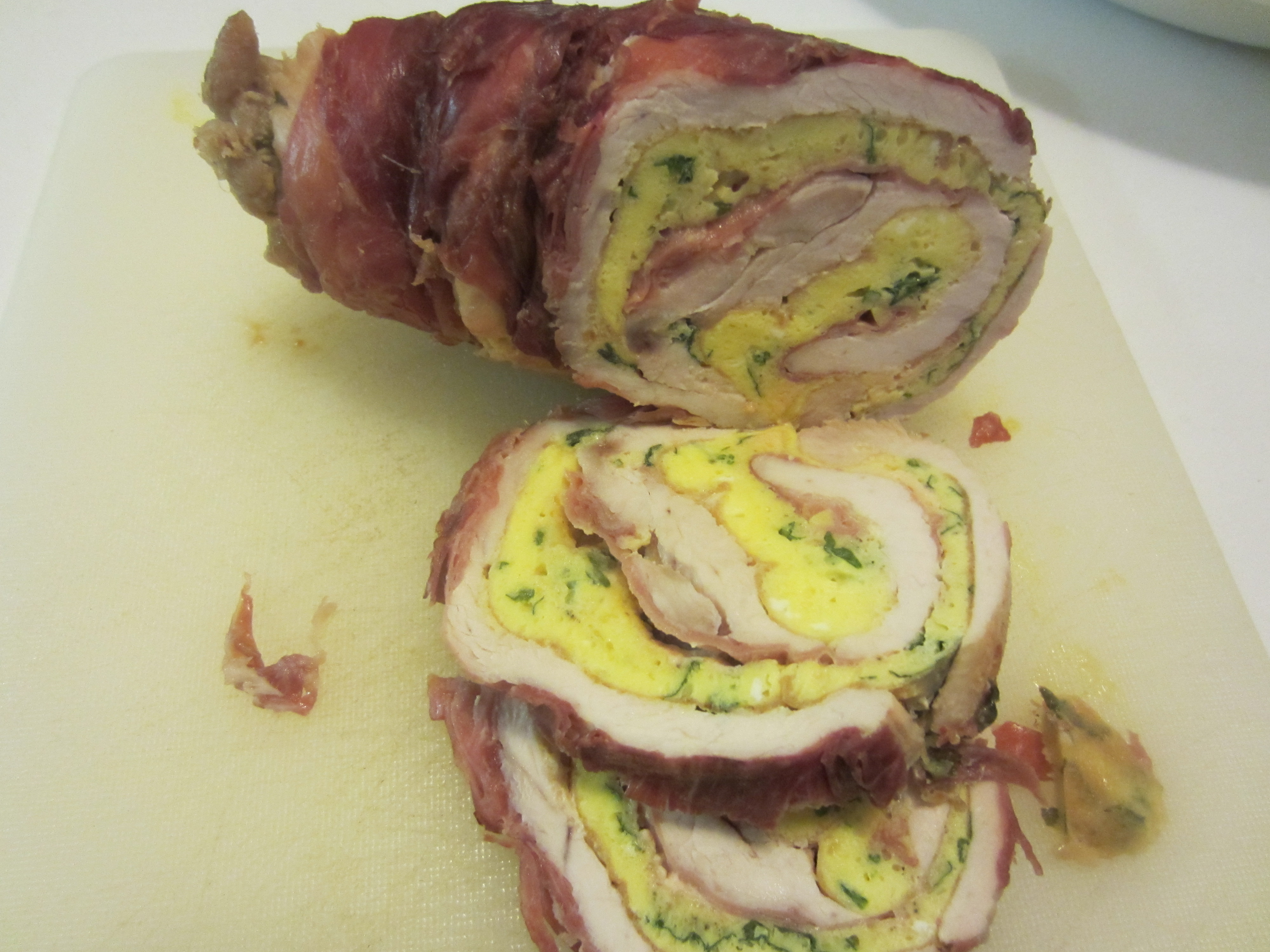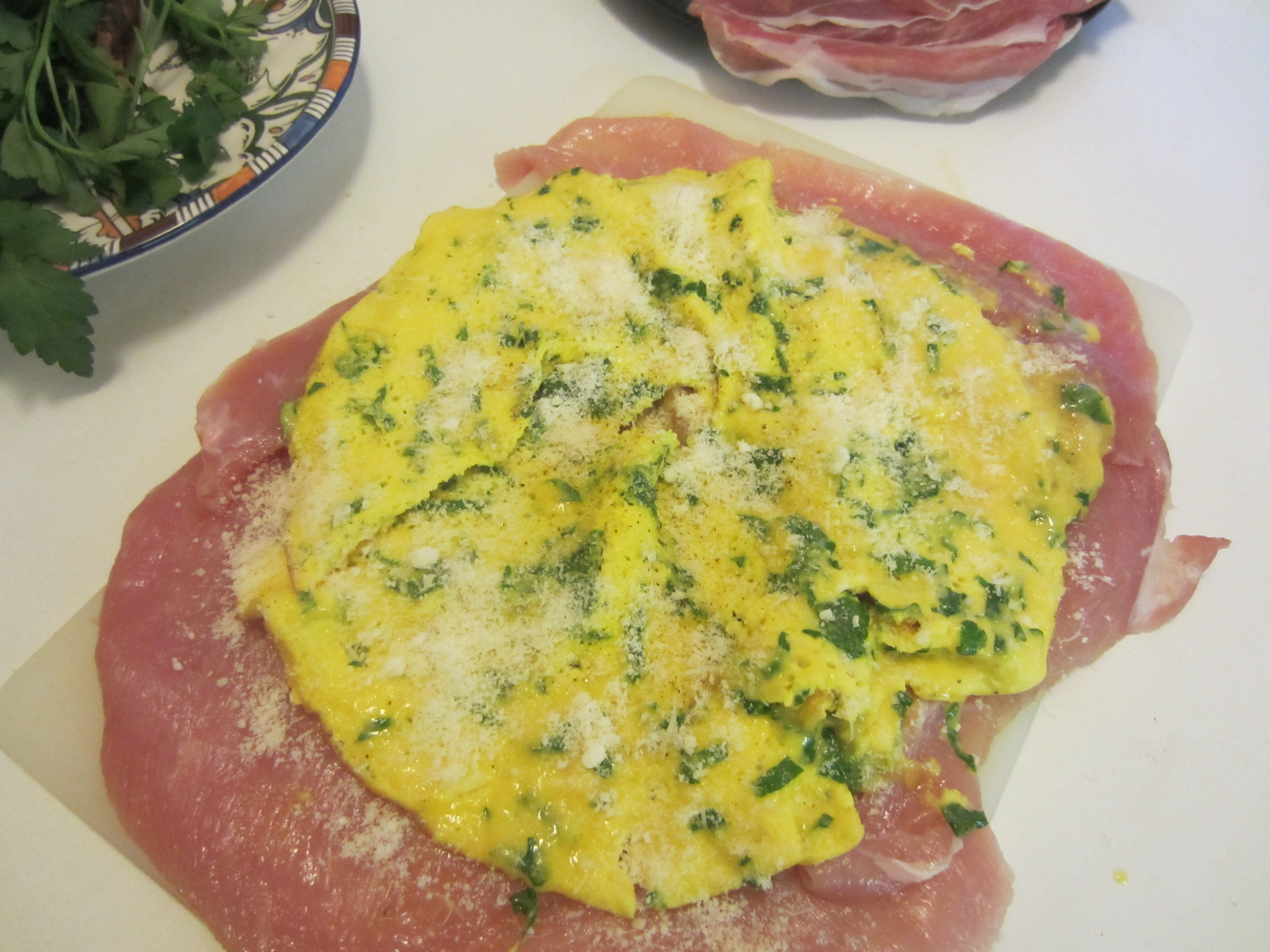6 hg chicken breast slices, 2 hg sweet raw ham, 4 eggs, 150 grams of grated parmesan cheese, 20 grams of chopped parsley, 2 glasses of white wine, 4 tablespoons of extra virgin olive oil, a glass of milk, a bit of grated pepper, kitchen wire.