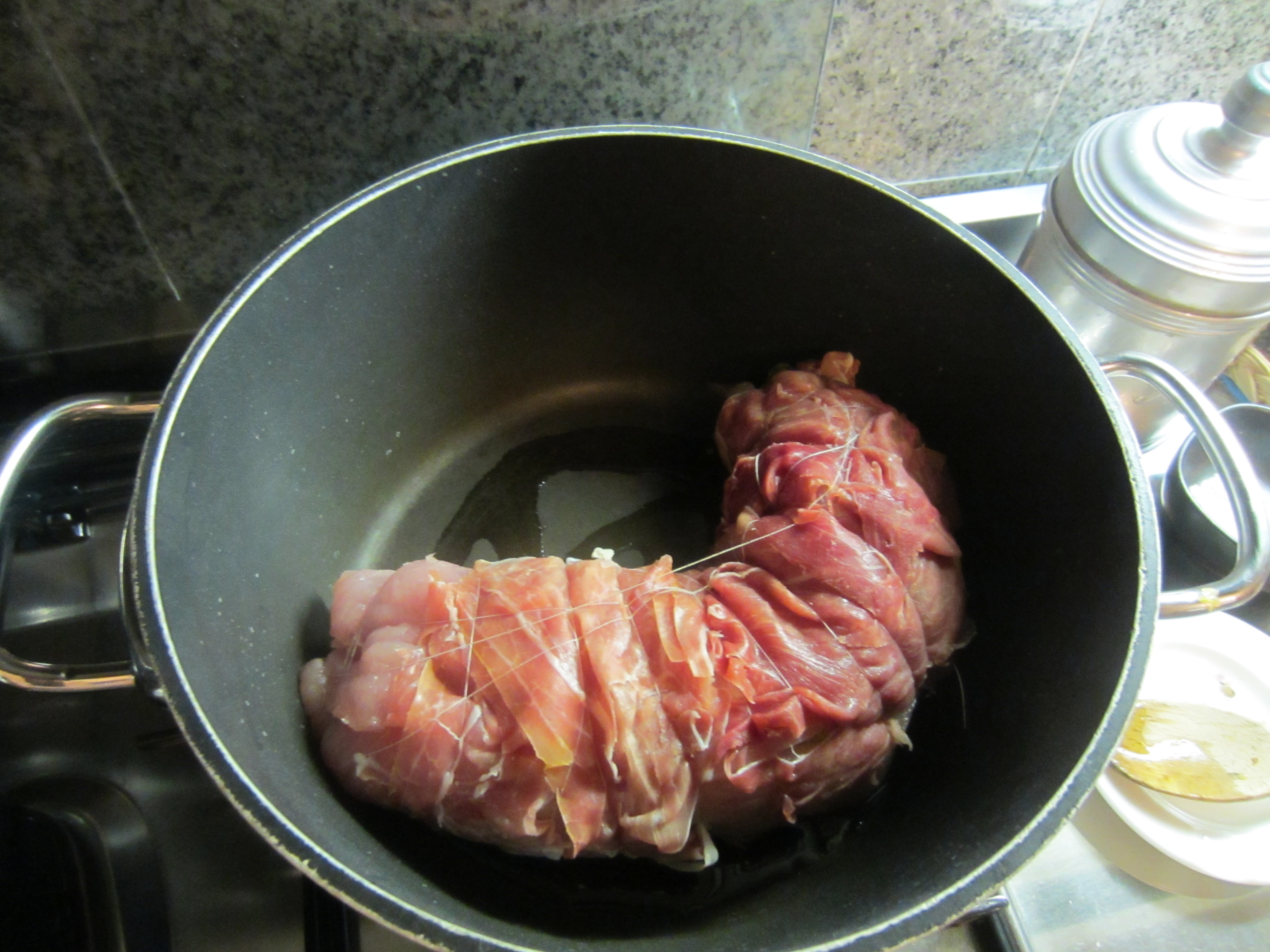 Put the rest of the olive oil in a nonstick pan, and fry over medium heat briefly the roulade on all sides, then add 2 glasses of dry white wine and 2 glasses of water. Turn down the heat, put the lid on and simmer the roulade, turning occasionally until almost all the liquid is consumed. It will take about 50-60 minutes. At this point, remove the roast from the pot, add a glass of milk and bake face to thicken and form a delicious gravy for your roast.