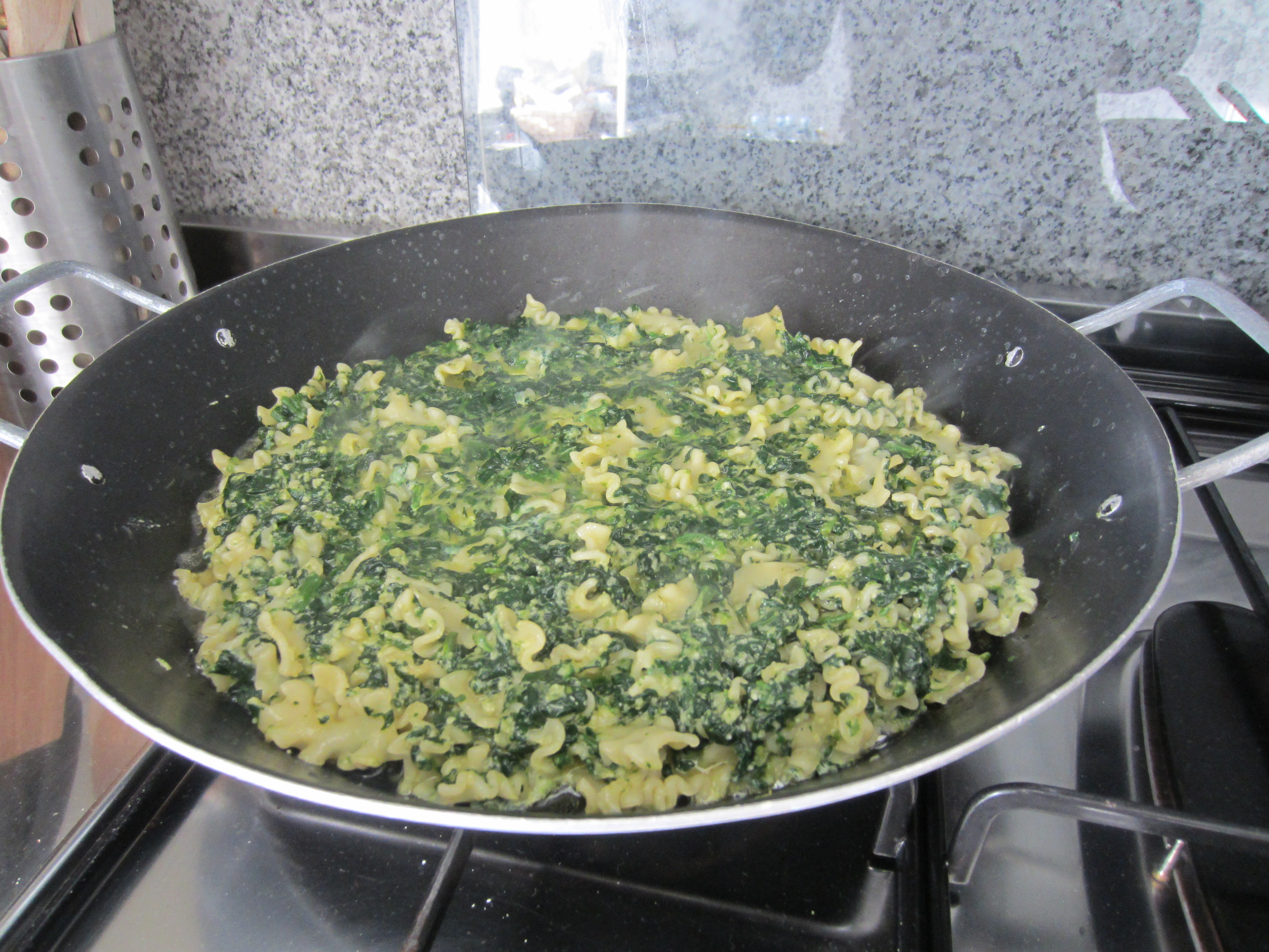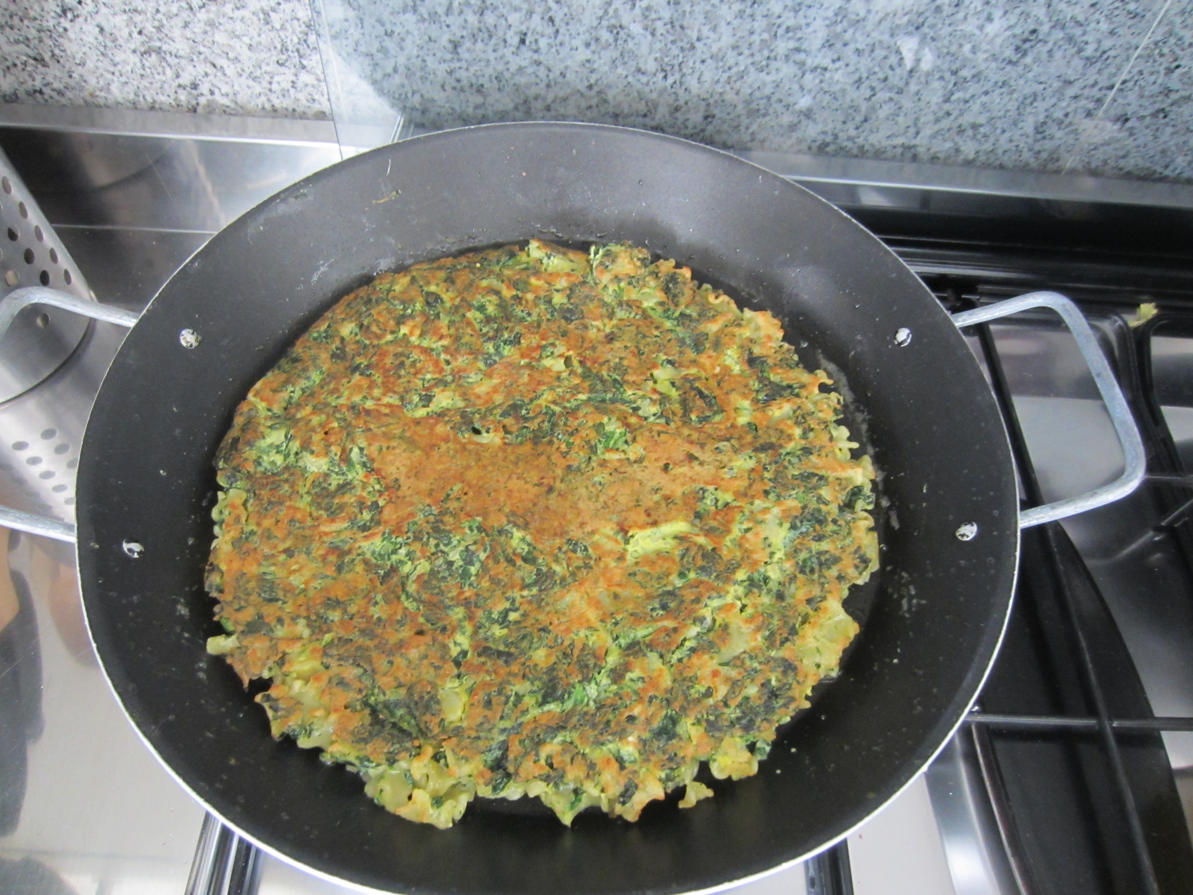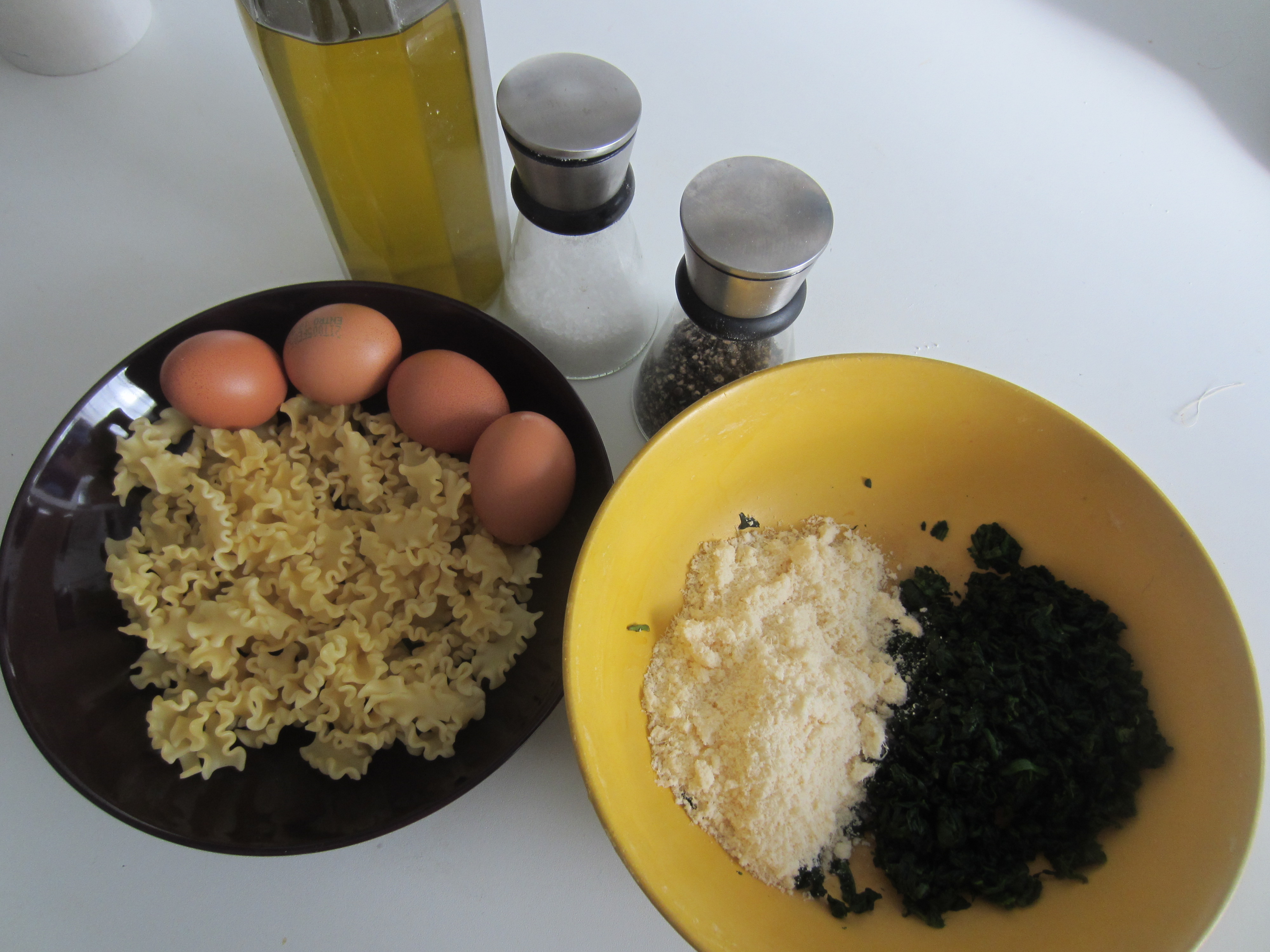 Here it is used : 1 serving of pasta salad , 4 eggs, a serving of cooked vegetables coarsely chopped (I used spinach) 3 tablespoons extra virgin olive oil , 5 or 6 tablespoons of grated Parmesan cheese . salt, pepper and some grated ginger.