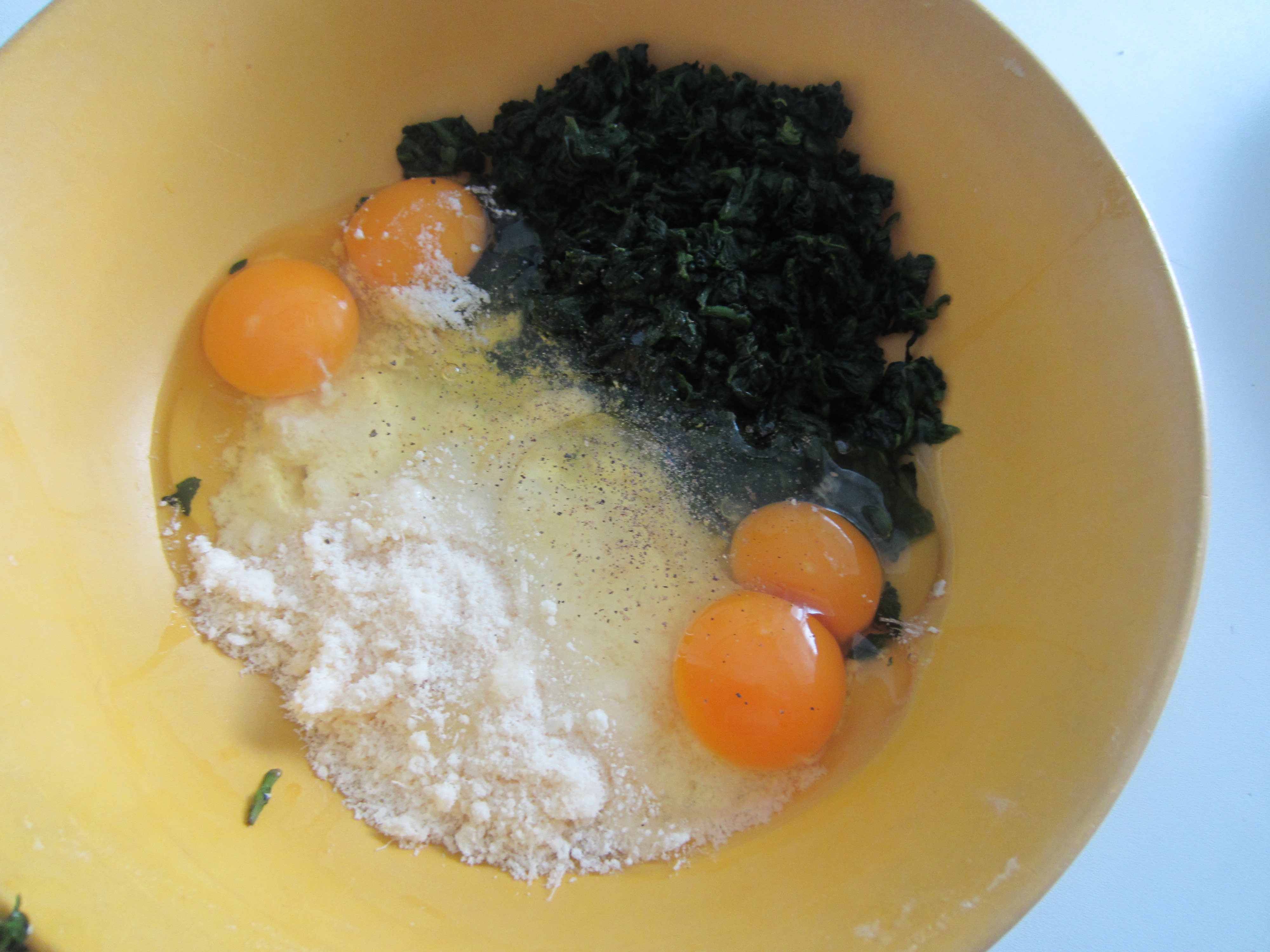 First , beat the eggs with the grated Parmesan cheese , a pinch of salt, the spinach, a little ‘pepper and a bit ‘ of ground ginger if you like .