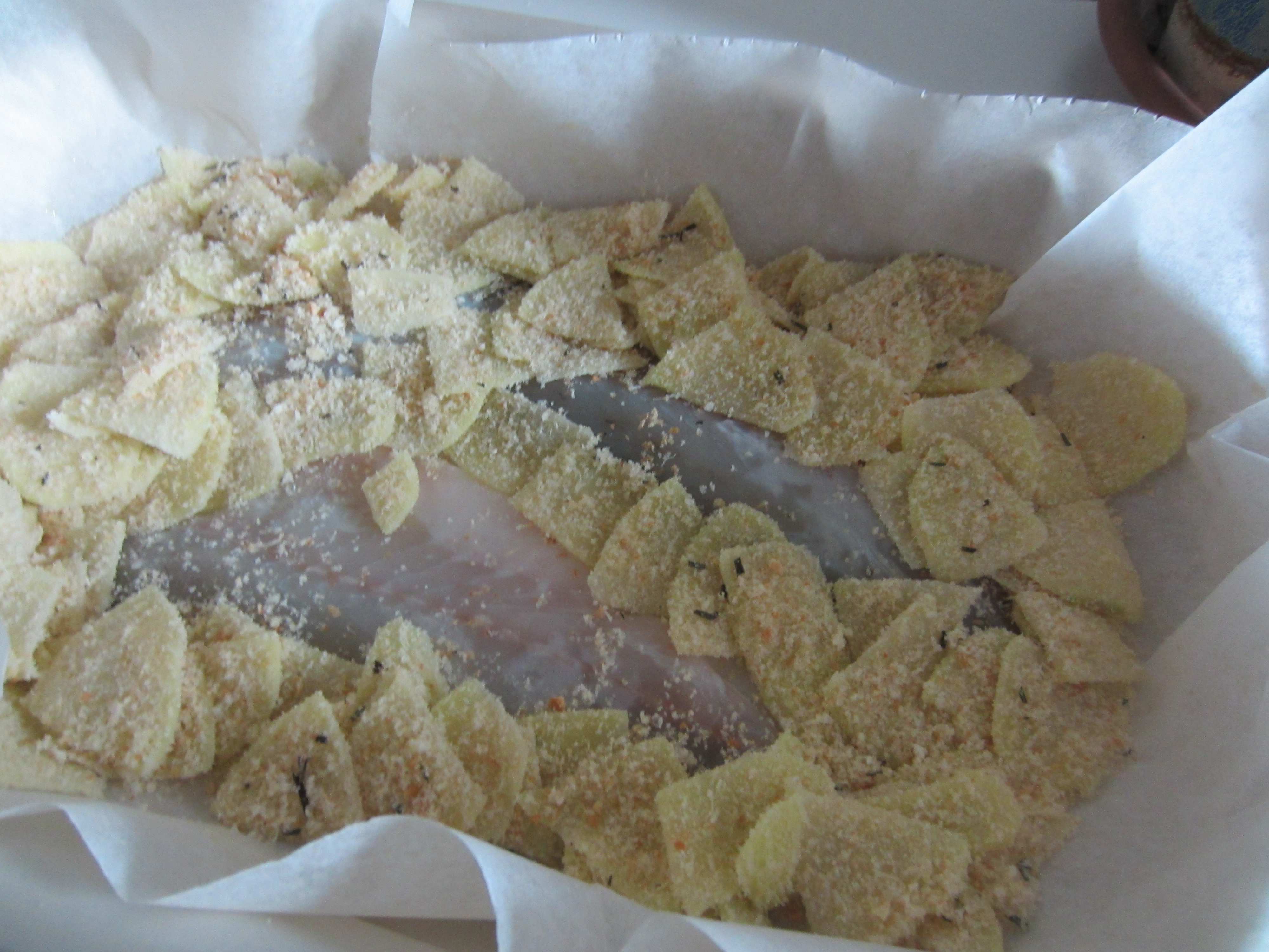 Here’s what you need for each serving: 1 bream barbed filet , 1 medium potato peeled and cut into very thin slices , 2 table spoons of bread crumbs , 1 tablespoon grated Parmesan cheese , 2/ 3 tablespoons of extra virgin olive oil , 1 pinch of rosemary well chopped 1 teaspoon of lemon juice , salt end , grated ginger These will be multiplied by the number of diners . When I cooking this recipe we were 3 ! First of all, turn the oven to 170 degrees.
