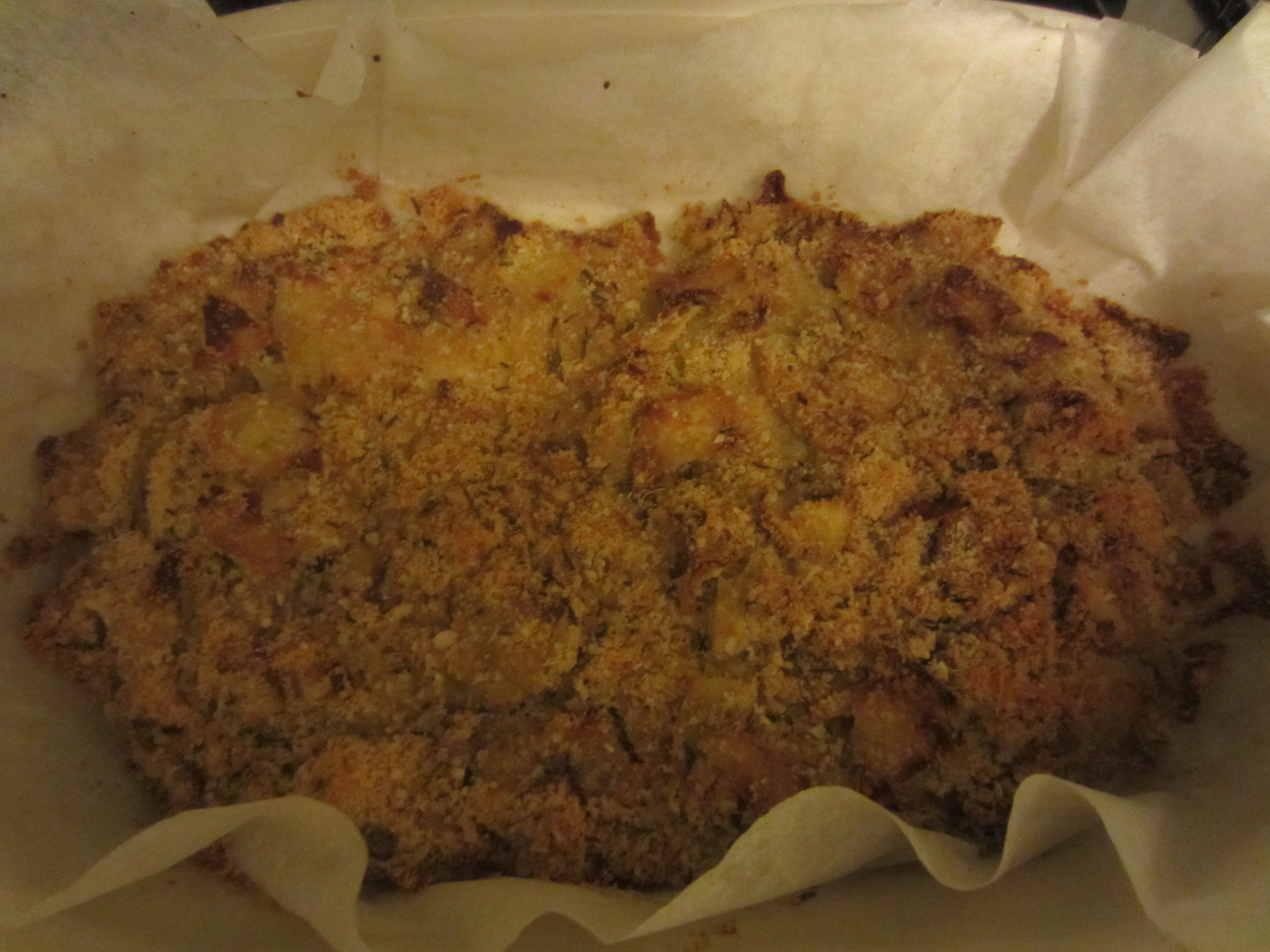 At this point you begin to cover it well with the sliced potatoes. Once you have covered all the fish and well distributed all potatoes slices to form a nice crust even, if you advance the compound to distribute it over the breadcrumbs . Drizzle with a little ‘oil and bake.