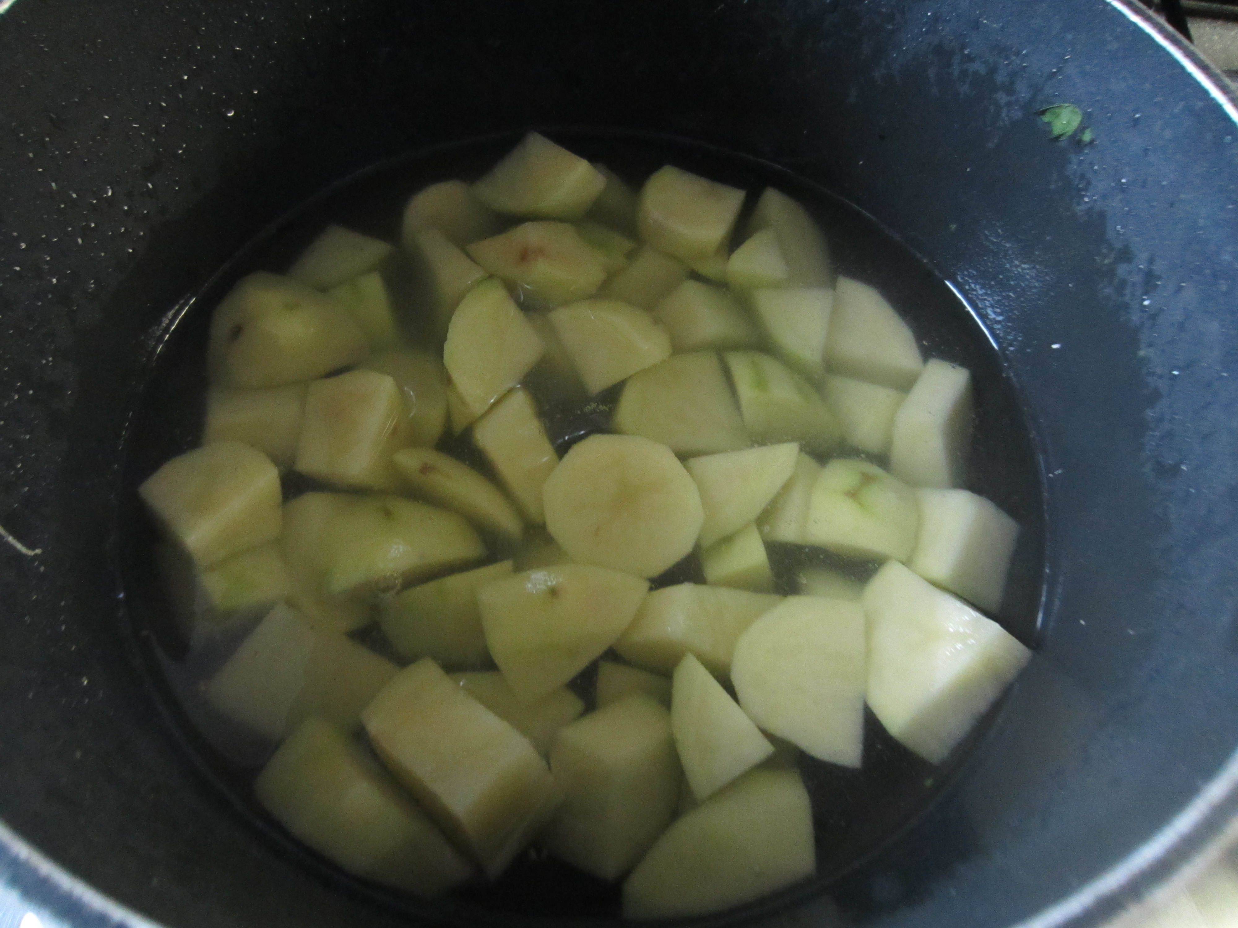 In the meantime, peel the potatoes, cut into small pieces , put in a pot with water , add salt and bring to a boil . While octopus and potatoes are cooking, prepare the seasoning.