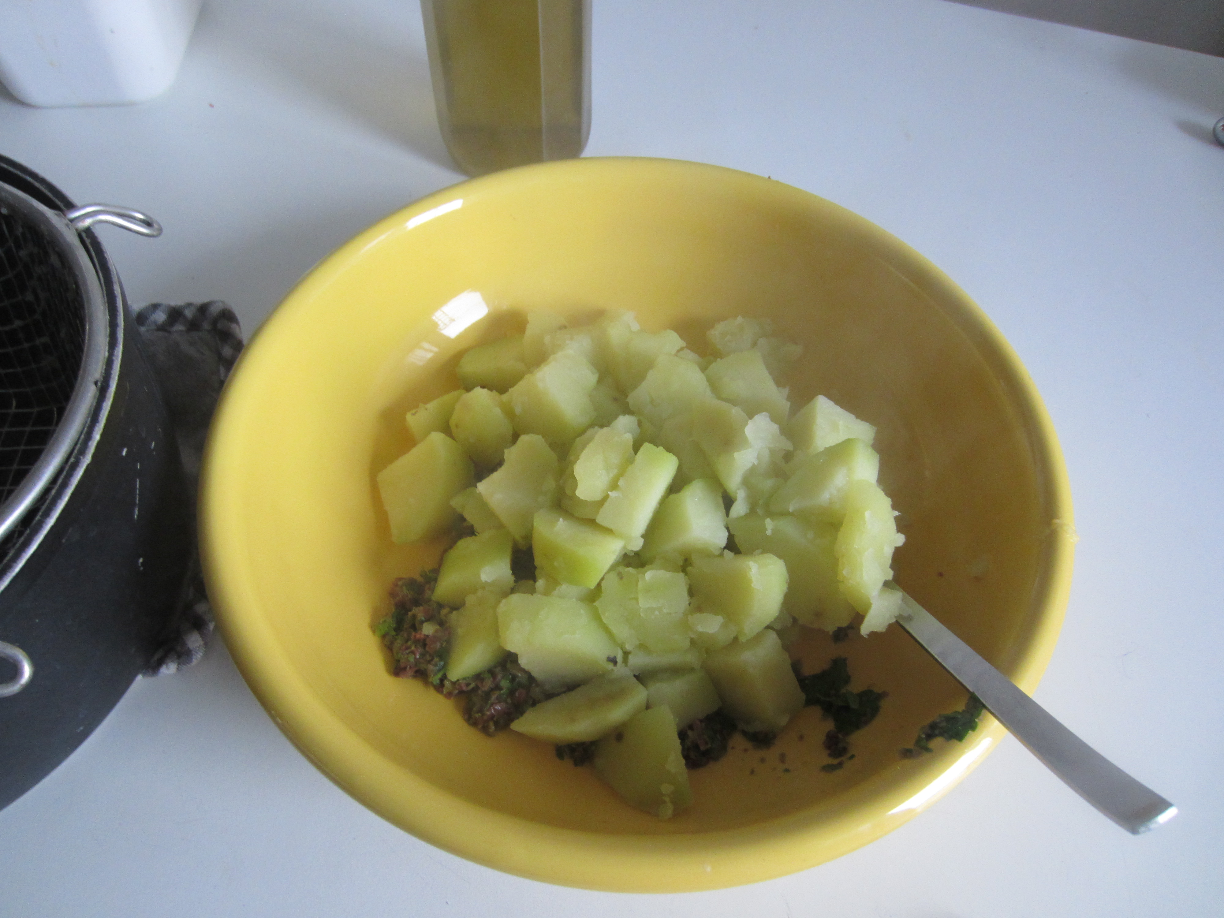 Just know baked potatoes are soft but not fulfilled, drain and put them directly into the bowl with the sauce. Gently stir well , then add the oil : the potatoes still hot will absorbe it becoming absolutely delicious