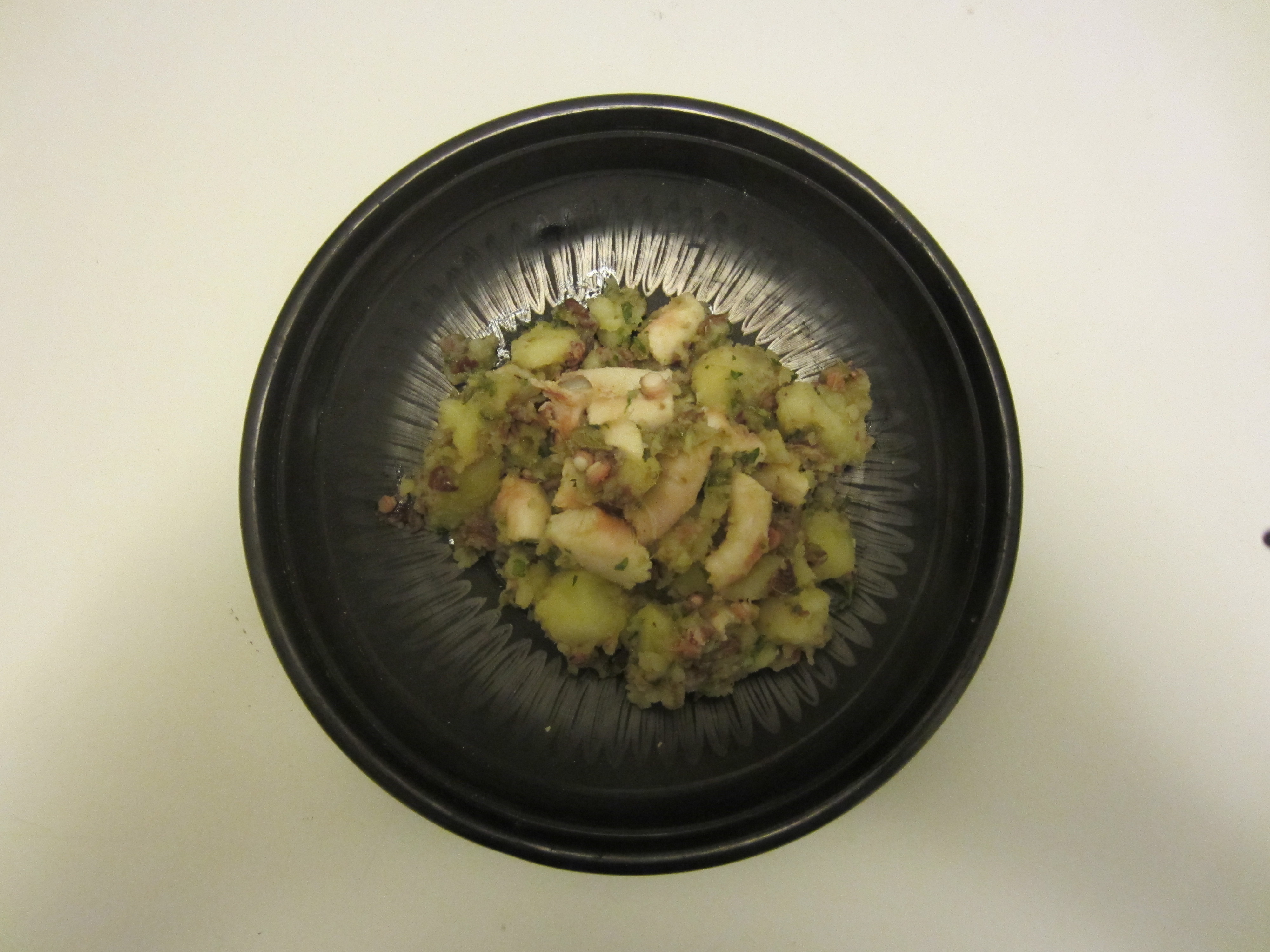about 1 kg octopus you’ve frozen at least 2 or 3 days before cooking , 1 kg of potatoes , 2 tablespoons pitted black olives 2 tablespoons brine capers , 3 tablespoons of pickled capers , half a cup of oil extra virgin olive oil , the juice of half a lemon, salt to taste and 50 grams of parsley. To cook the octopus is better to use a pressure cooker . first put the octopus still well frozen in a pressure cooker , cover with cold water , close the pressure cooker and cook for about 30 minutes to go when under pressure. Then turn off the heat and let cool in the pressure cooker.