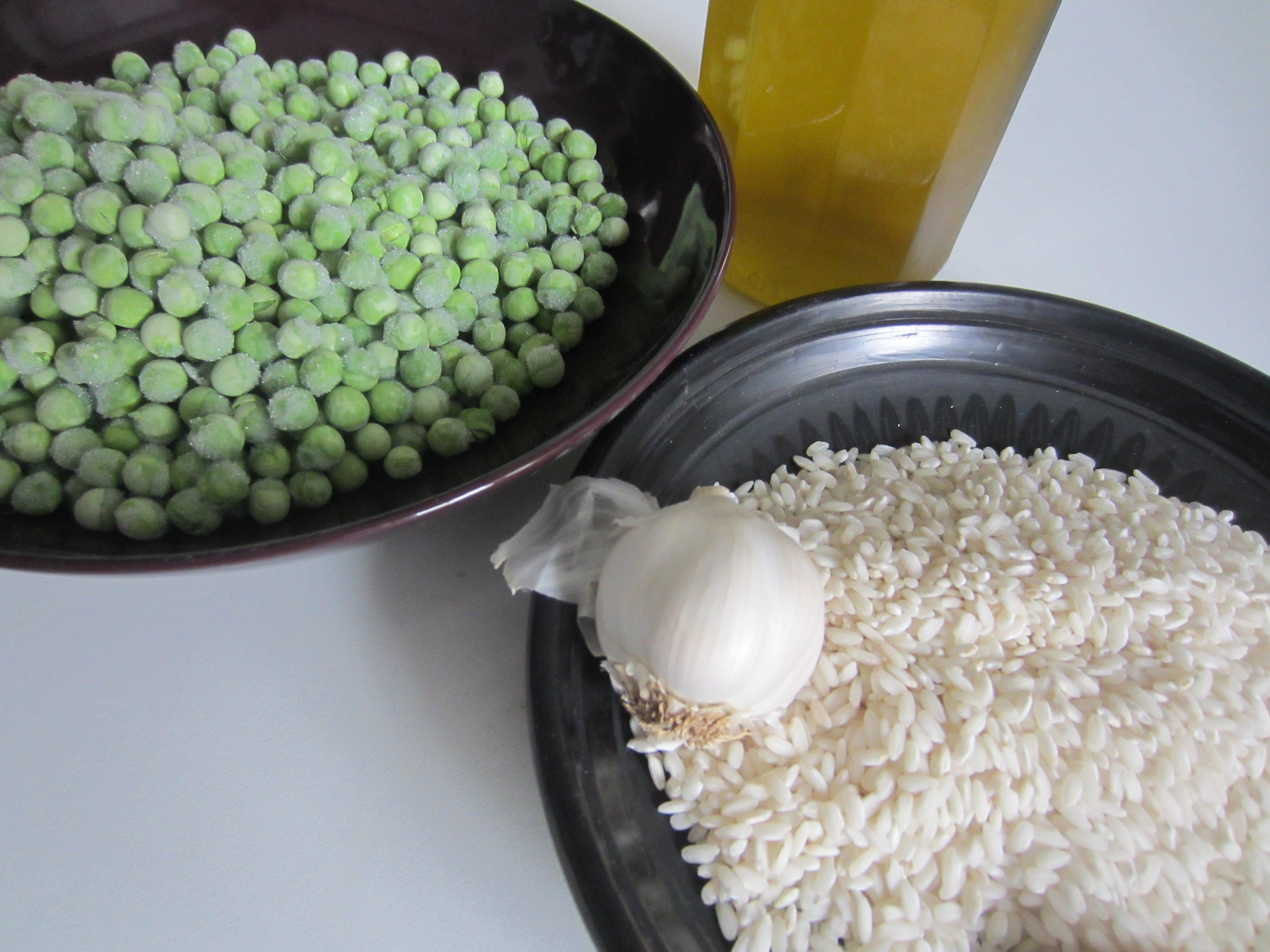 You will need: 300 grams of rice, 300 grams of peas (even frozen ones are fine) 1 peeled and sliced garlic clove, 6 tablespoons of olive oil, and salt. If you like, you can add at the end a bit of chopped parsley.