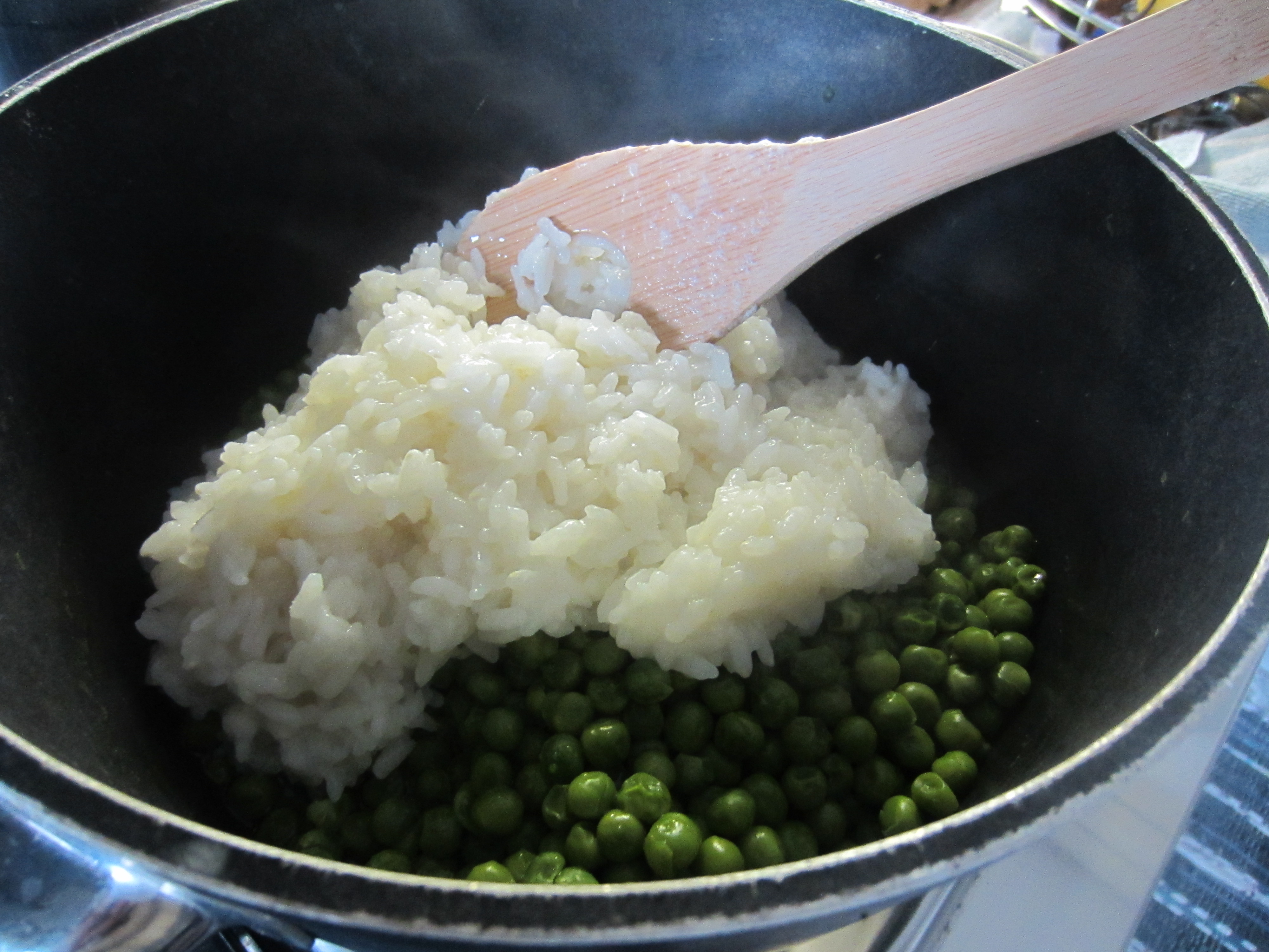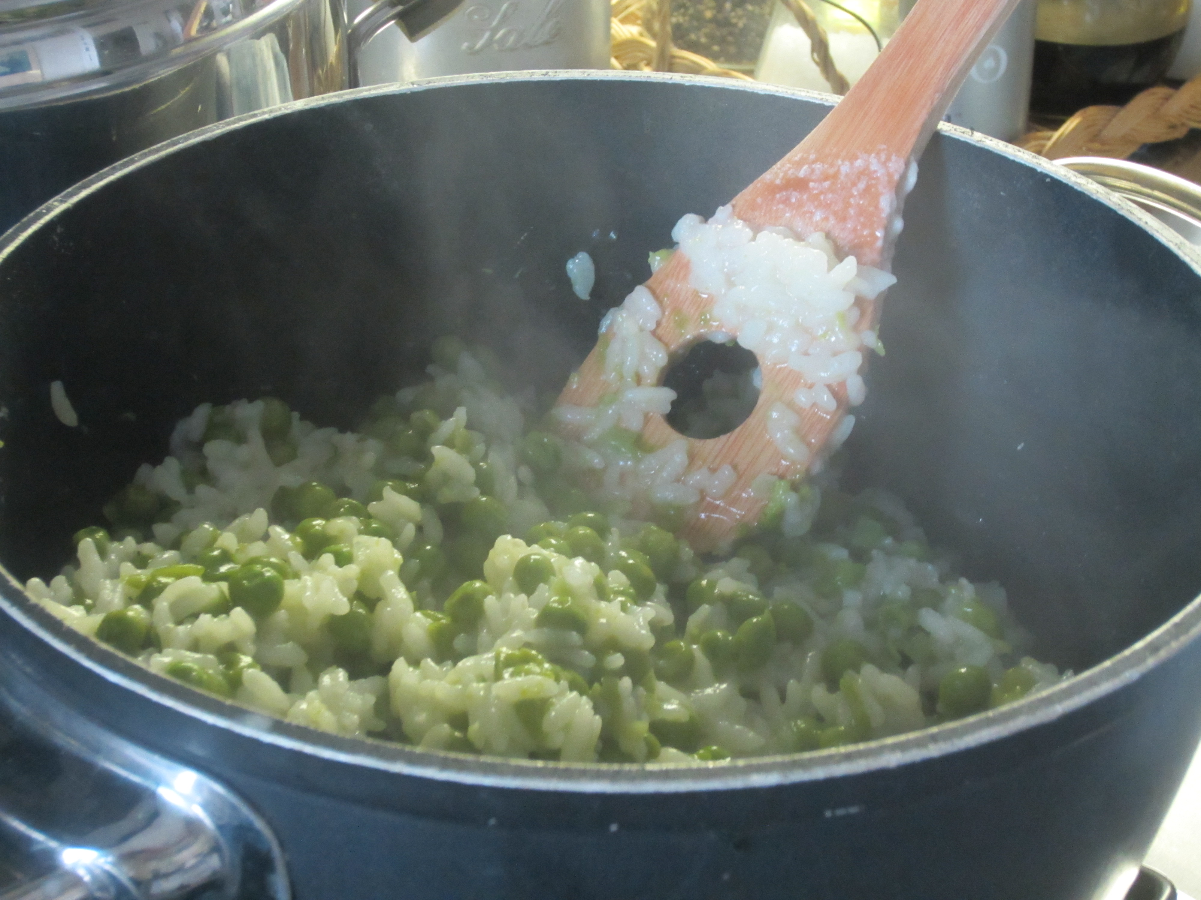The final result will be a kind of risotto with no animal fat, still creamy thanks to the starch released by the rice and thanks to the softness of the well cooked peas.