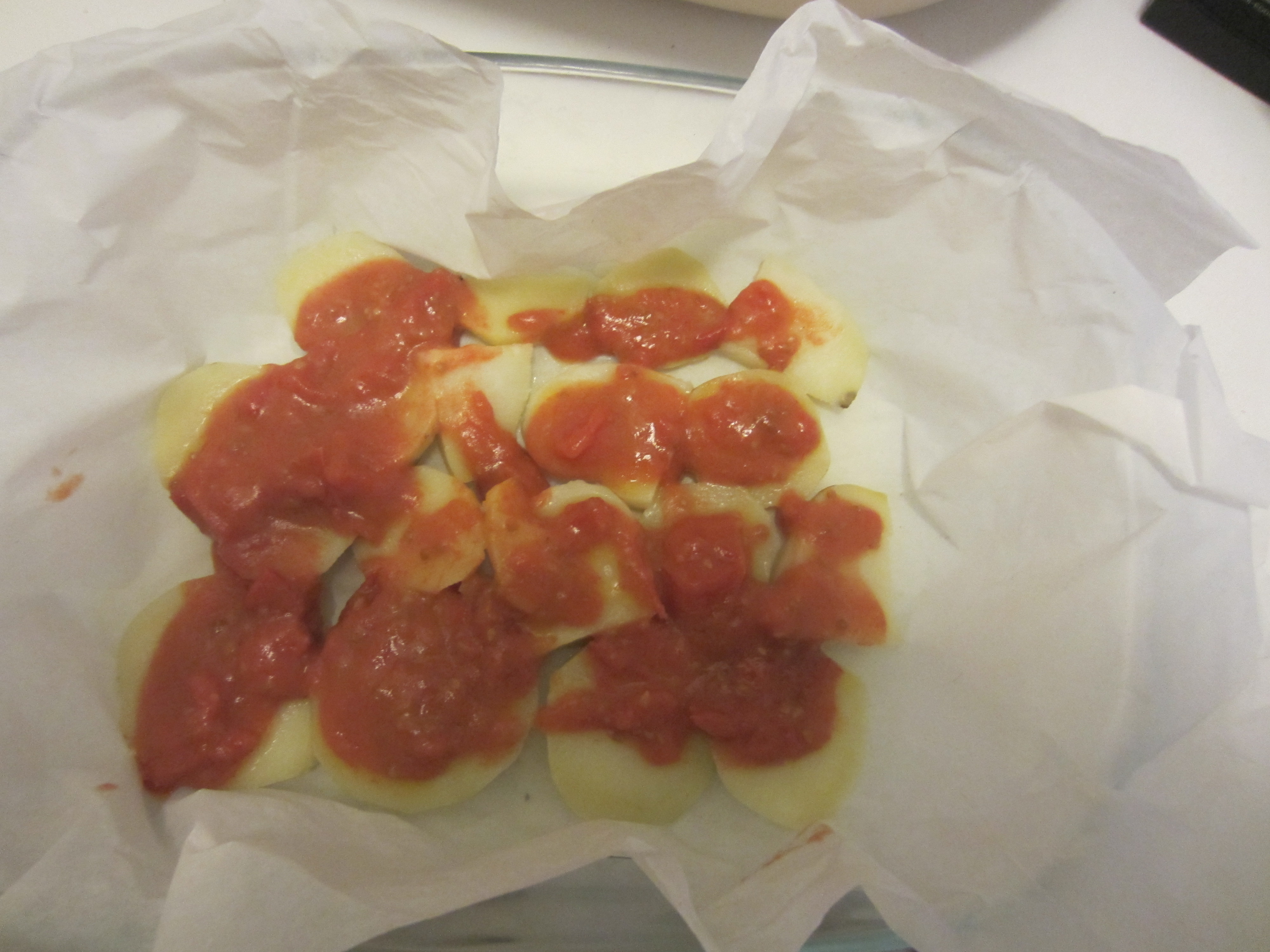 At this point add a teaspoon of tomato sauce on each slice of potato