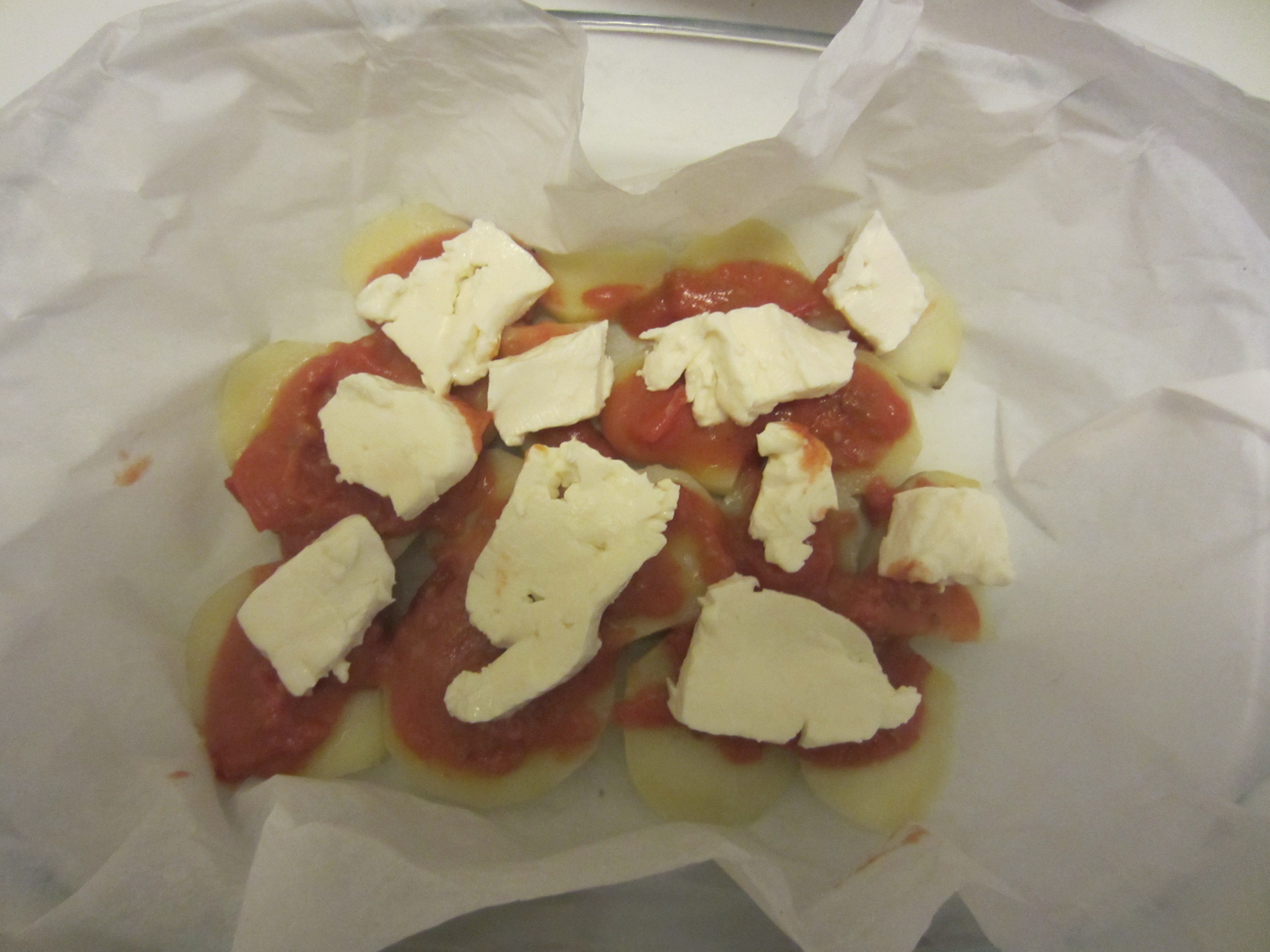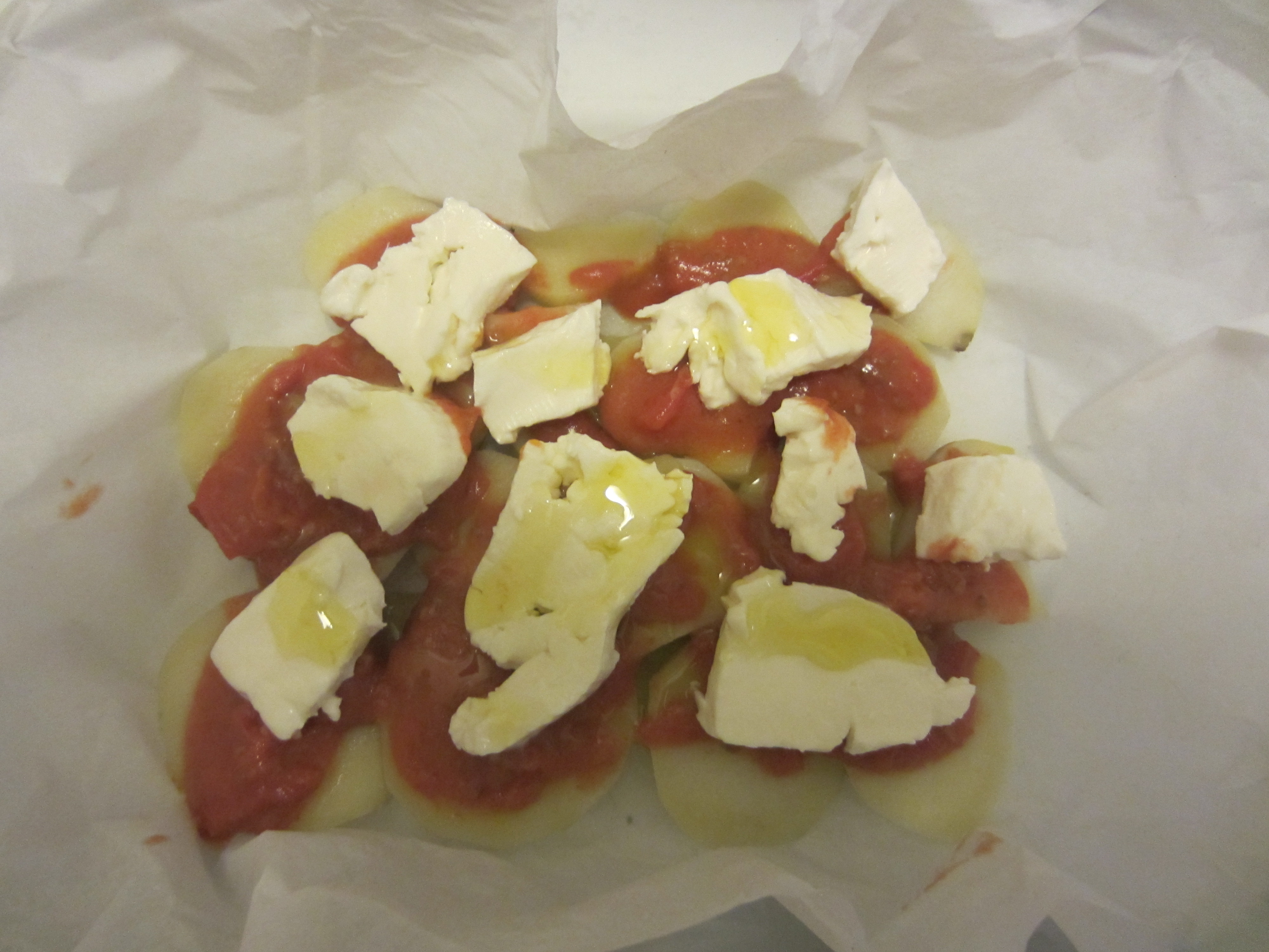 Here’s what you need: boiled potatoes (but still very firm) cut into half inch thick slices of fresh tomato sauce, plenty of oregano, mozzarella or soft cheese, salt, extra virgin olive oil, a little Parmesan