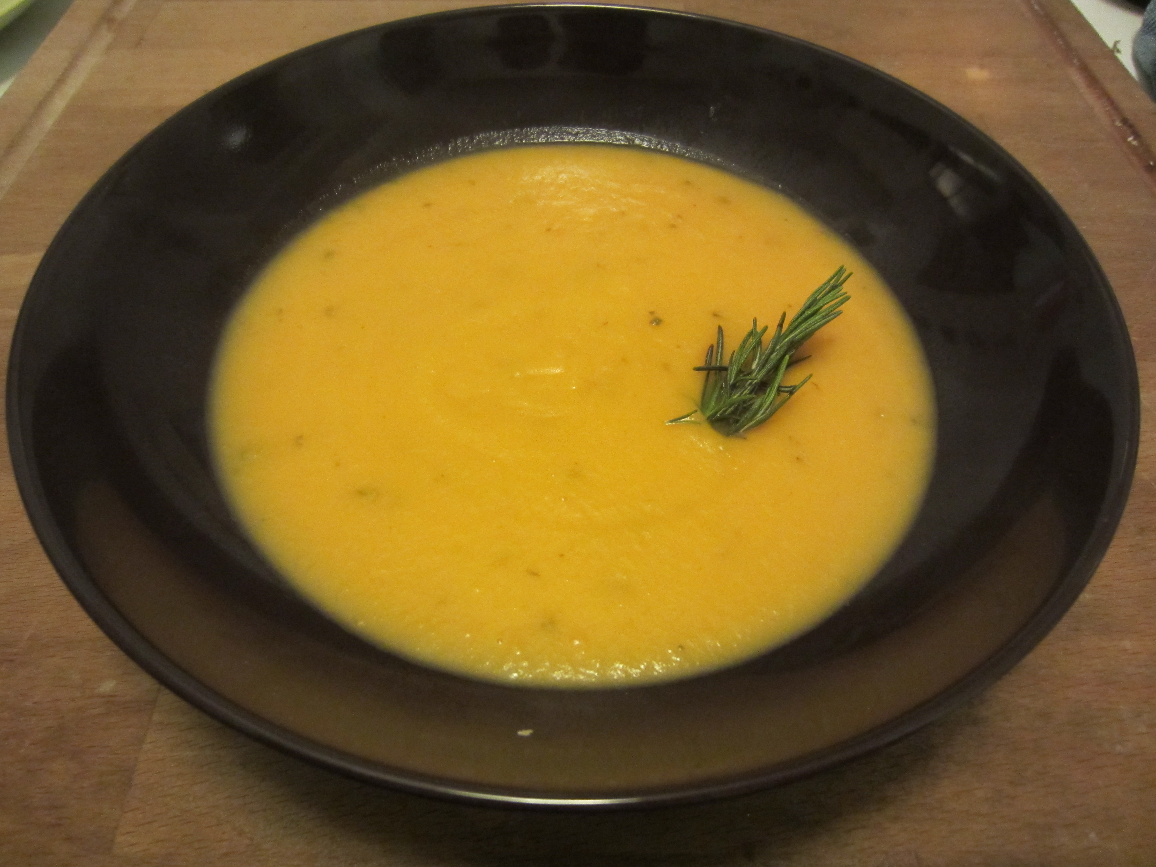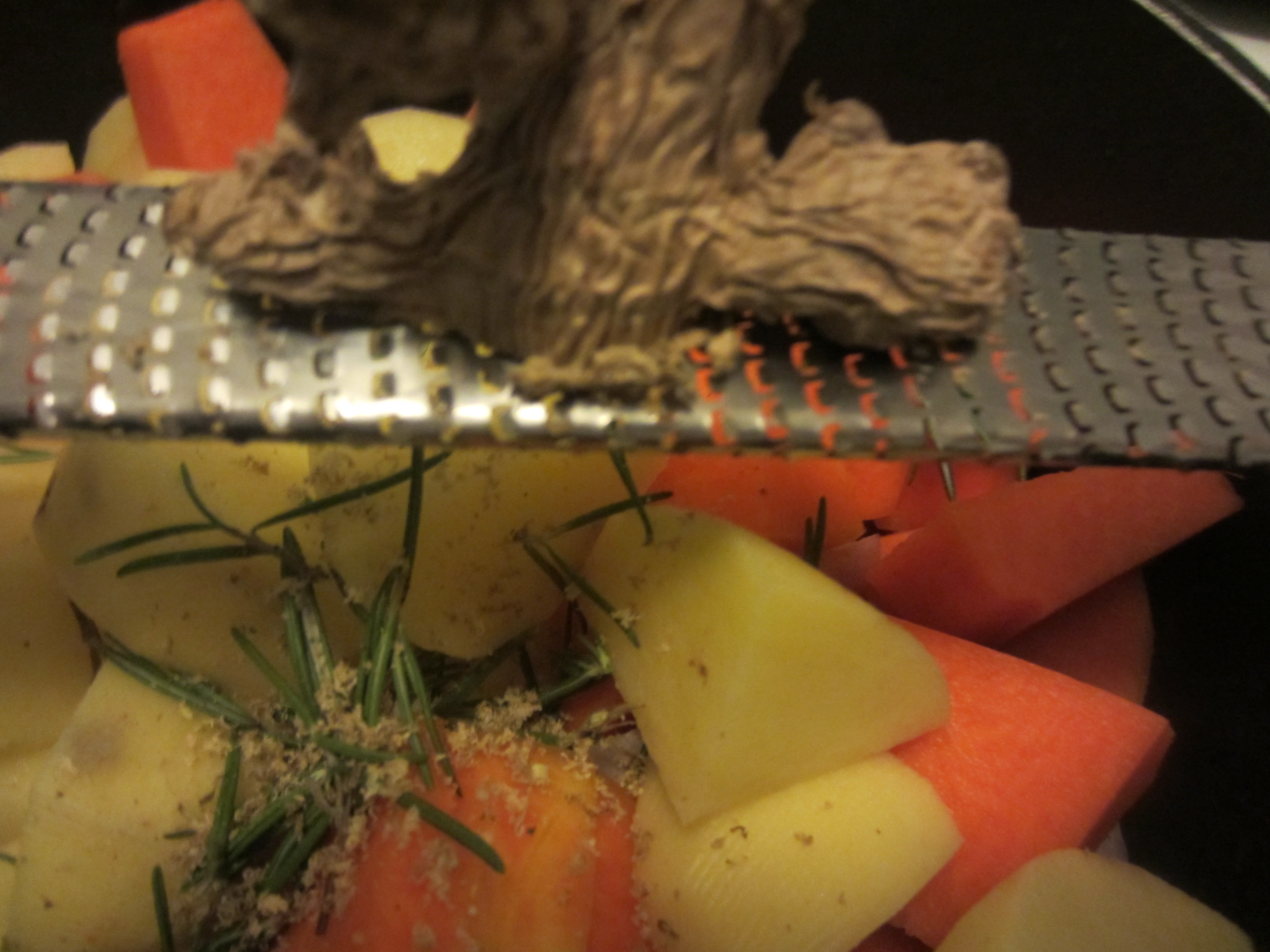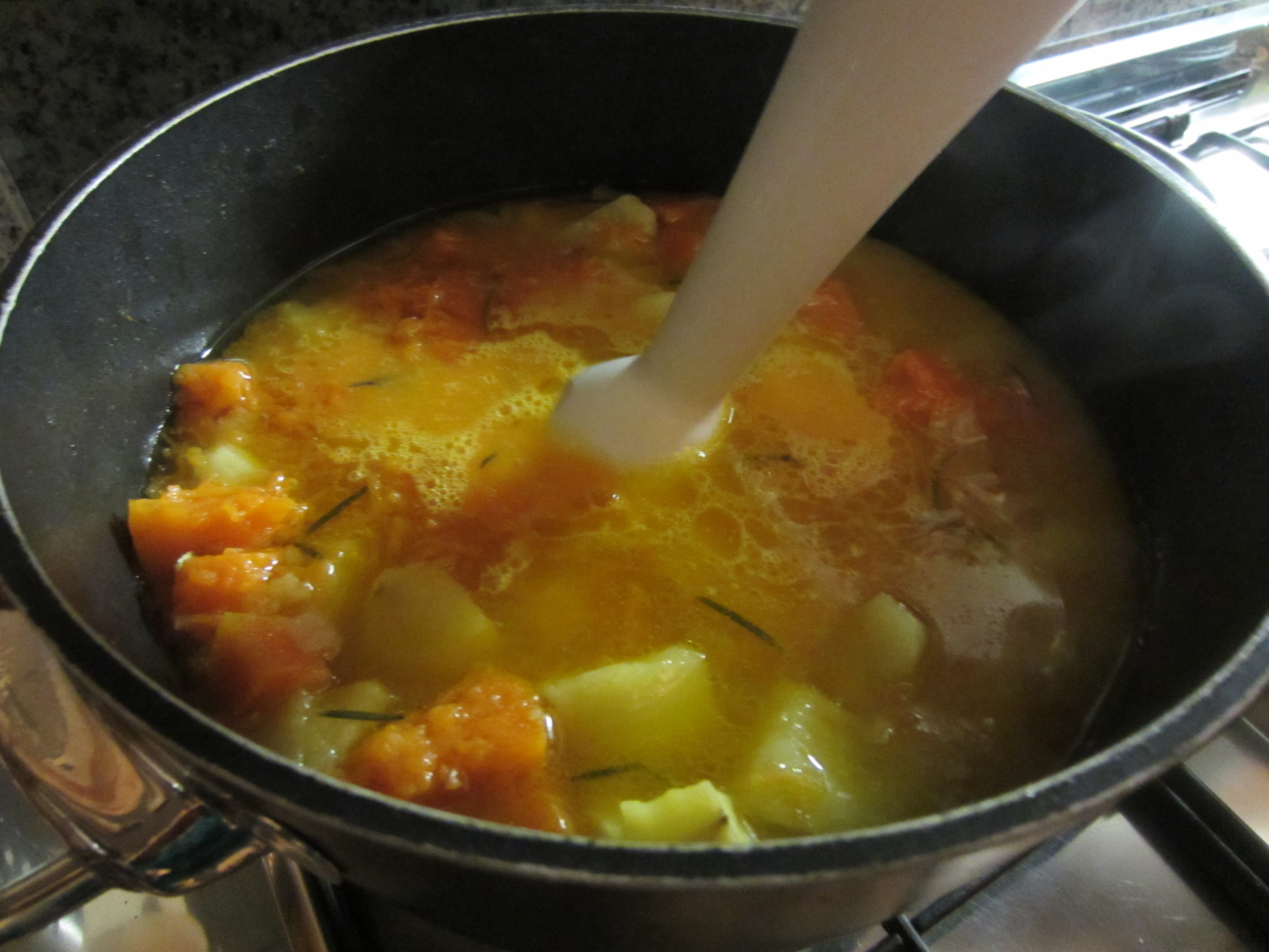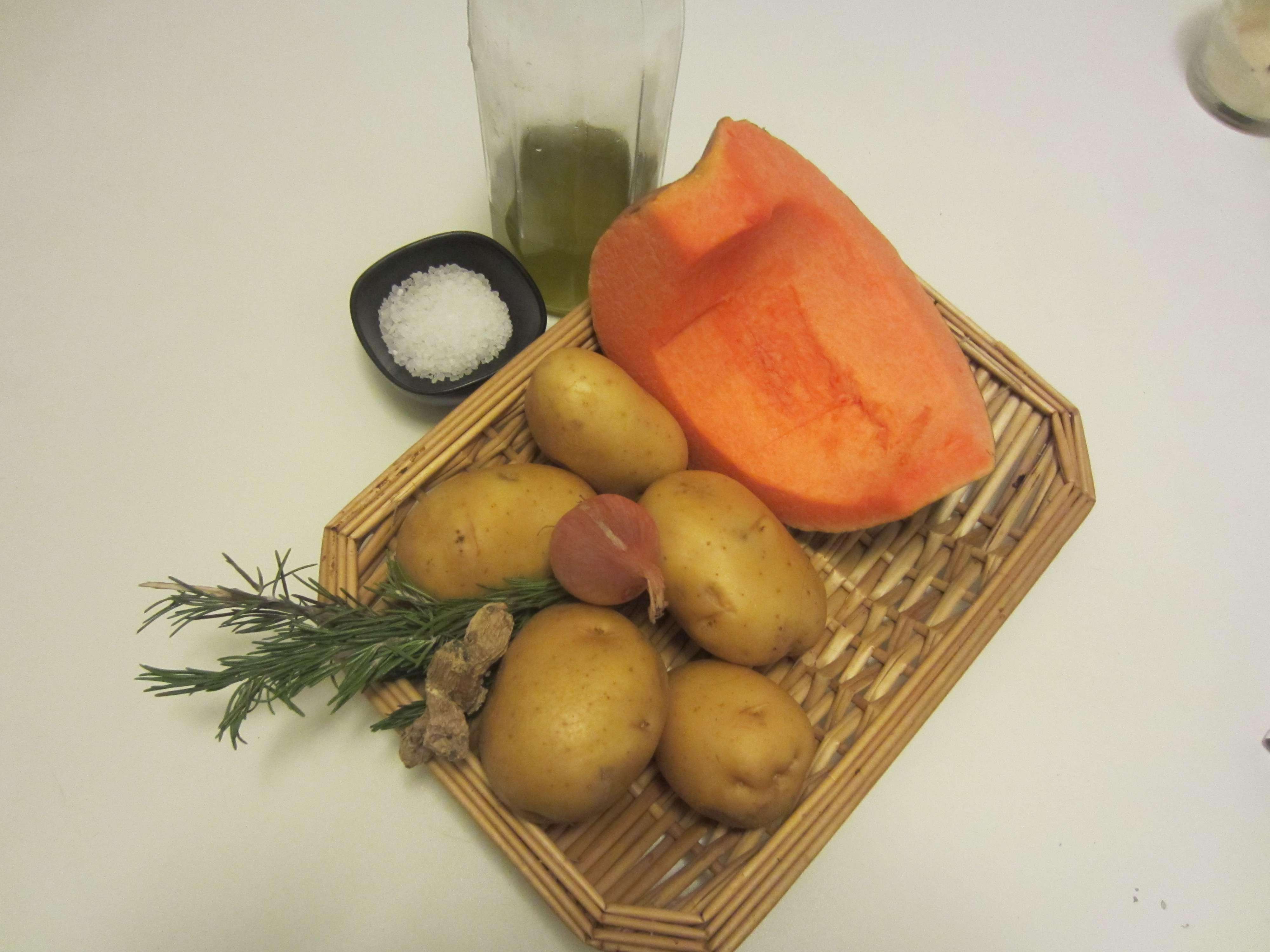 300 grams pumpkin into small pieces, 300 grams potatoes, peeled and diced, 30 grams of rosemary, 1 chopped shallot, salt, 4 tablespoons extra virgin olive oil, a bit of grated ginger.