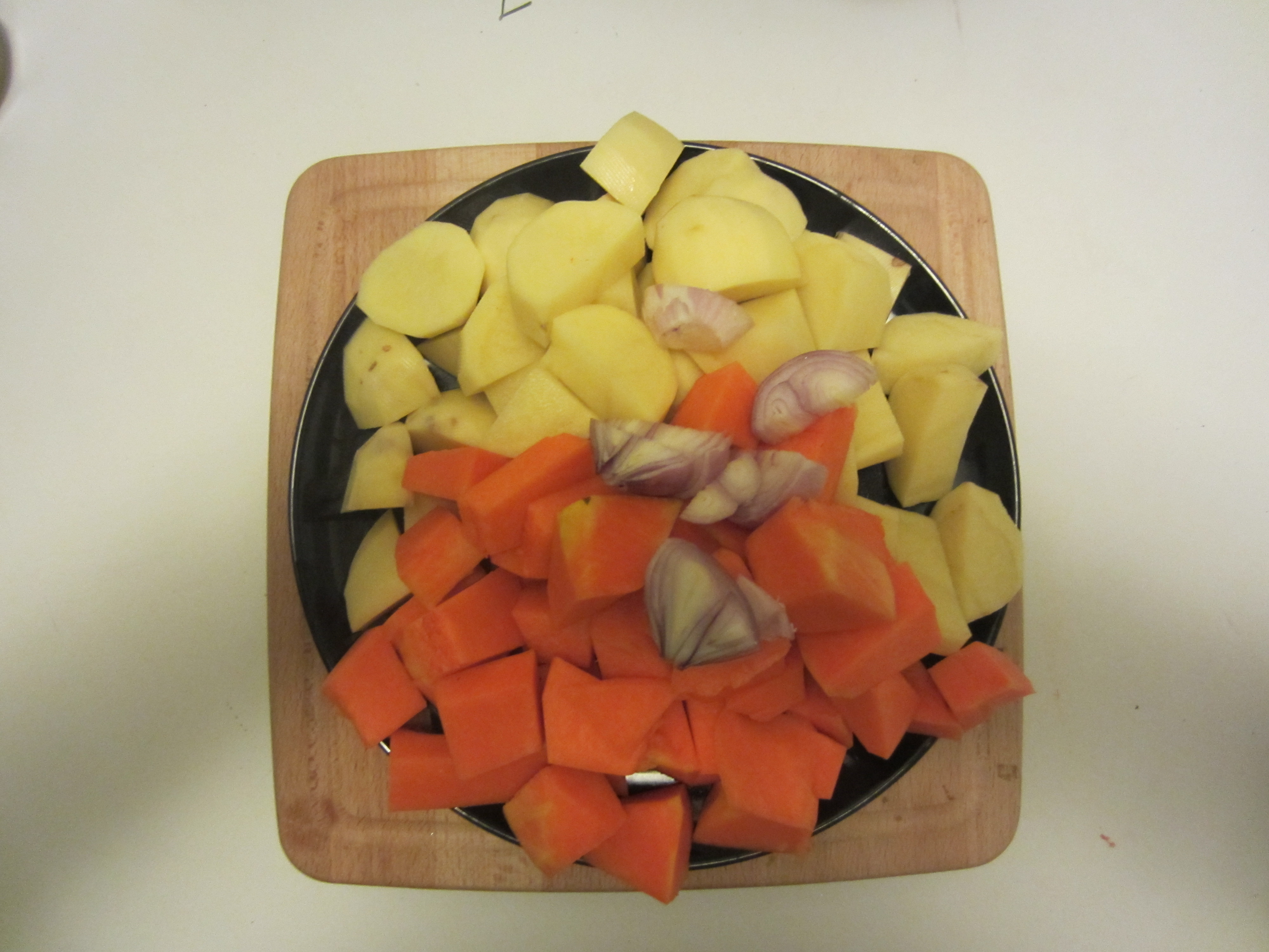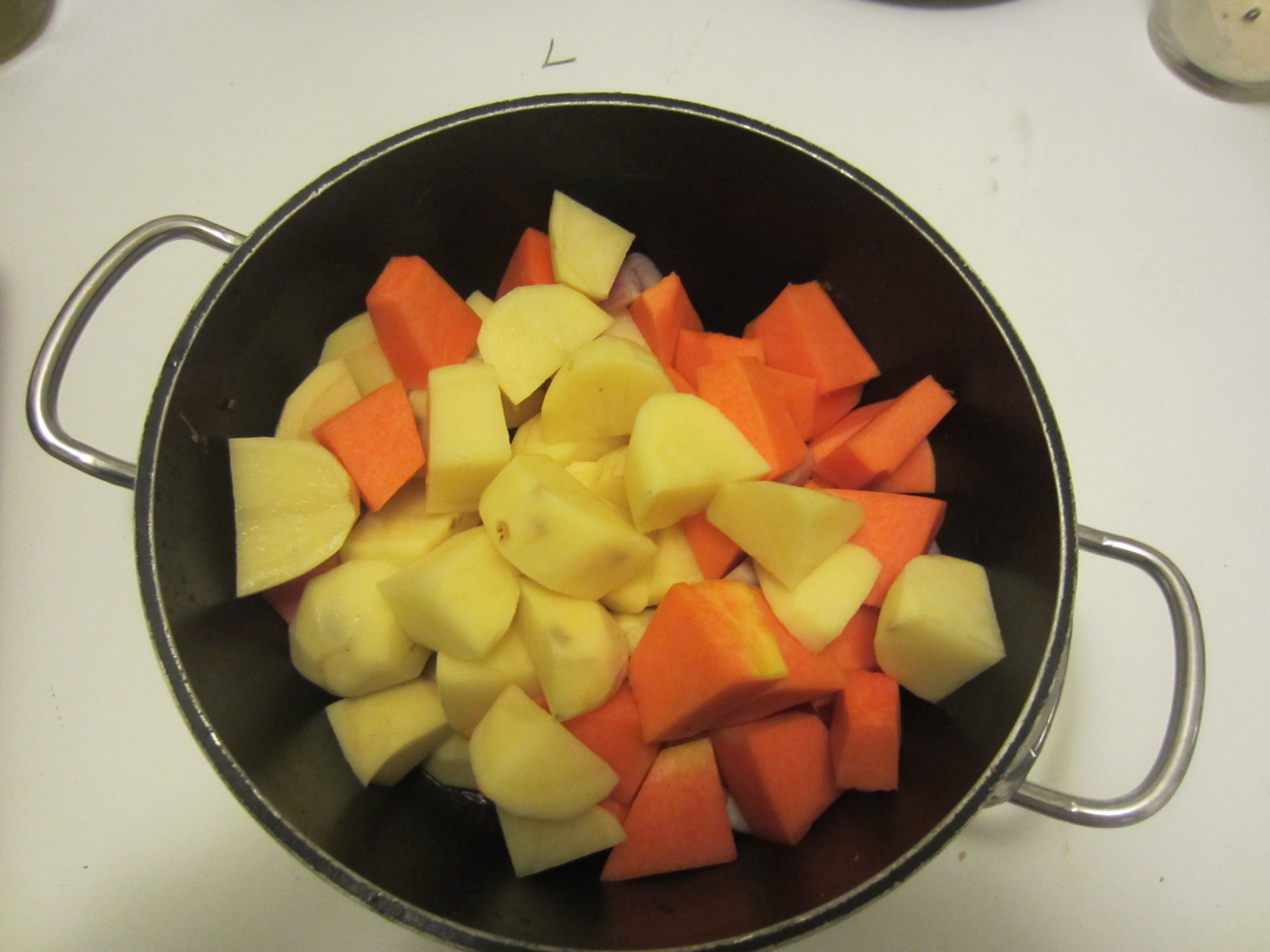 First of all peel and cut both the potatoes and the punpkin, and cut them in pieces of the same dimention.