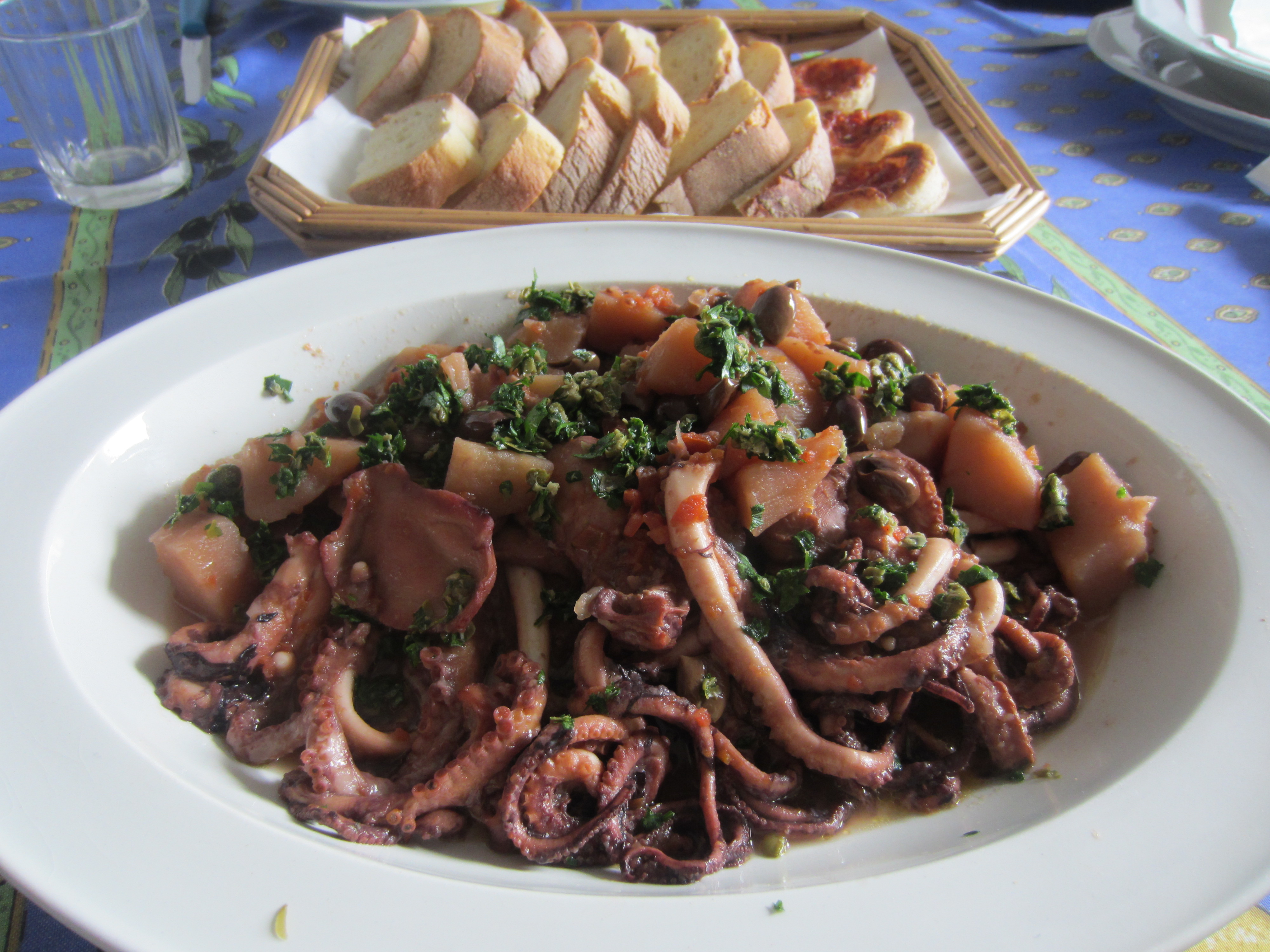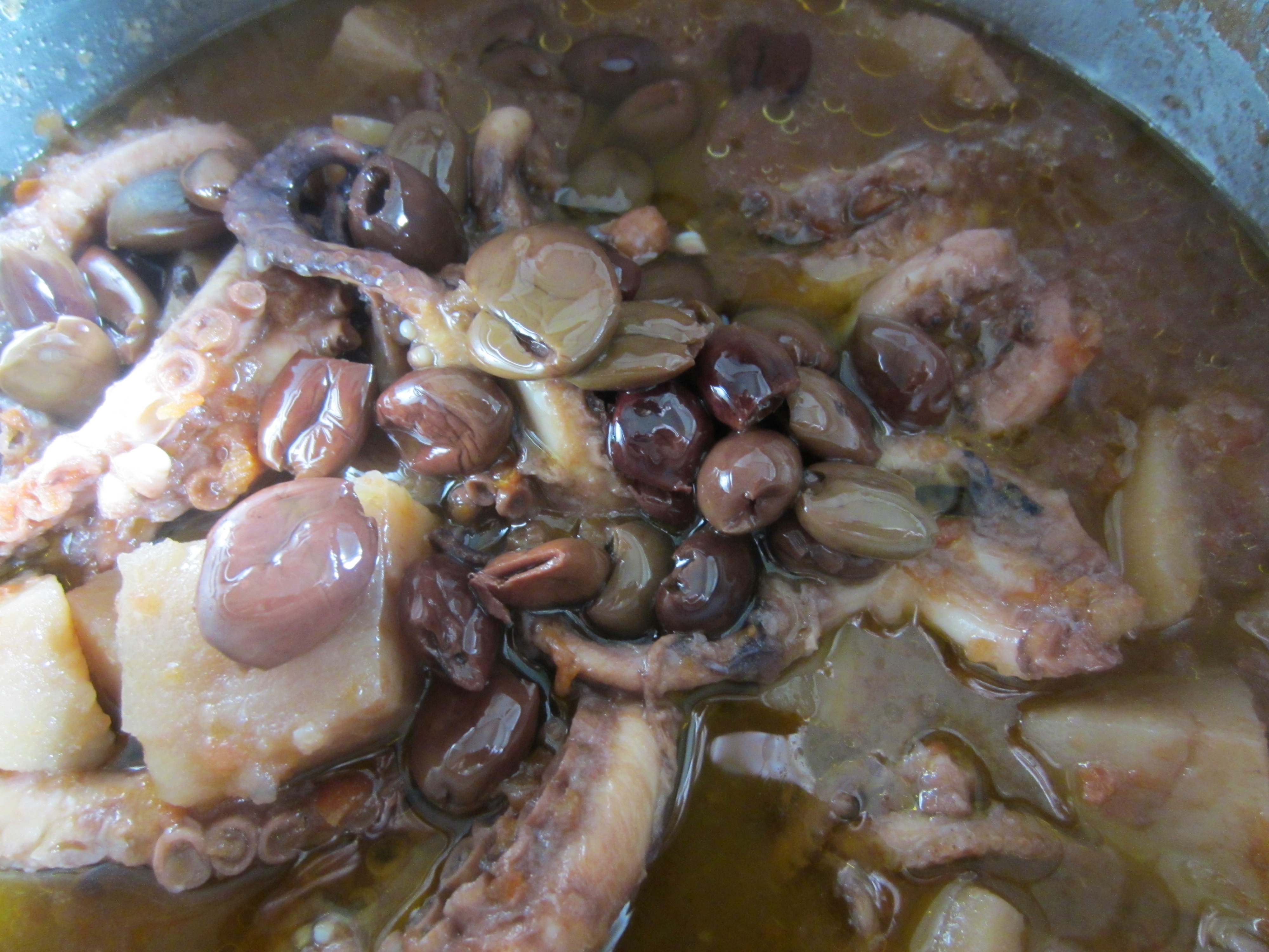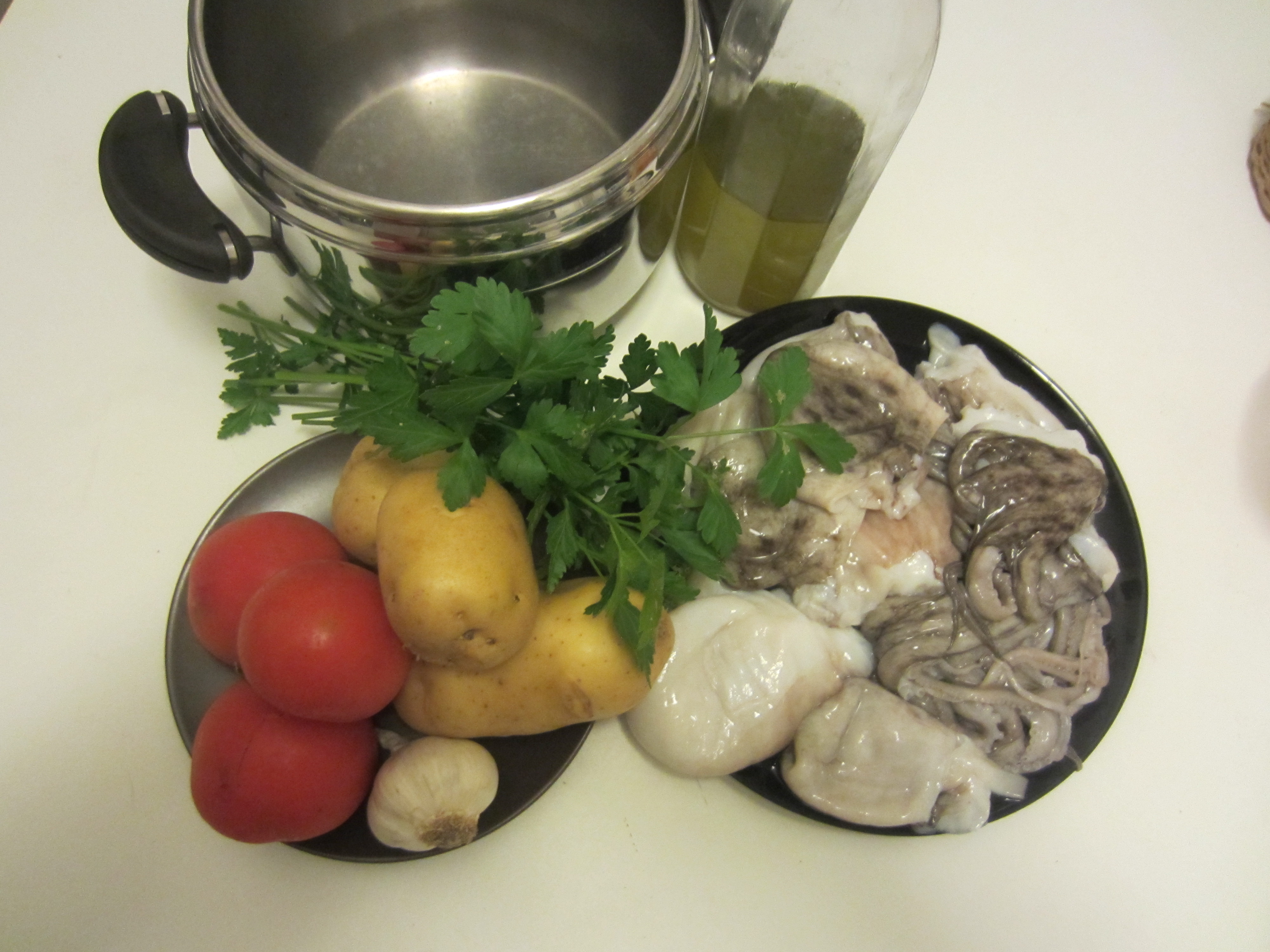 Here what you need: 1 kg of curled octopus , 1 kg of potatoes , 800 grams of ripe tomatoes , salt, half cup of extra virgin olive oil, half a cup of dry white wine, 1 clove garlic , 3 tablespoons olive black pits, 1 tablespoon capers, fresh parsley.