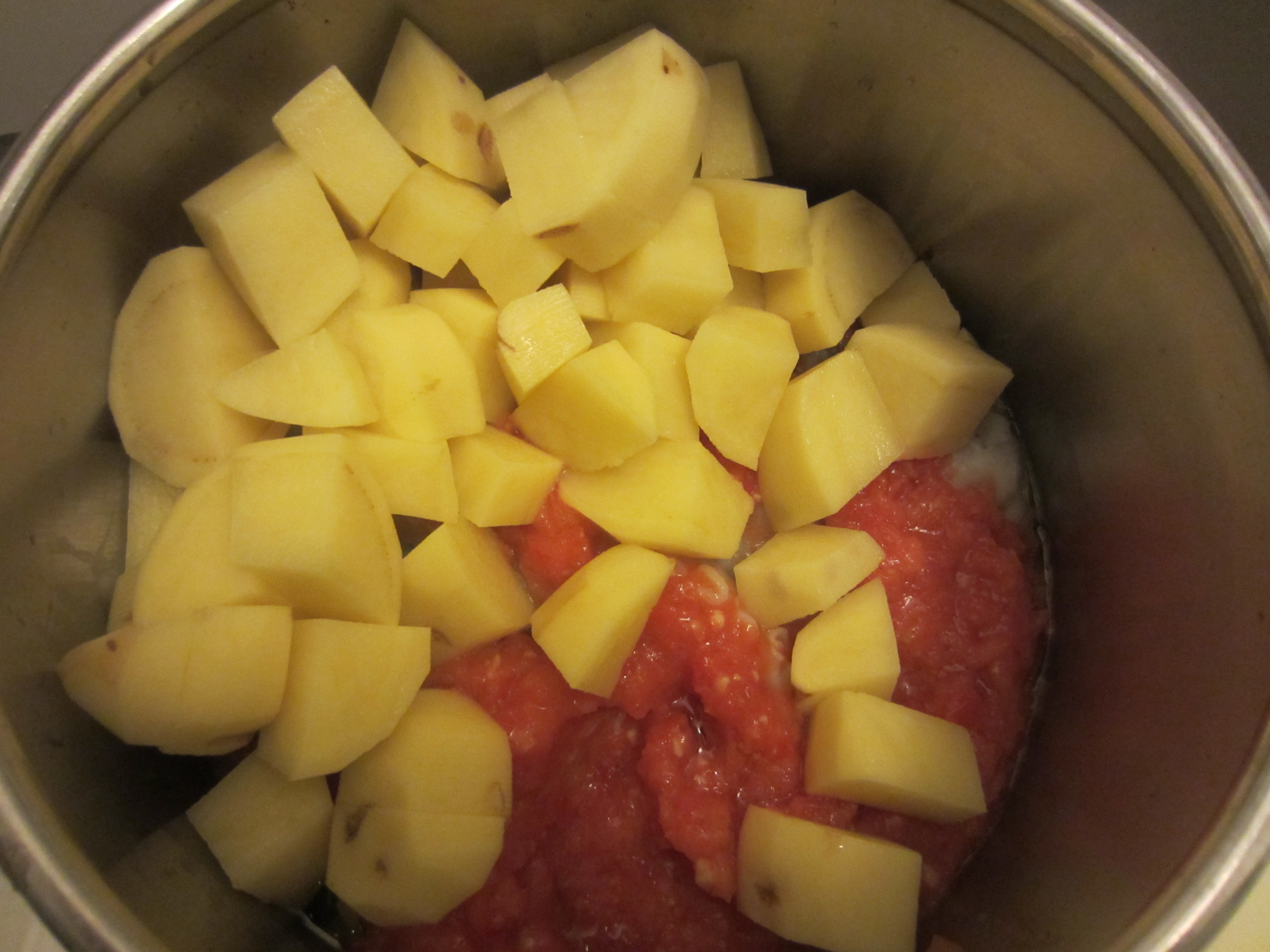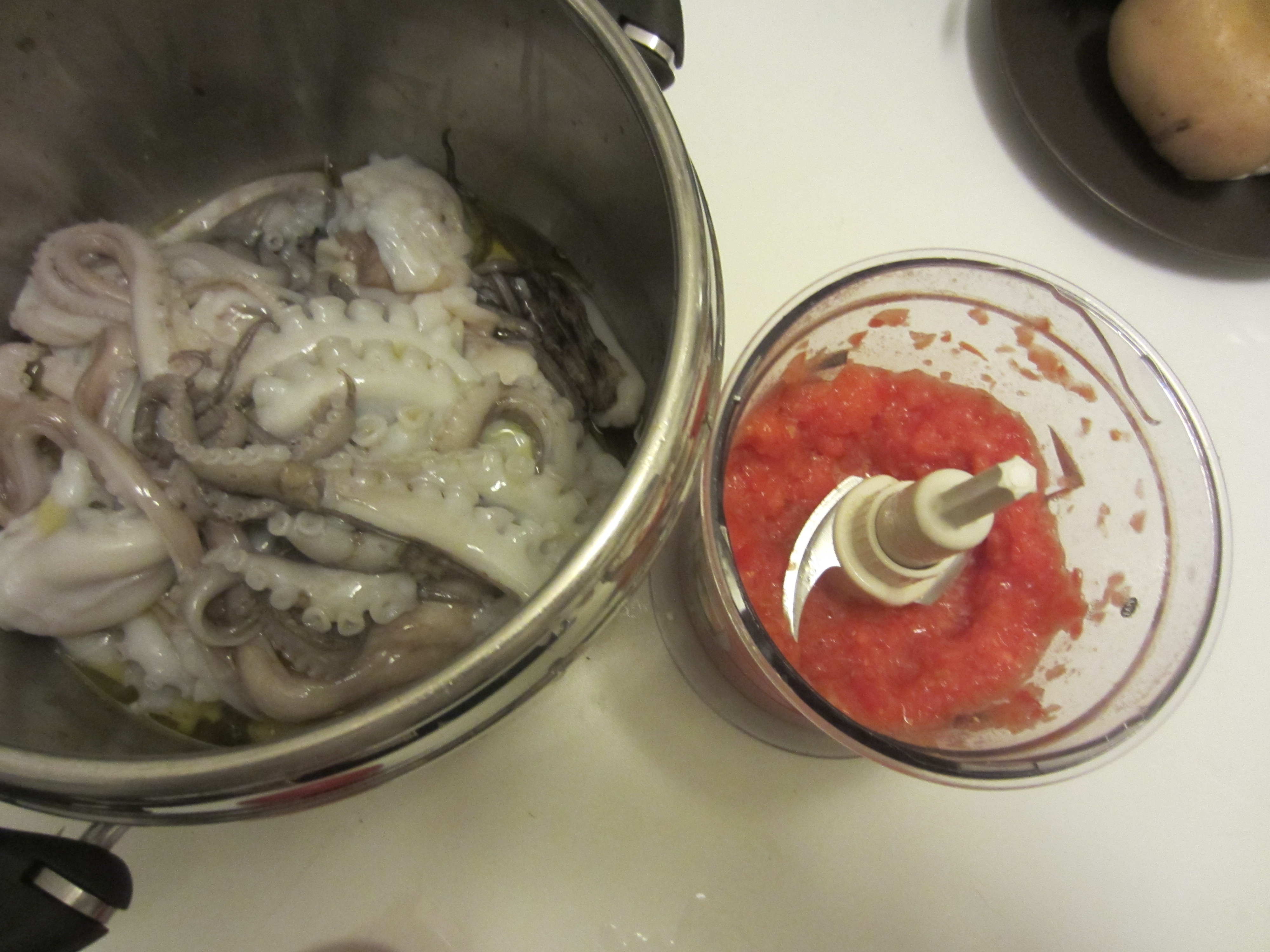 Put in a pressure cooker, in order, extra virgin olive, octopus cut into large pieces , the chopped tomato with garlic, chopped potatoes , still a little olive oil and white wine.