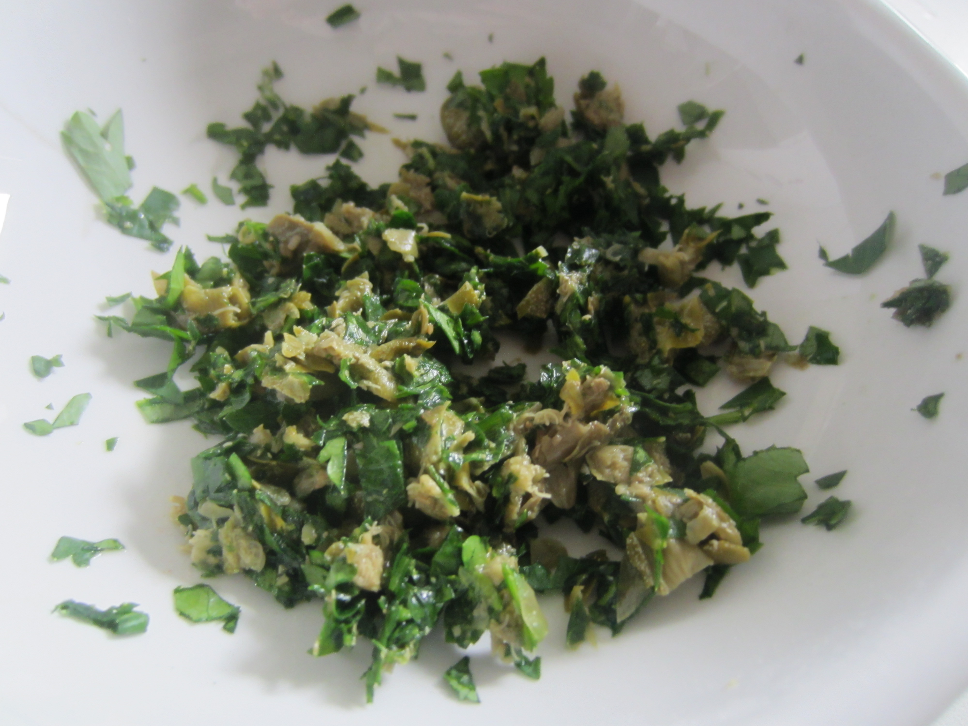 Meanwhile, chop the parsley and capers together .