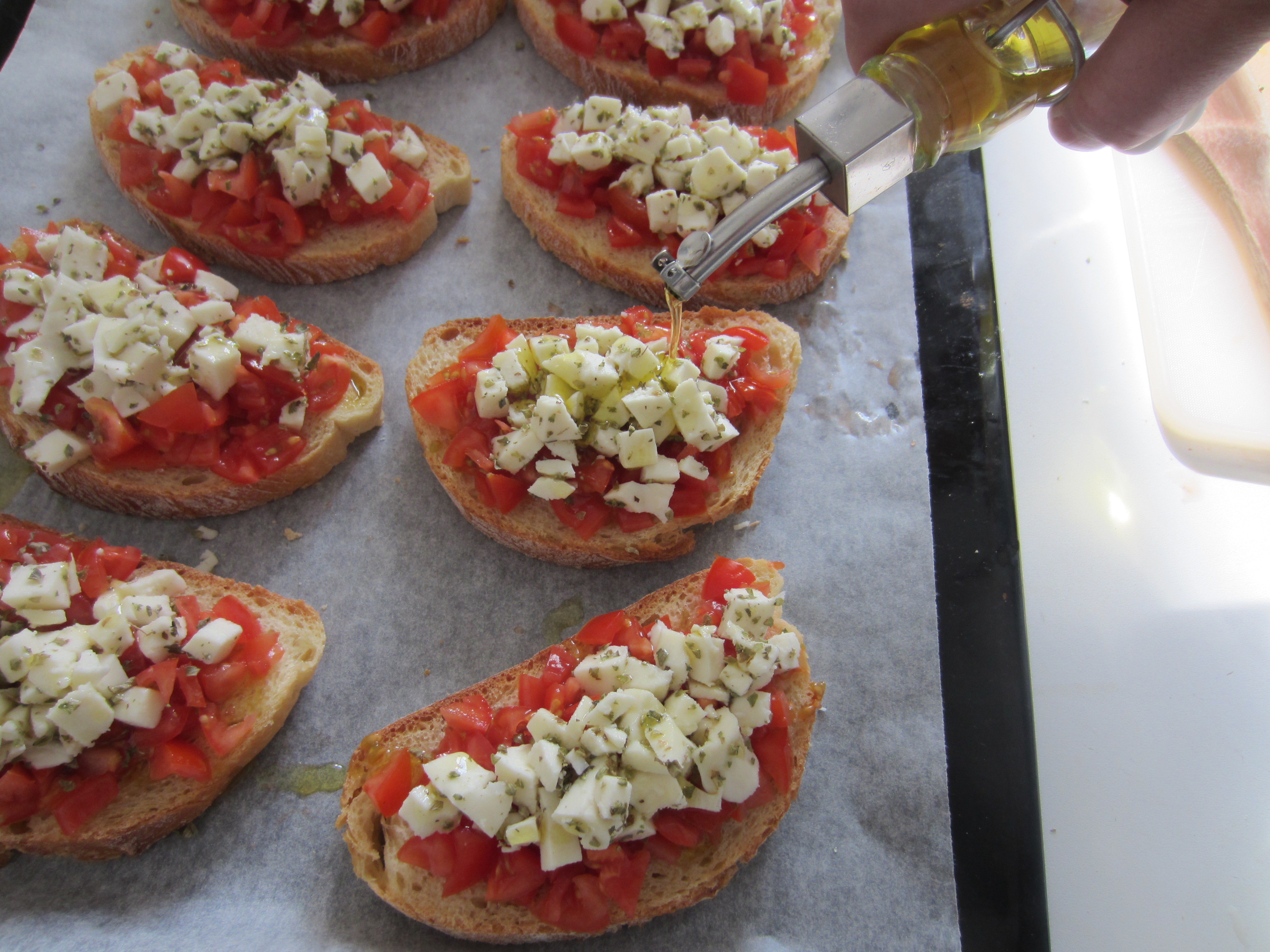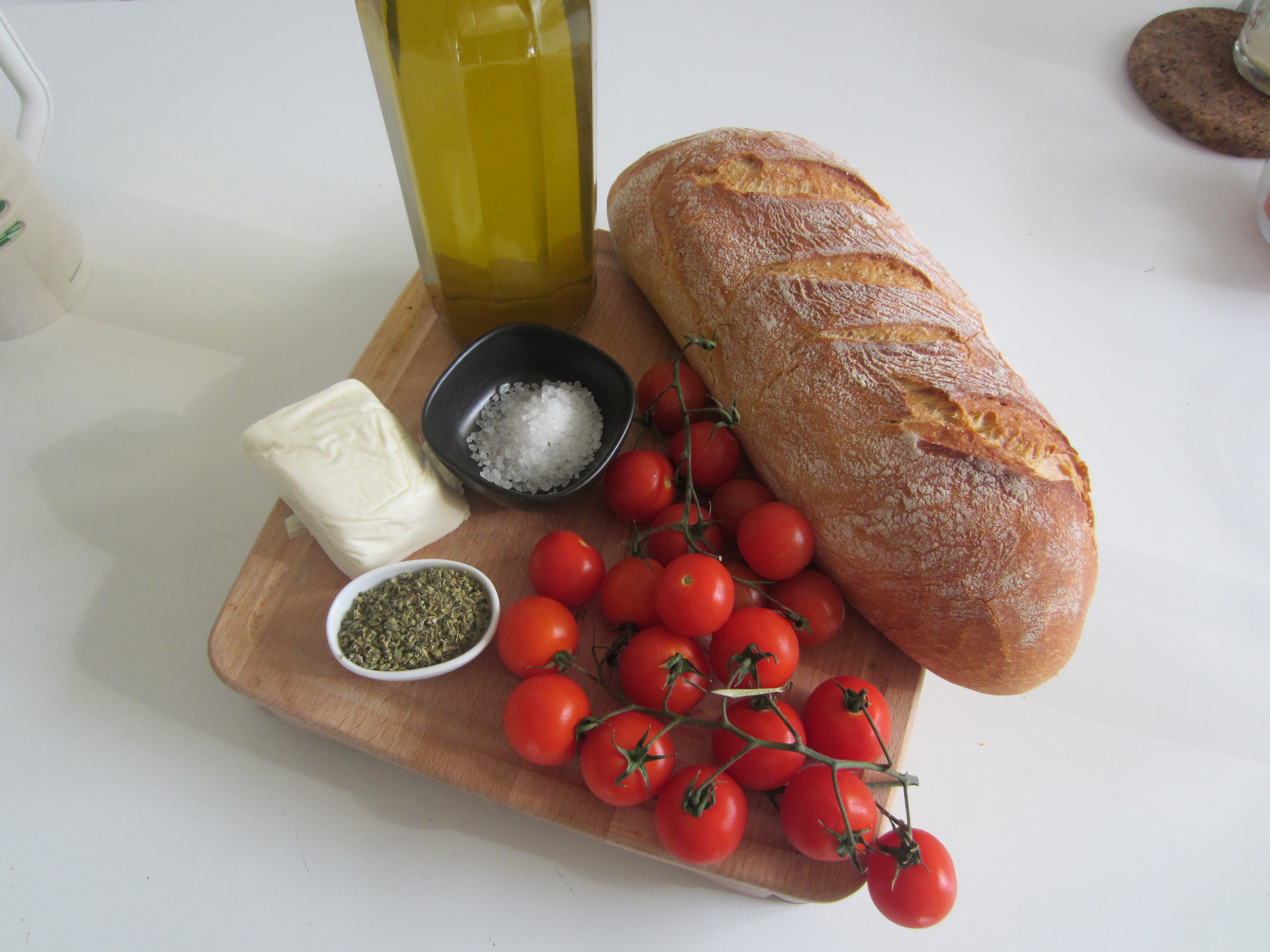 Here’s what you need: dry bread cut into slices about 1 cm high, cherry tomatoes, olive oil, salt, oregano, , basil, , mozzarella.