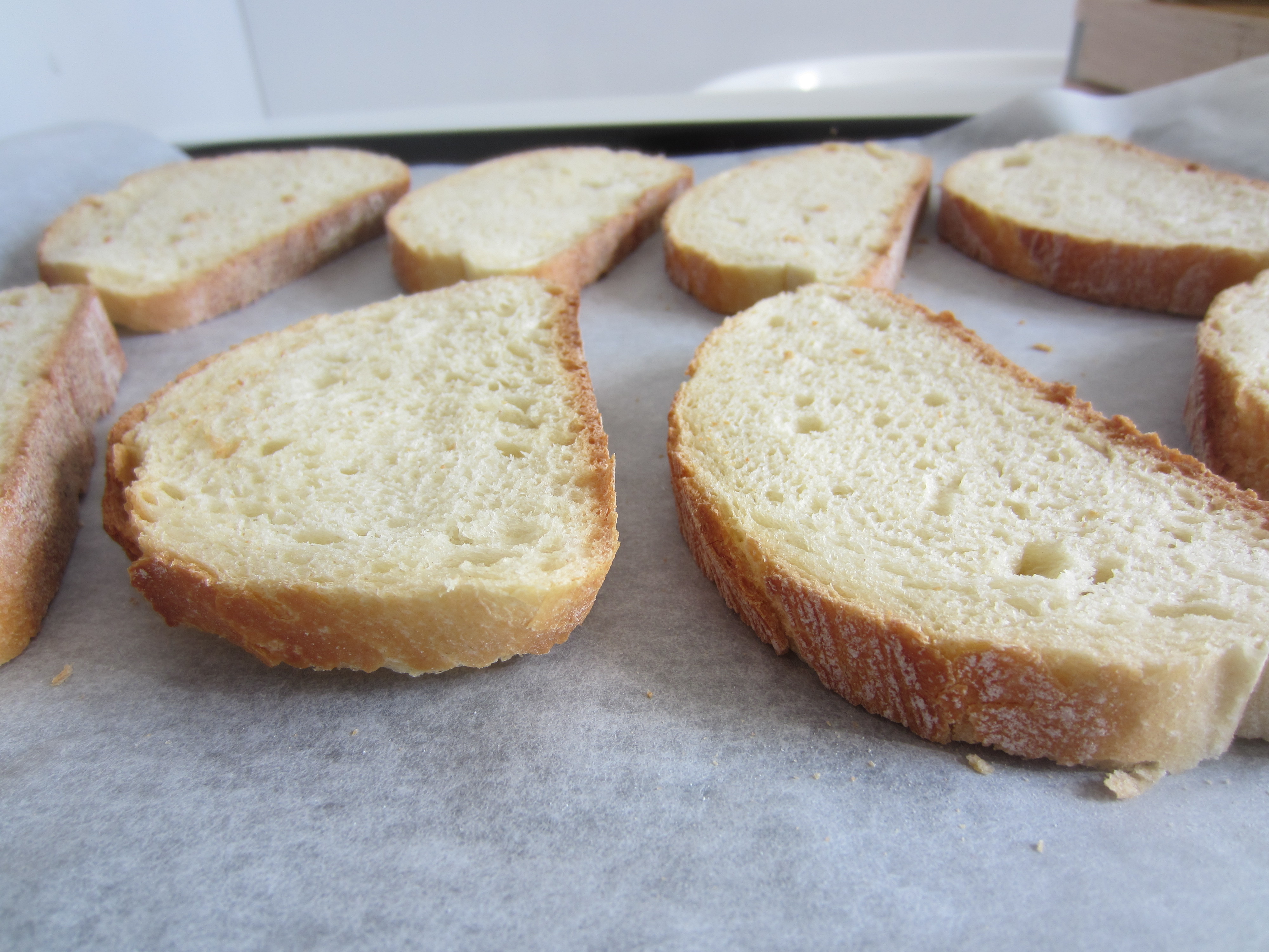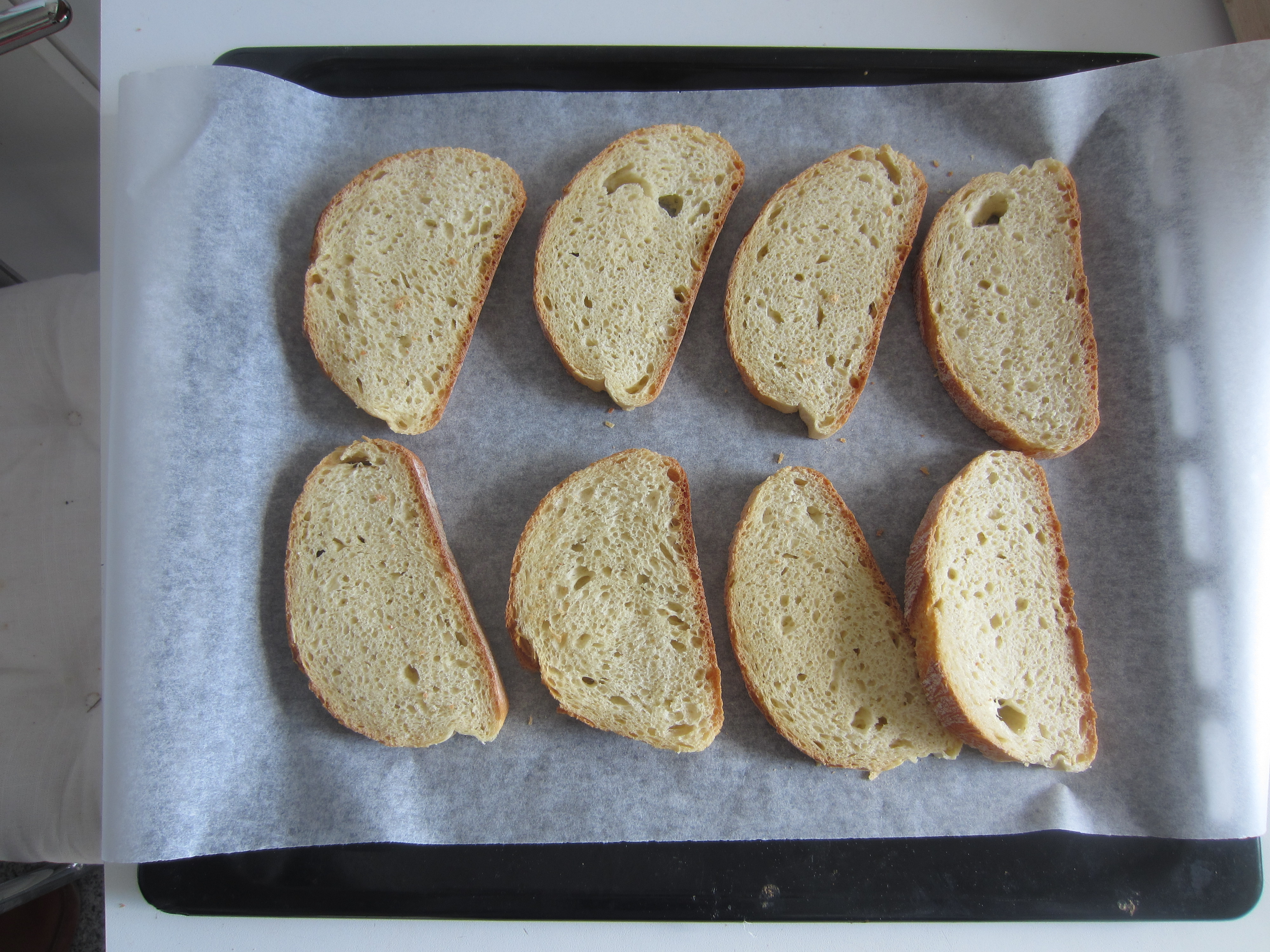 Then arrange the slices of bread on a baking sheet covered with parchment paper, and sprinkle with a little ‘water released from the tomatoes.