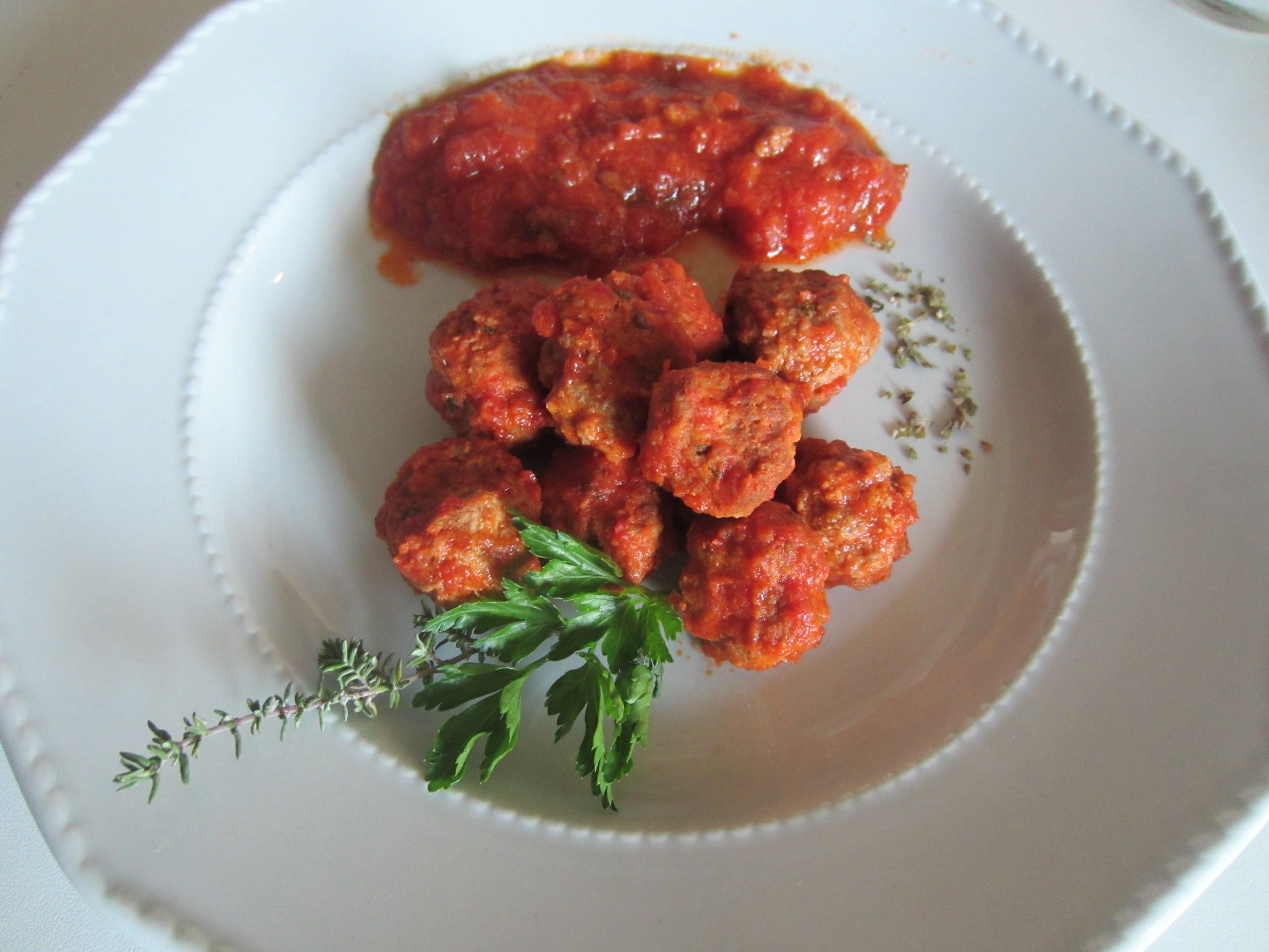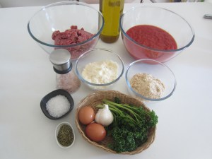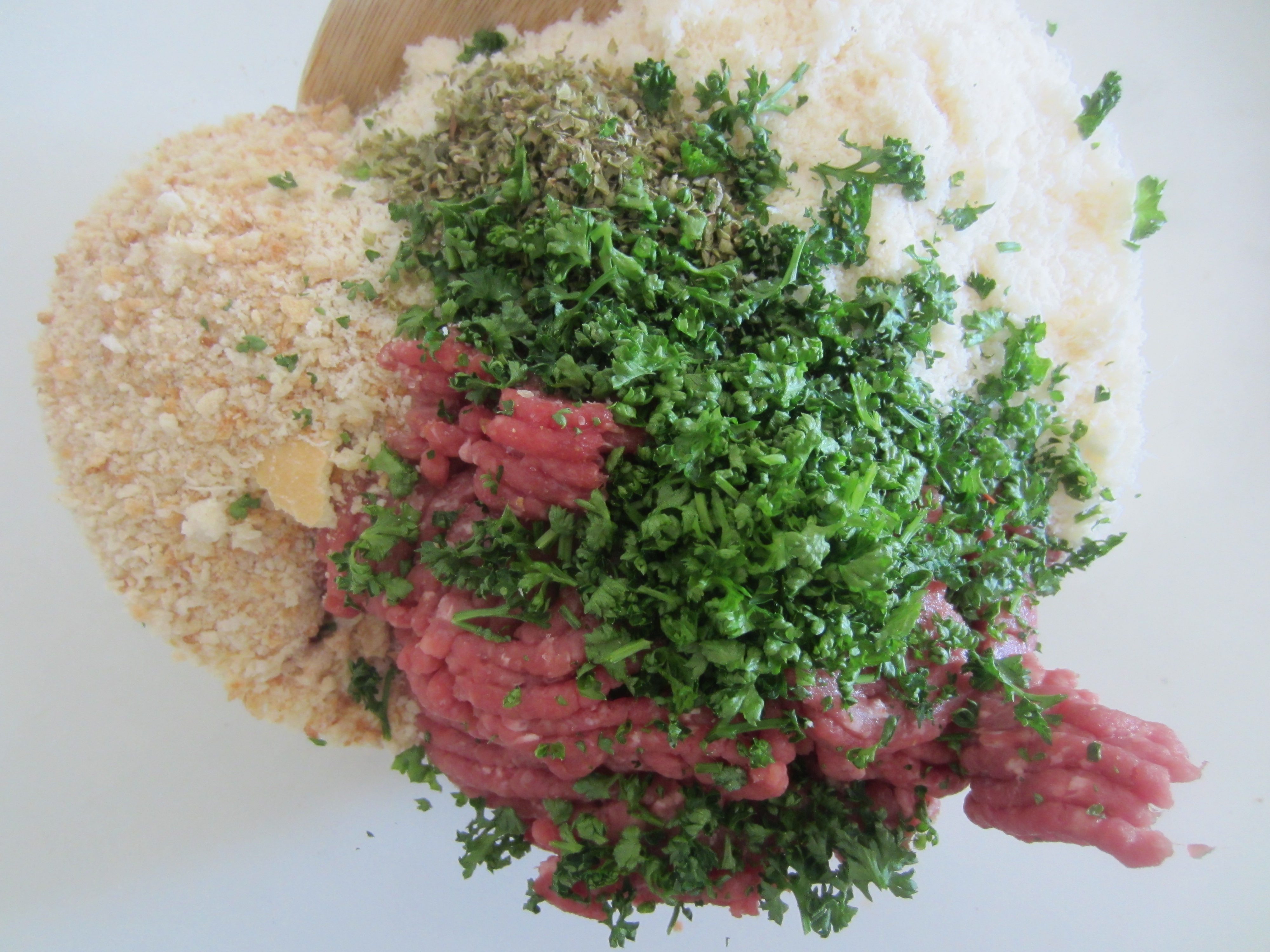 For the meatballs. 500 grams of minced beef , 120 grams of grated Parmesan cheese , grated 120 grams of bread , 30 grams of fresh parsley , 2 eggs, 3 tablespoons dried oregano , 3/4cucchiai of milk ( if necessary), salt to taste.