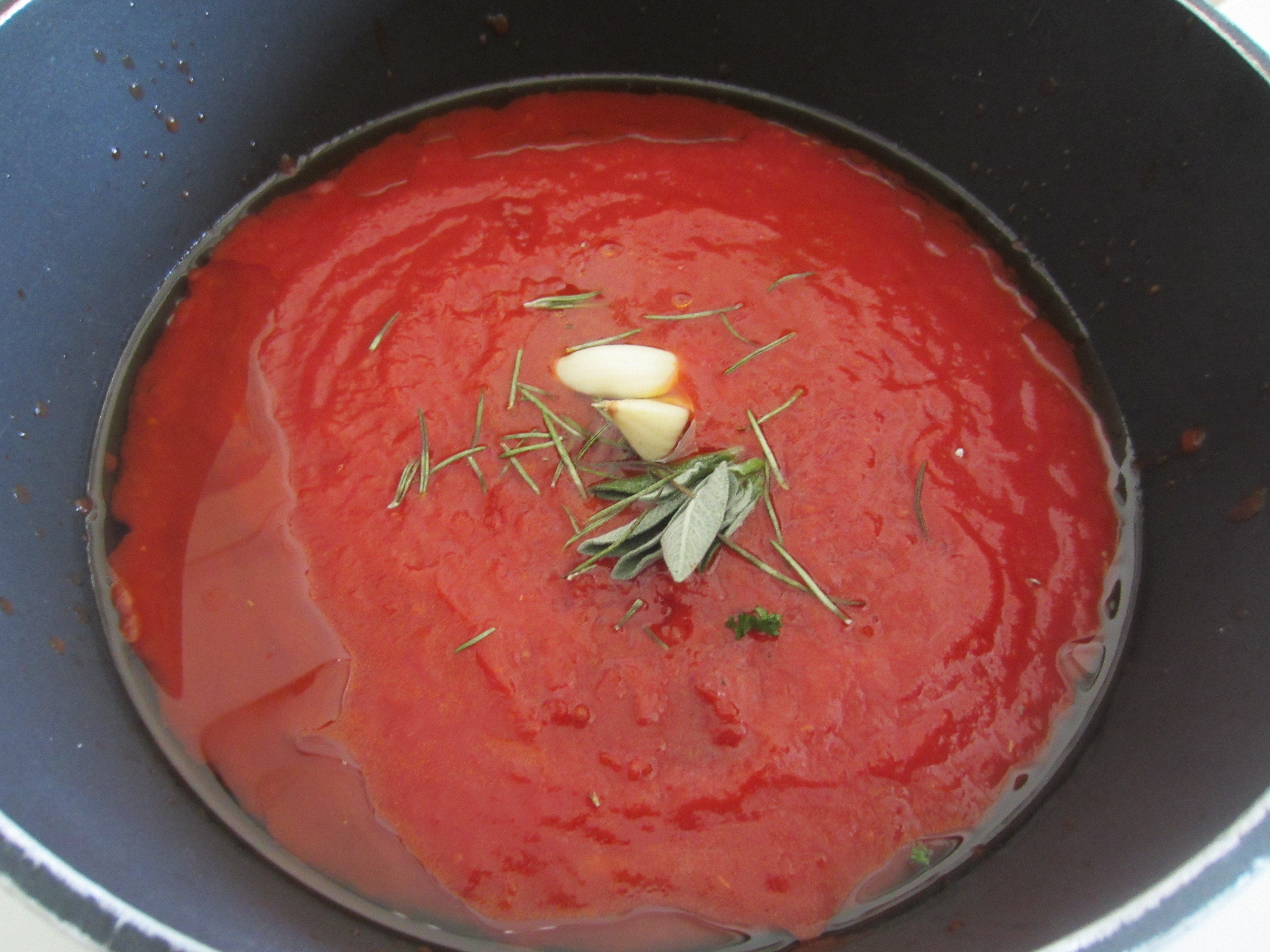 First prepare the base for the sauce by putting 5 tablespoons extra virgin olive oil on the bottom of a nonstick pan, then add the tomato passata, sage, rosemary, garlic cloves, peeled and whole , a pinch of sugar, a little chilli if you like and salt to taste.