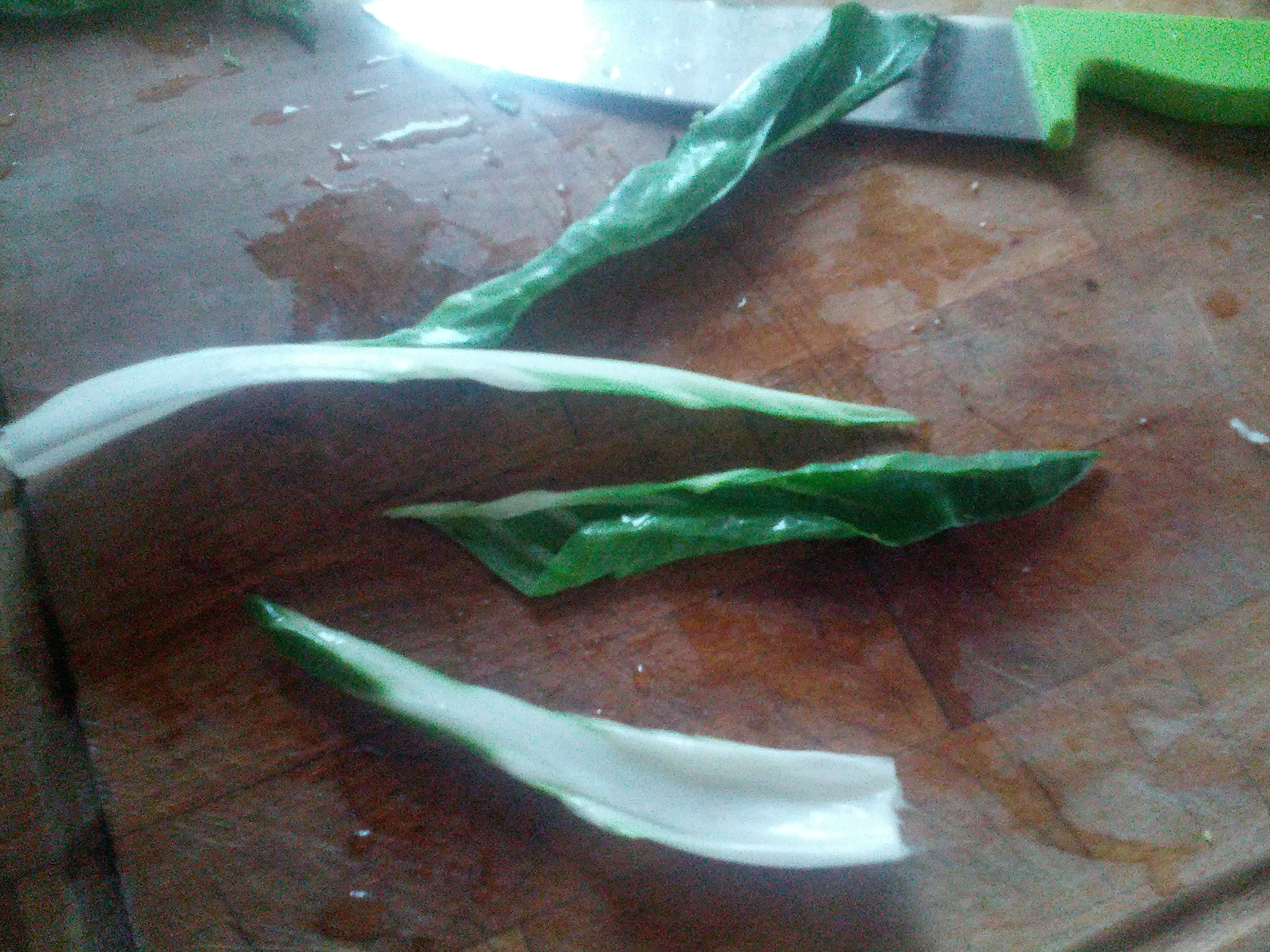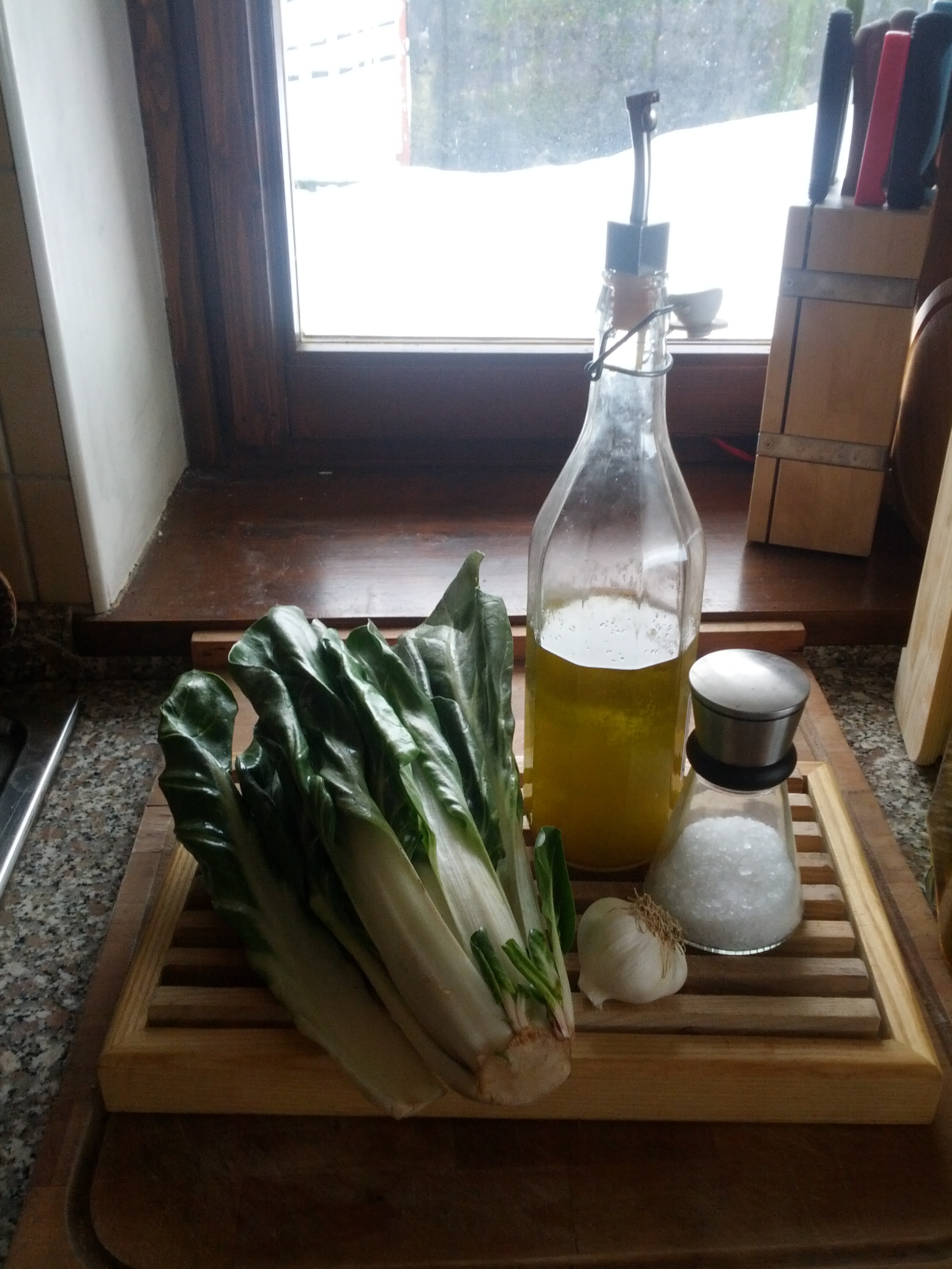 Here’s what you need: 300 grams of swiss chard , 1 clove of garlic, salt to taste , 3 table spoons extra virgin olive oil, 100/200 grams of passata (tomato souce) possibly hand made (here you will see the one I do, you may find the recipe in my blog!), 40 gram of grated smoked cheese scamorza like