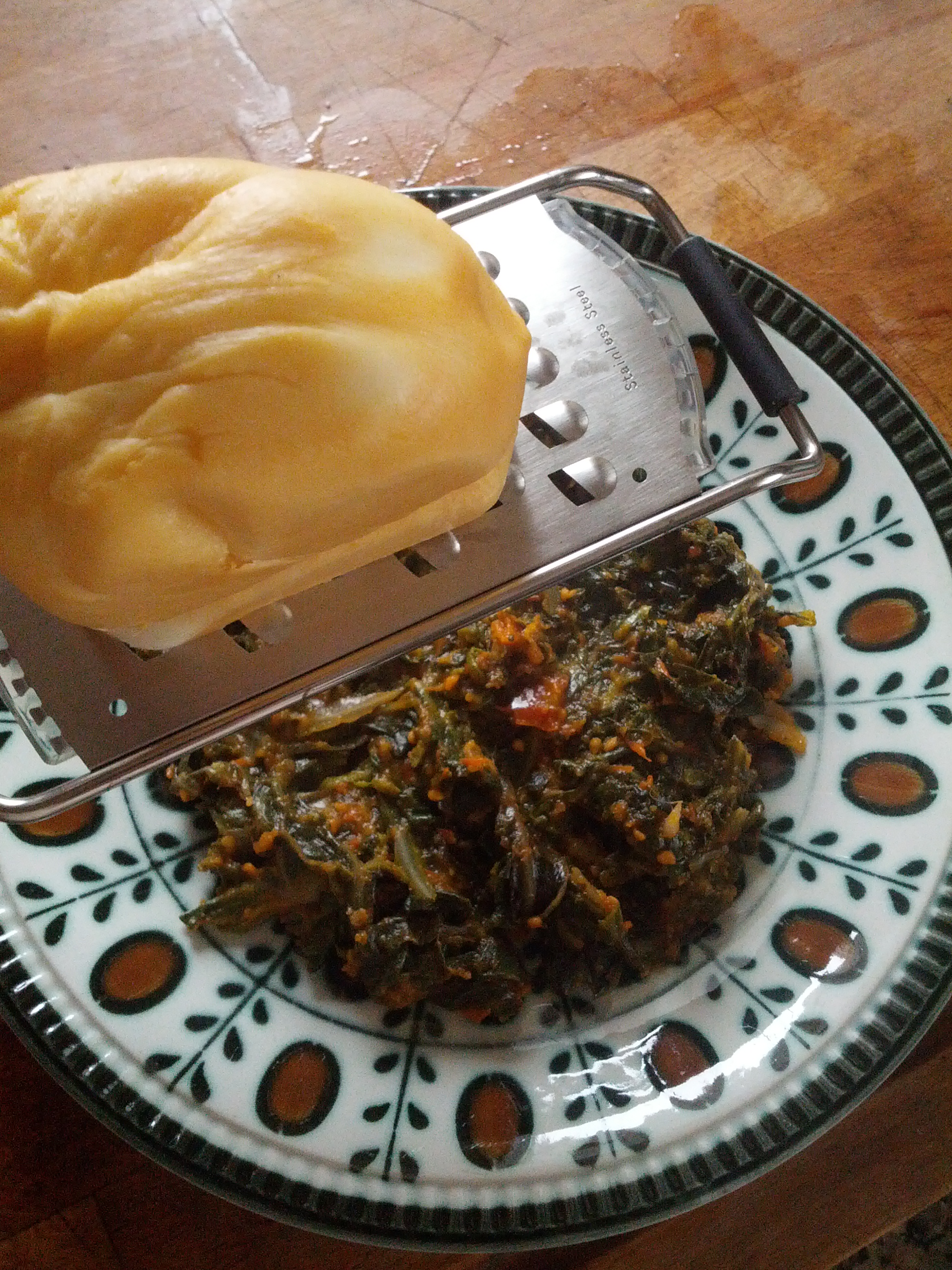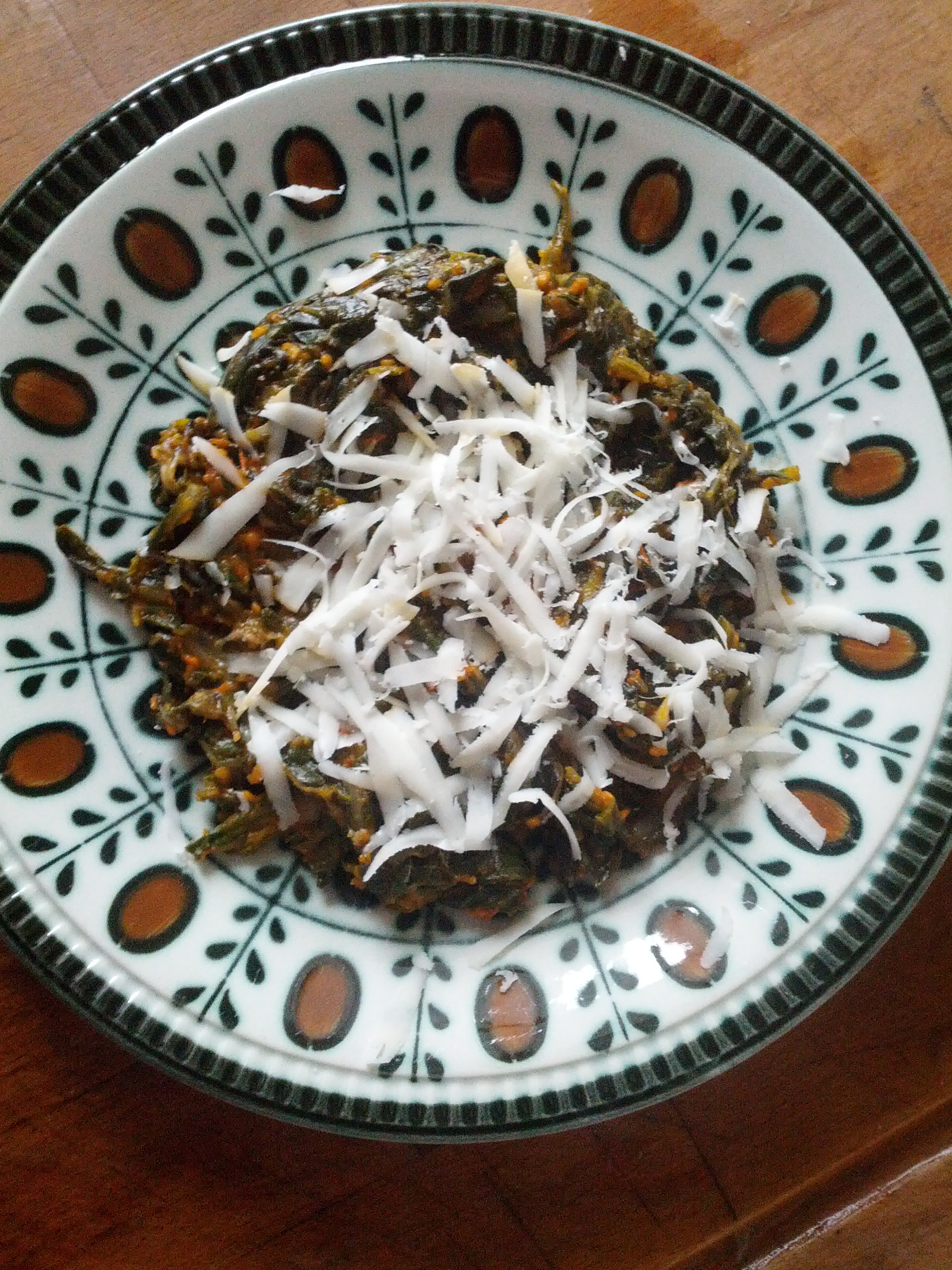 Then put the swiss chard & passata on a dish, and add the grted smoked chees while is still very warm.