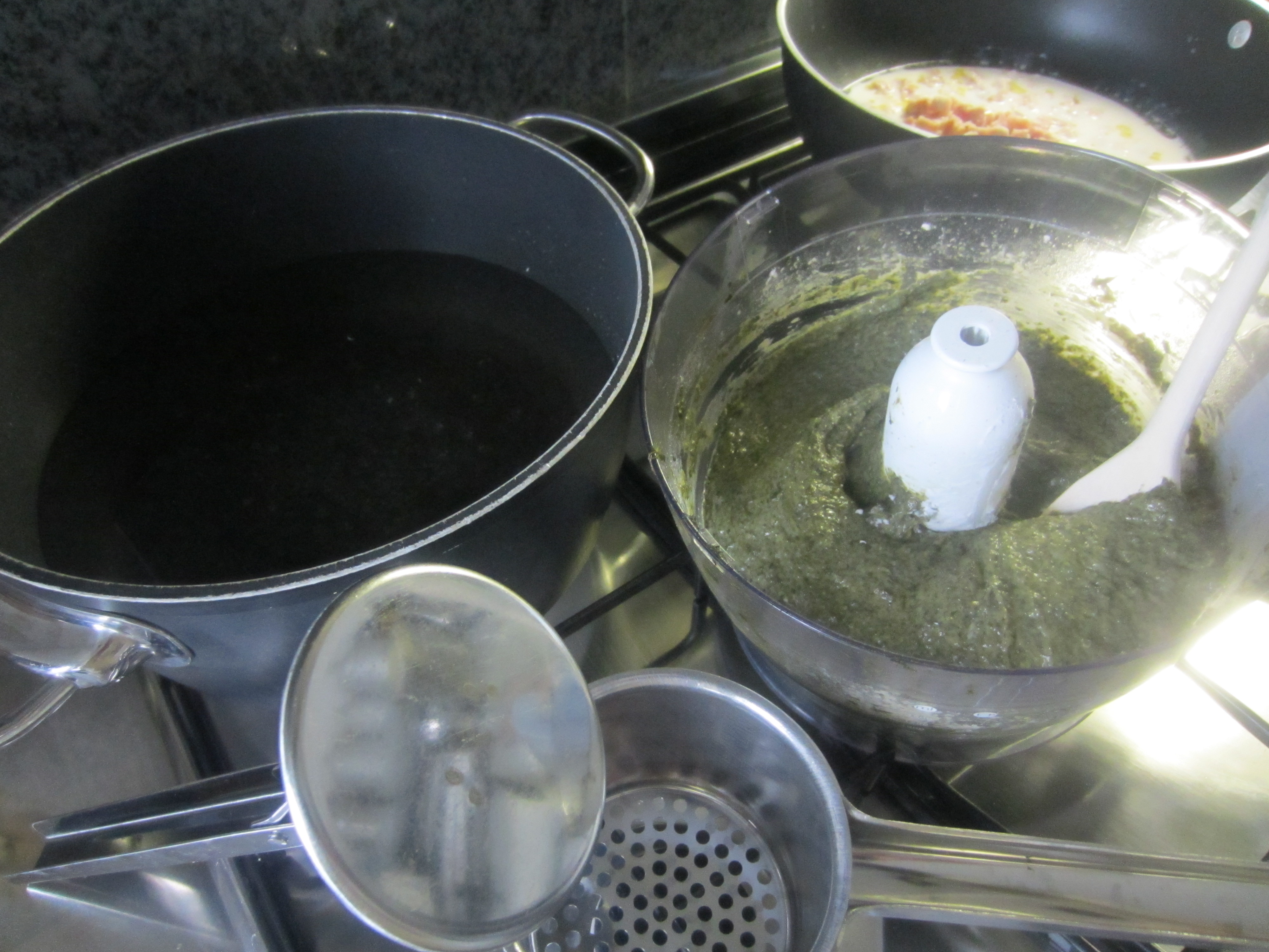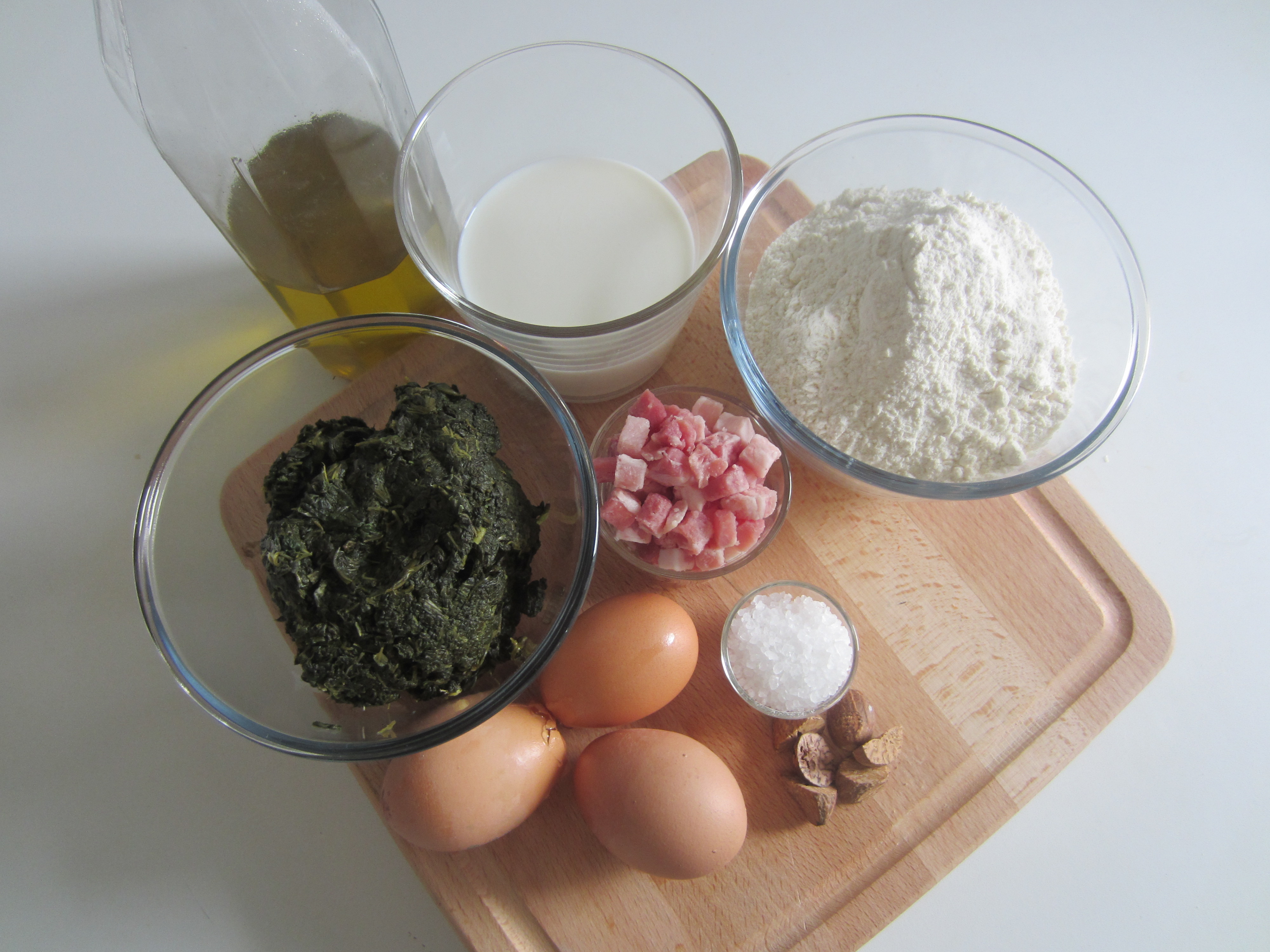 300 grams of Spinach boiled and drained, 3 eggs, 100 ml of Water, 300 grams of Flour 300 r, 100 grams of potato flour, plenty of grated nutmeg, salt to taste.