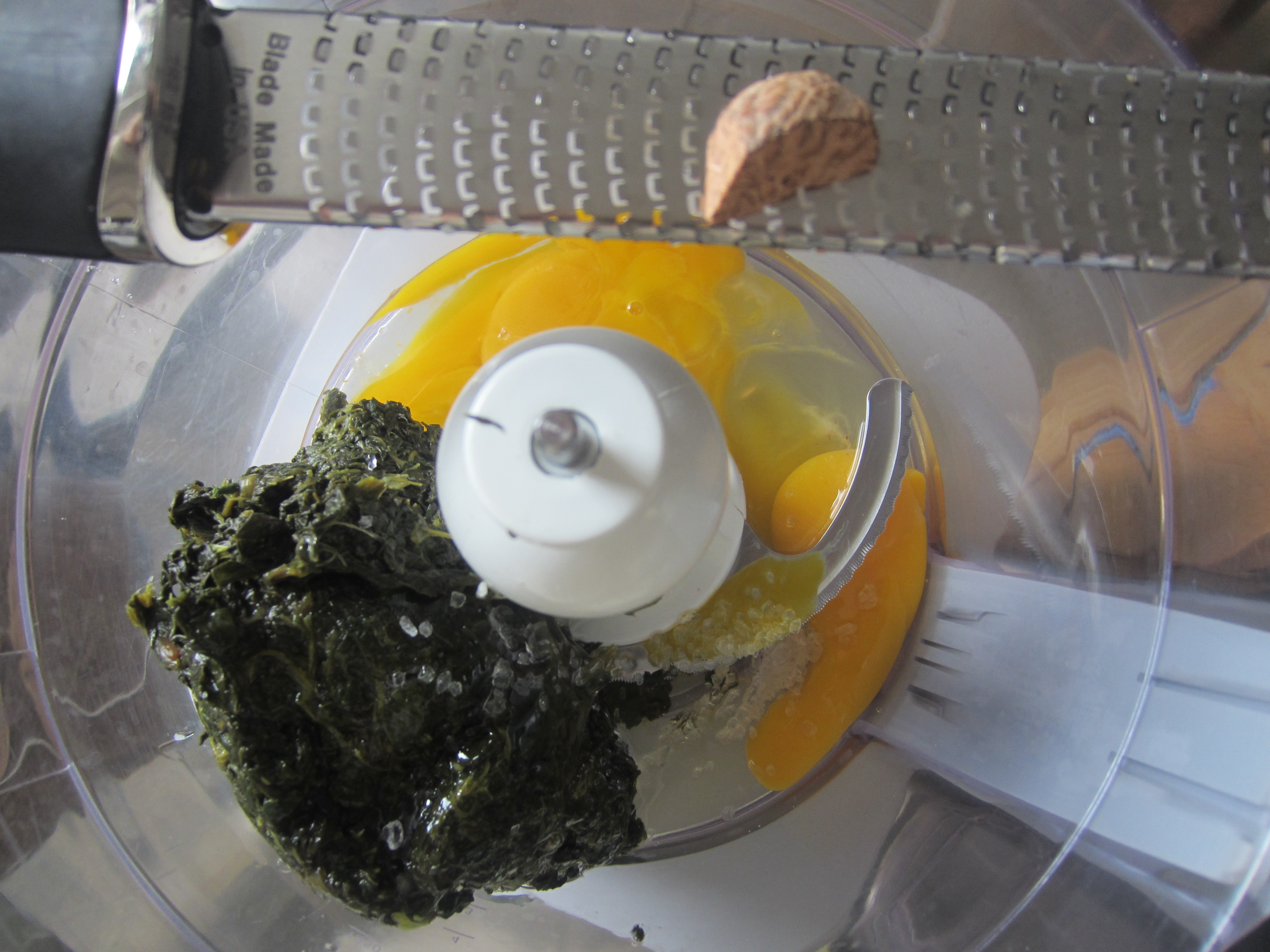 hop the spinach and put them in a blender along with the eggs, water, nutmeg and salt