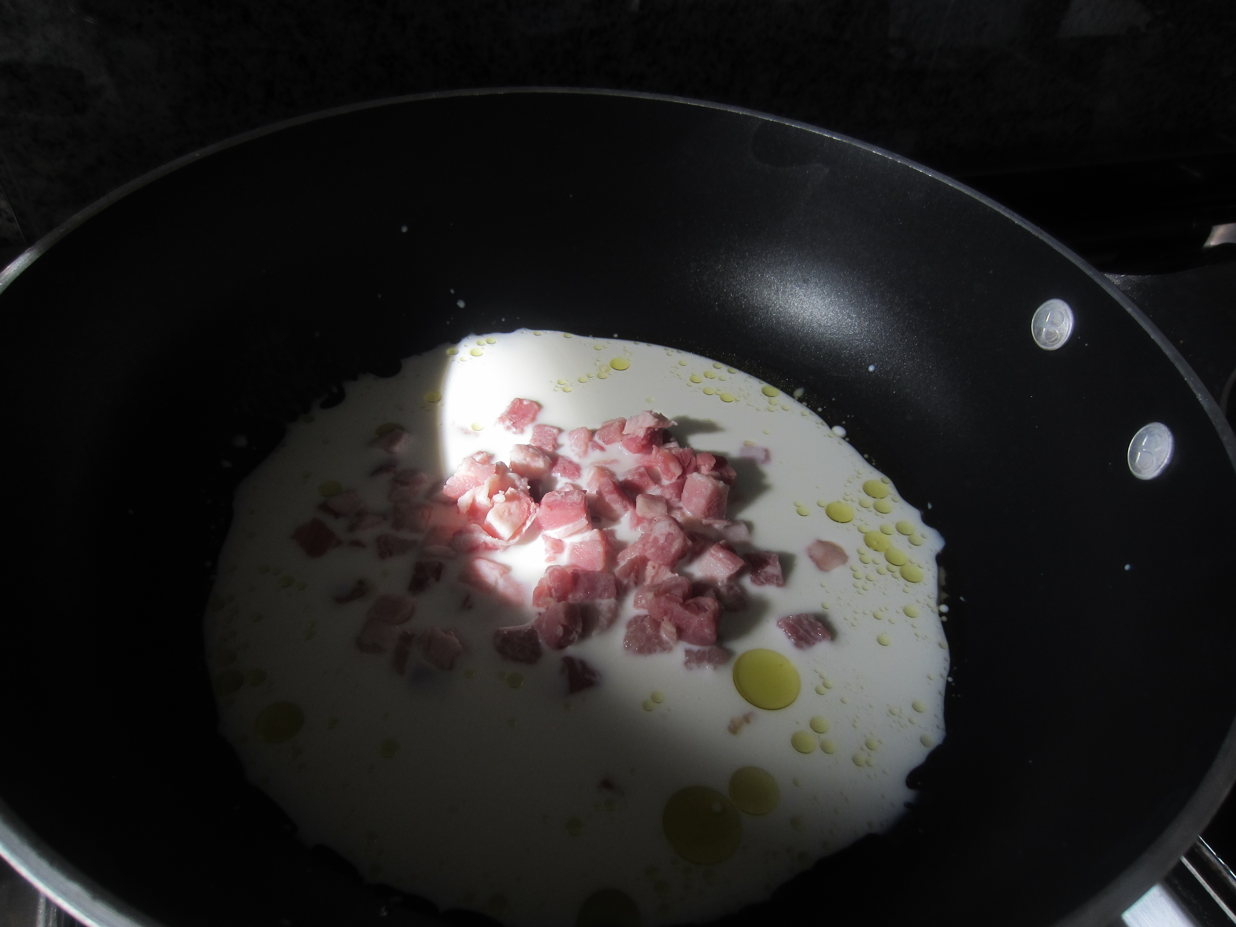 While the mix is in the fridge, prepare the souce: in a pan put the oil, the milk, and the pancetta, and let it becoming worm cooking it over very low heat.