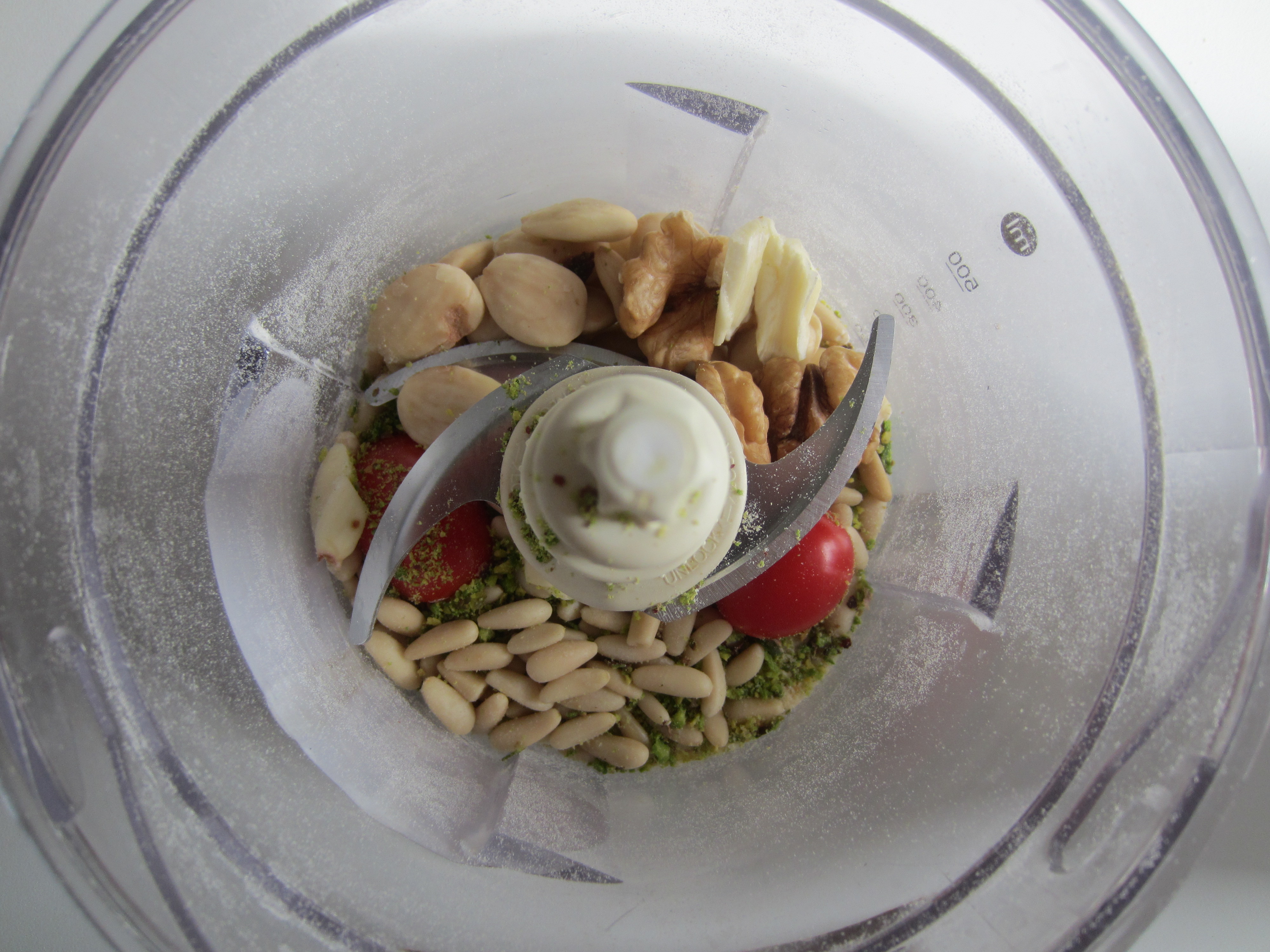 First of all, finely chop the almonds , walnuts , pistachios , garlic and rosemary.