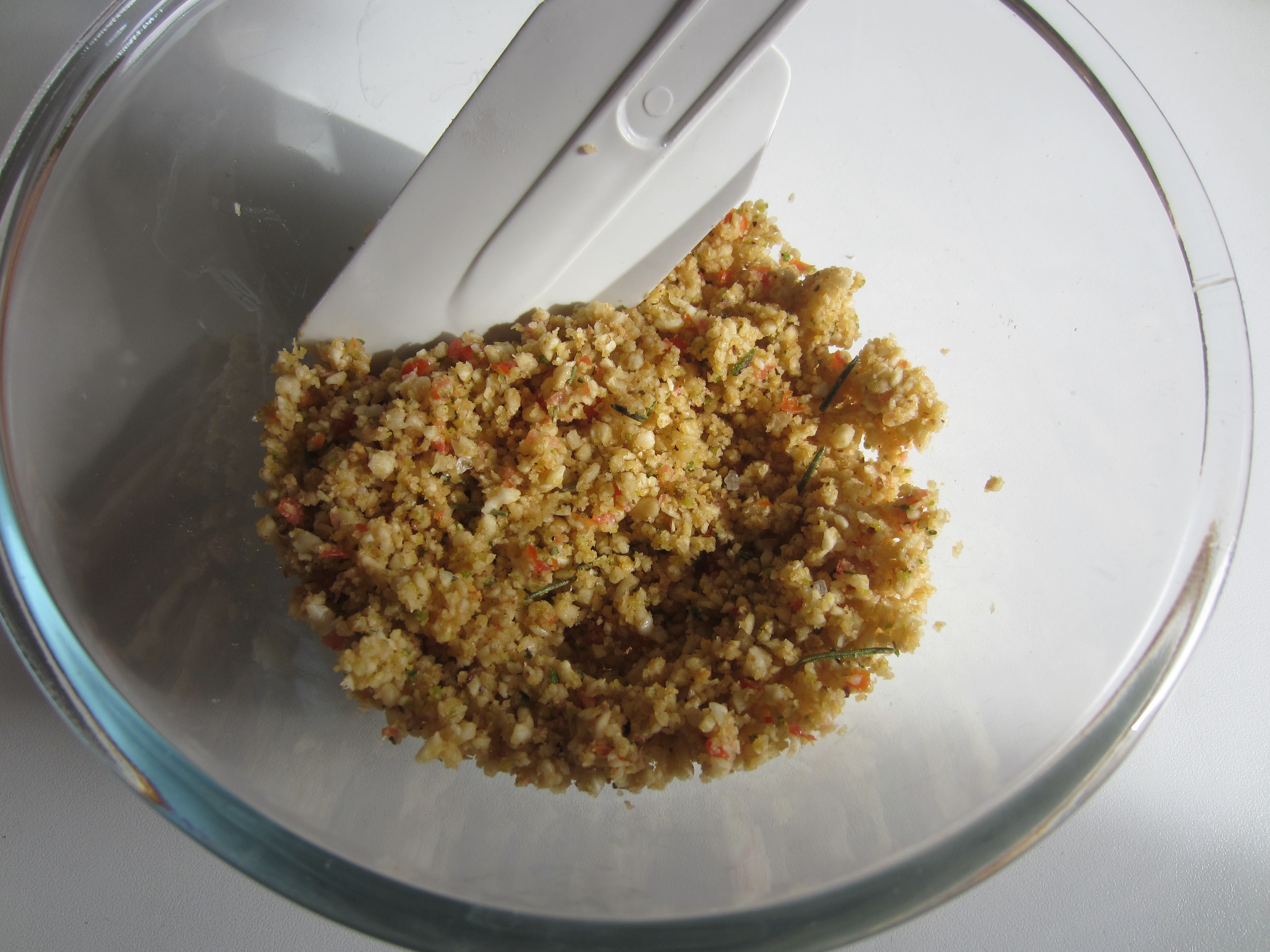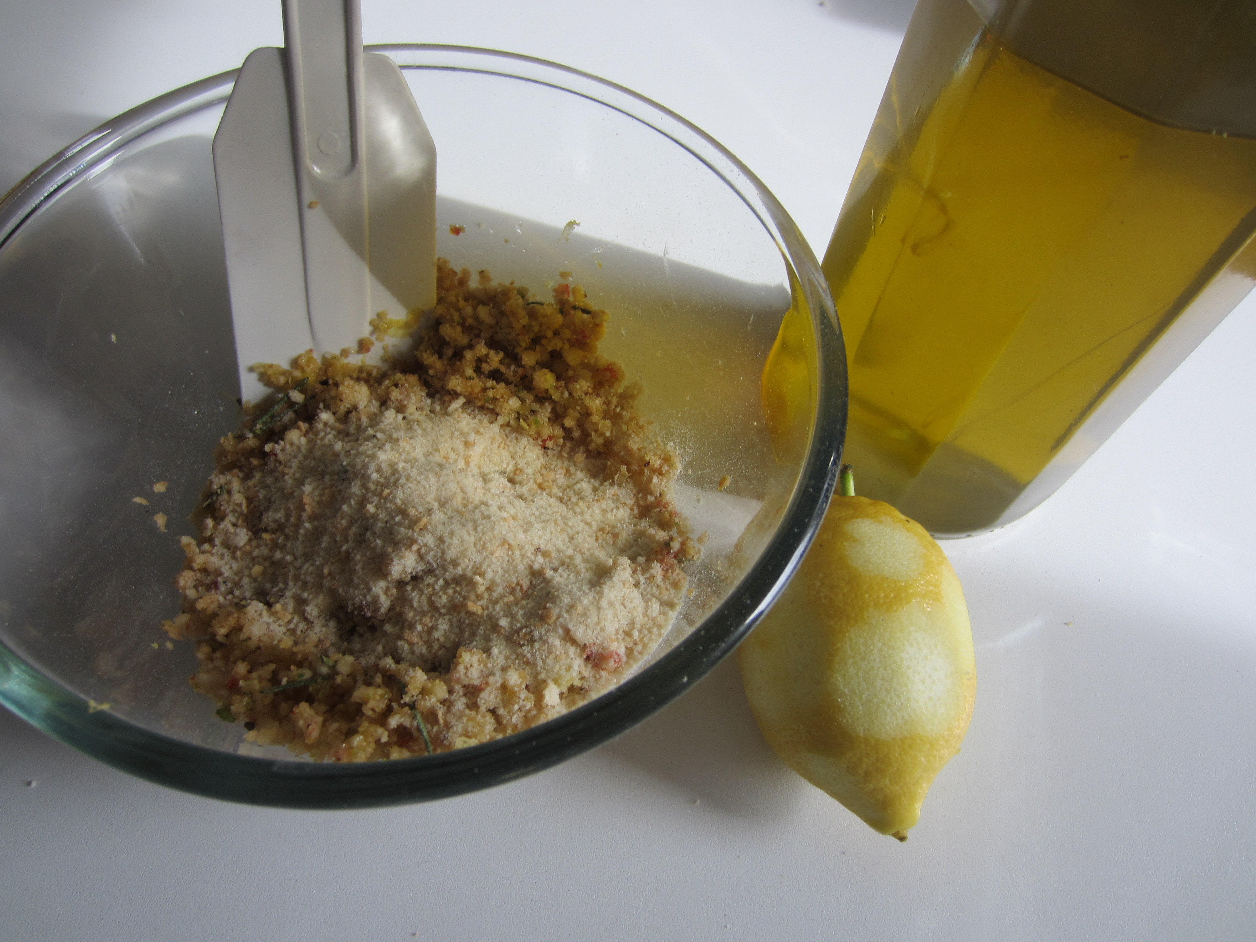 In a bowl add the chopped pistachios , the chopped mix just made and bread crumb, and mix well. Add the grated lemon zest and 2 tablespoons of extra virgin olive oil.