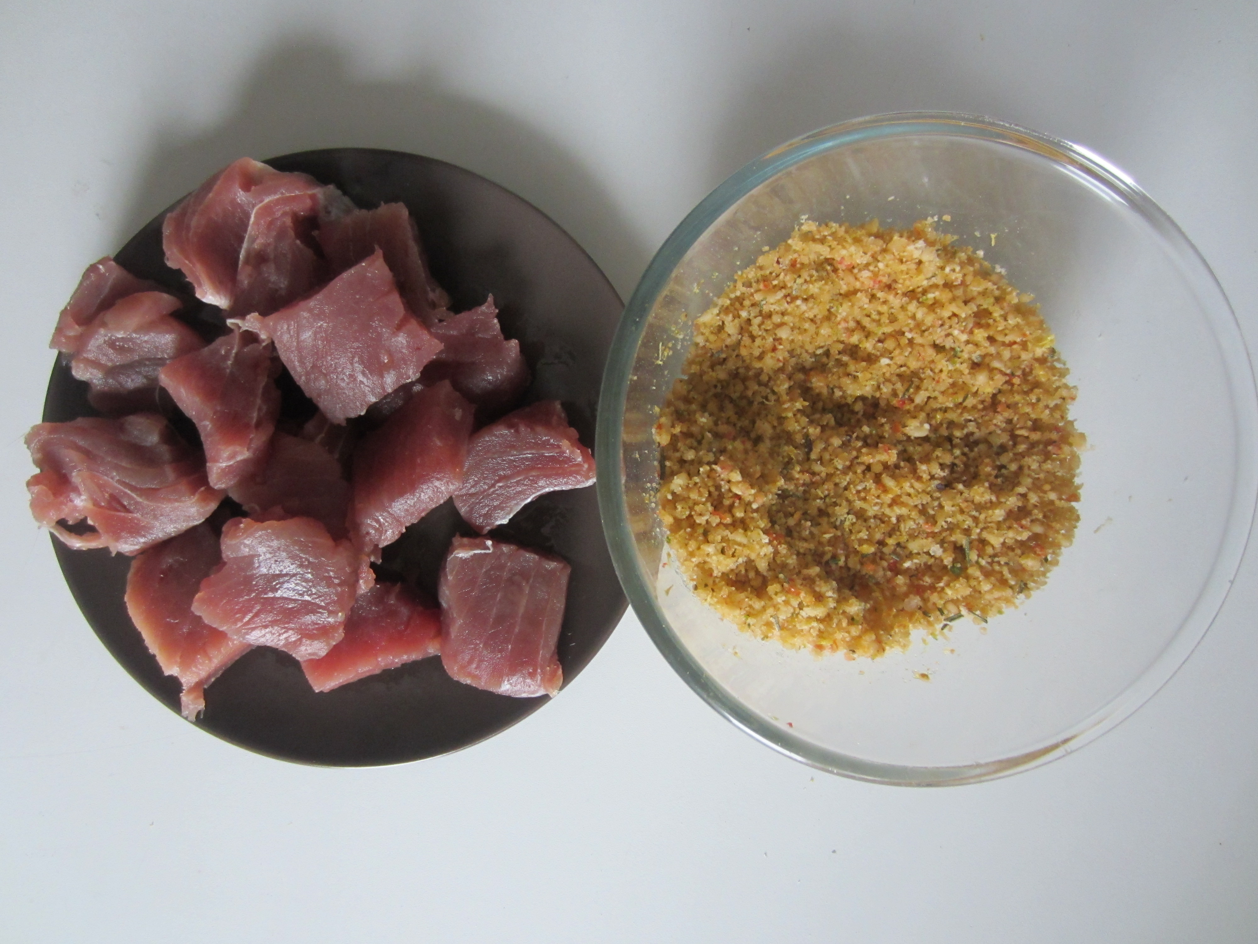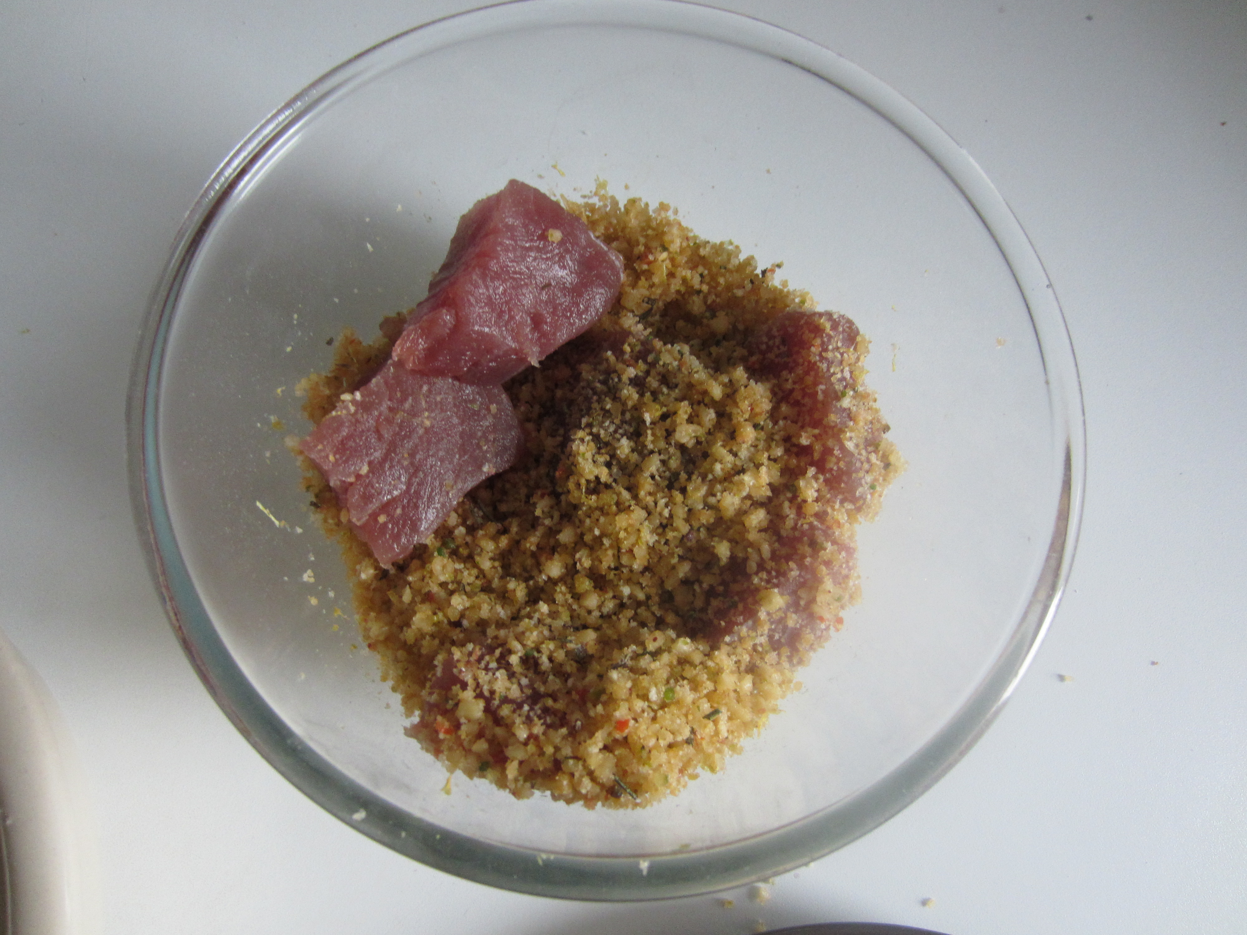 Bread the bites of tuna at a time with the breadcrumbs thus obtained , pressing a bit ‘ so that it adheres well.