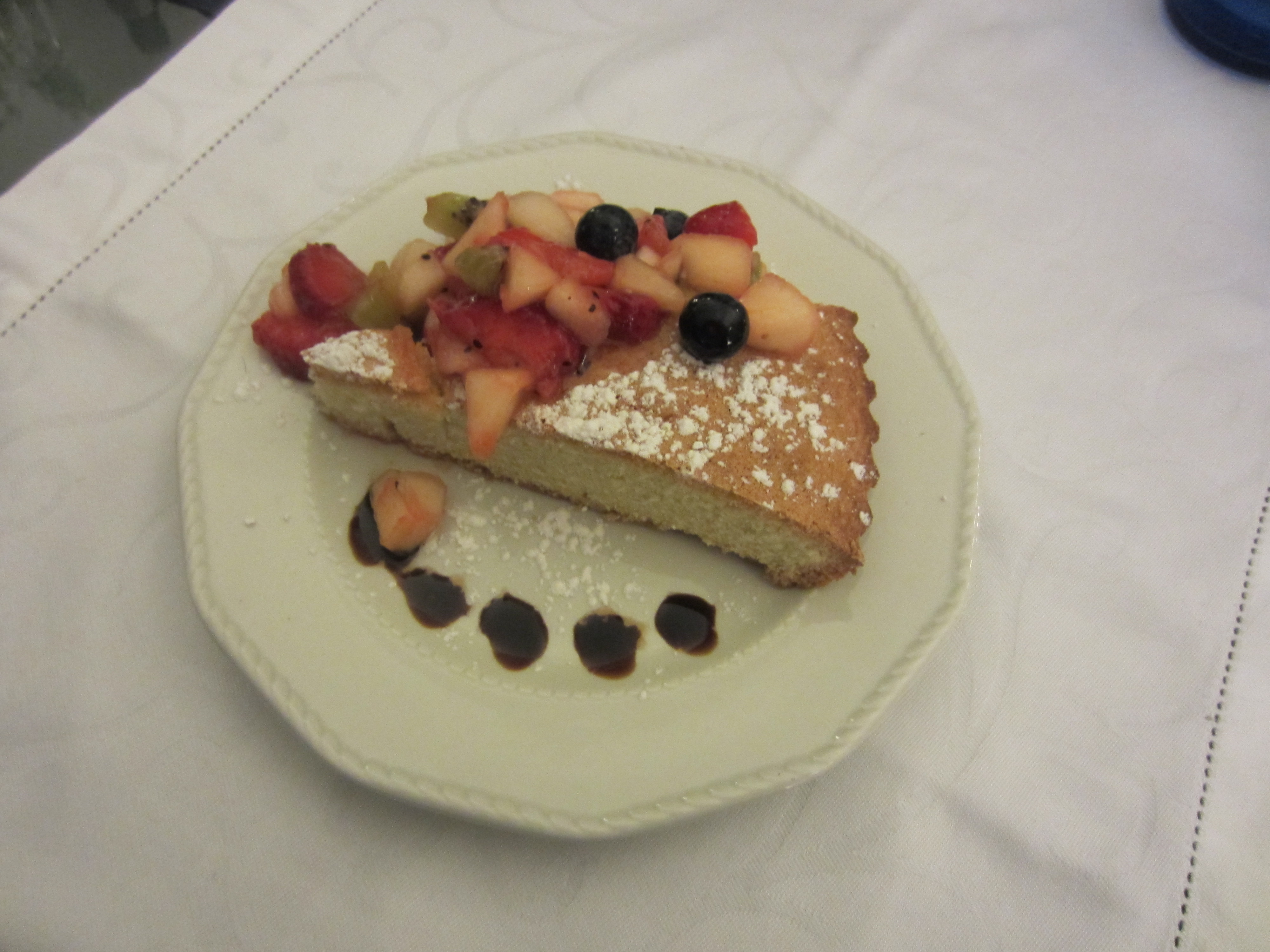 Add n top and on the other side of th cake few Balsamic Vinegar Glaze drops, and put in fridge for 15 minutes. The liquid of the fruit salad will be absorbed by the cake, and the Balsamic Vinegar Glaze will give a wonderful taste.