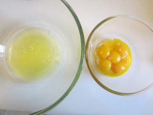 First, divide the egg whites from egg yolks , then whisk hard the whites , adding a pinch of salt.