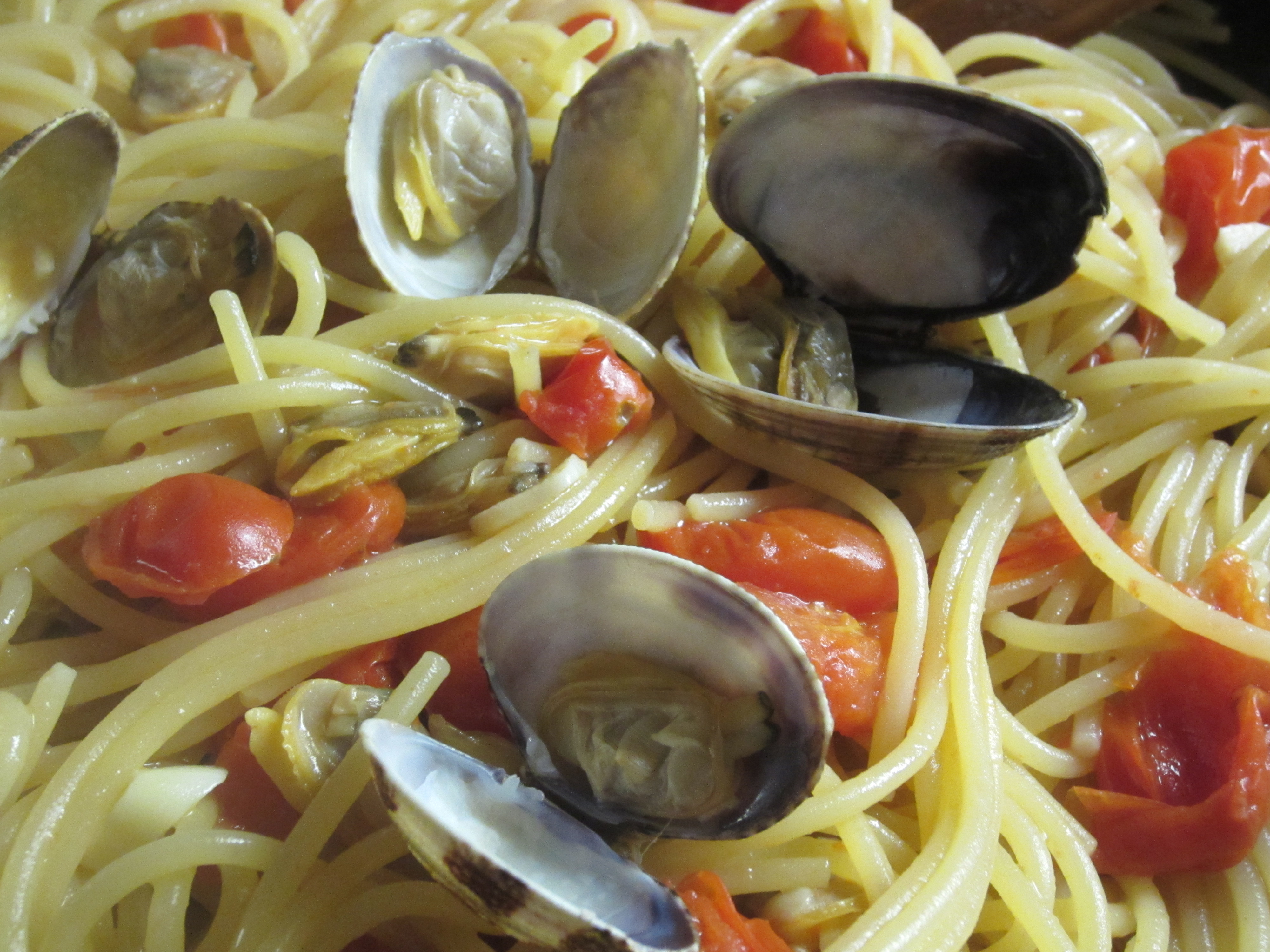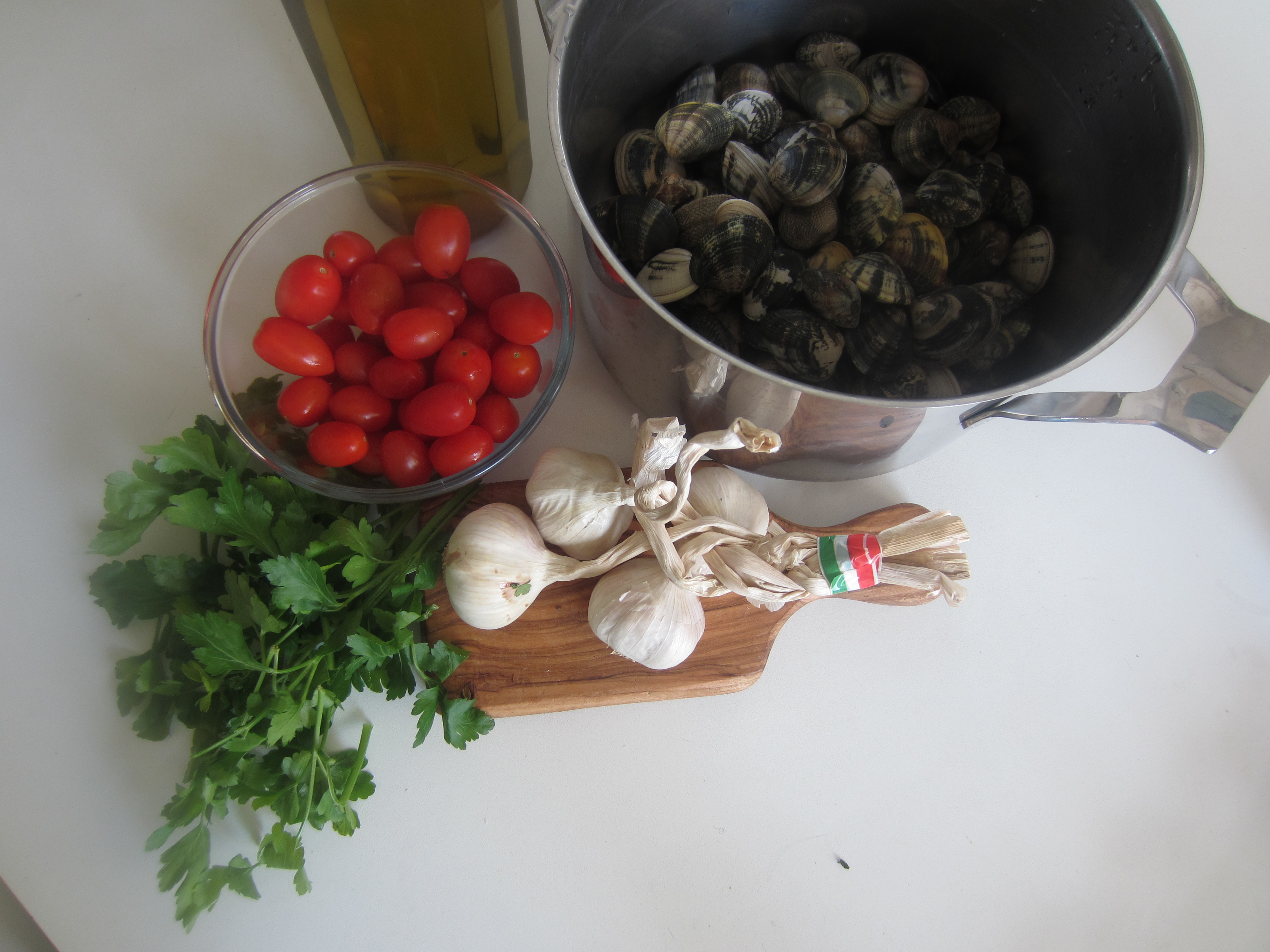 First of all, put the clams (which you did bleed in salt water overnight) in a pot with a clove of garlic, and no water. Turn on the heat and put the lid on . Depending on the amount of clams, within 10 /20 minutes all the clams are open .
