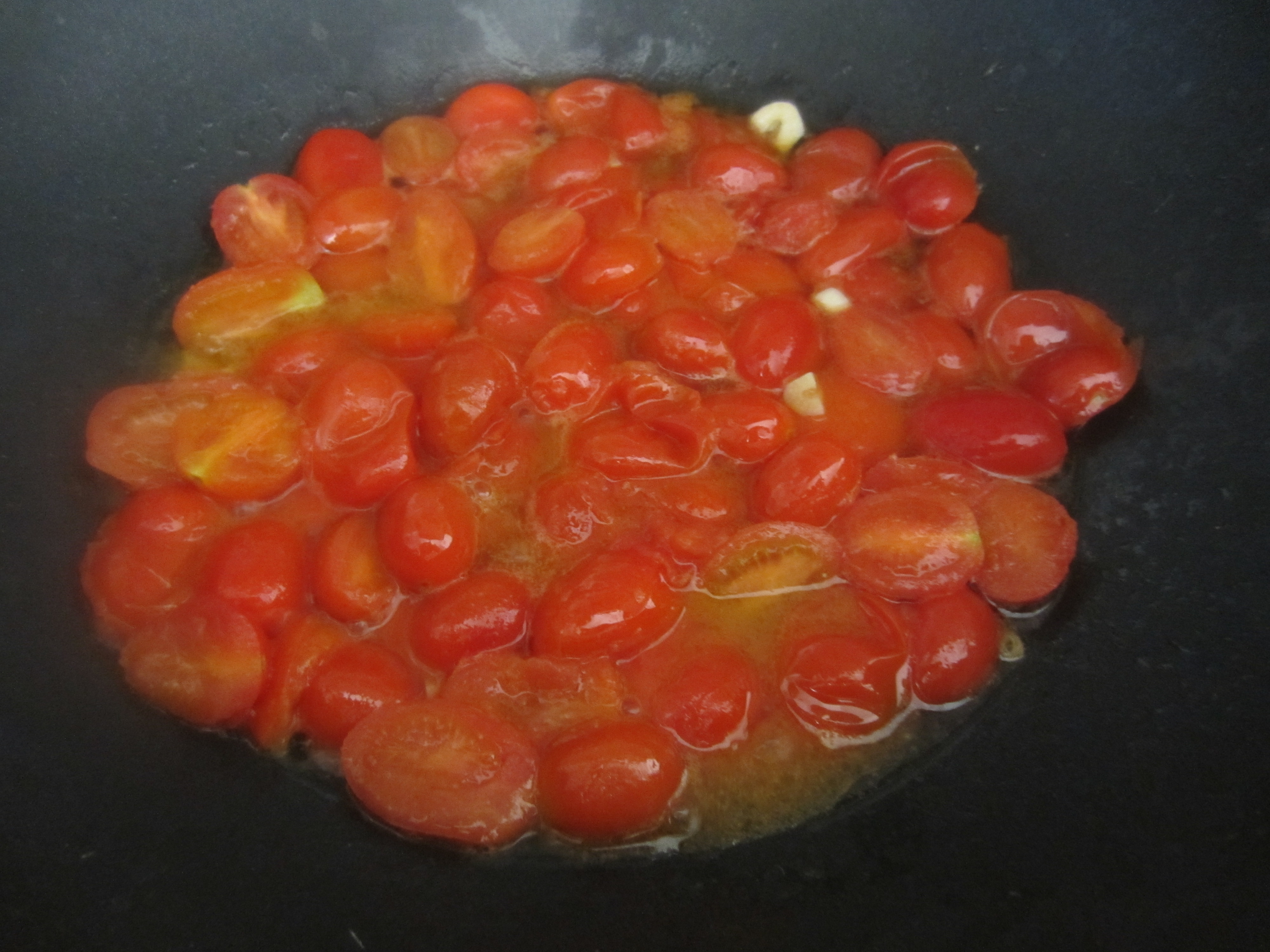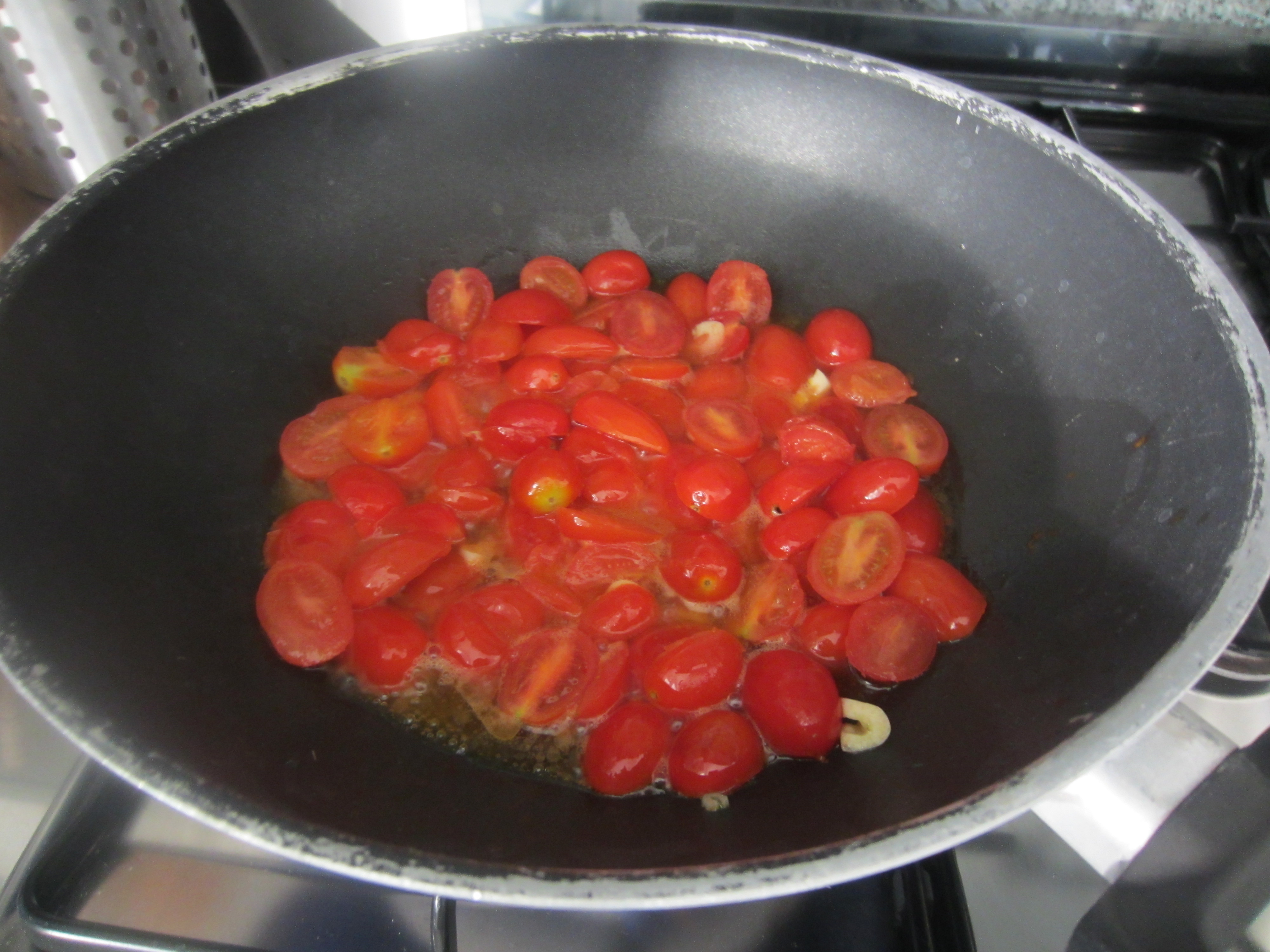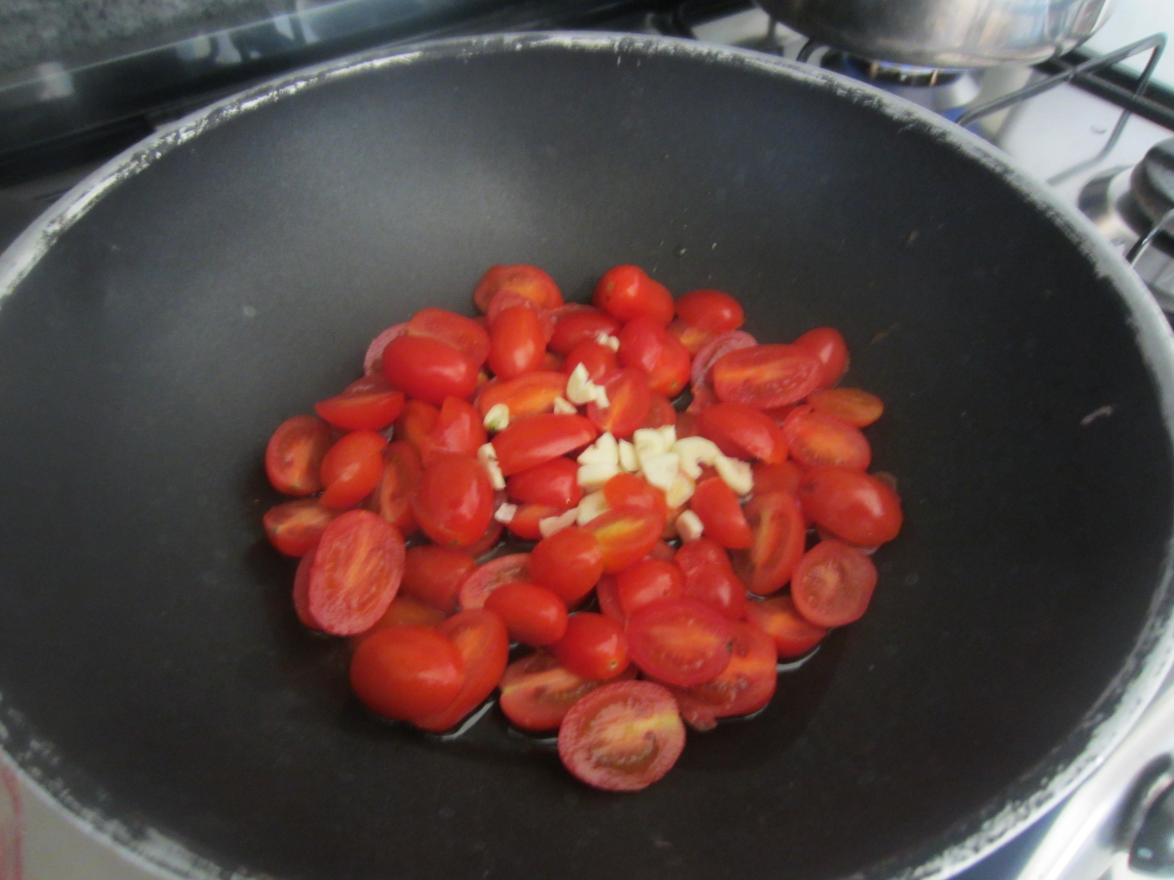 While the clams are cooking, in a pot wok shape put the oil extra virgin olive oil, the peeled garlic and the cherry tomatoes cut in half.