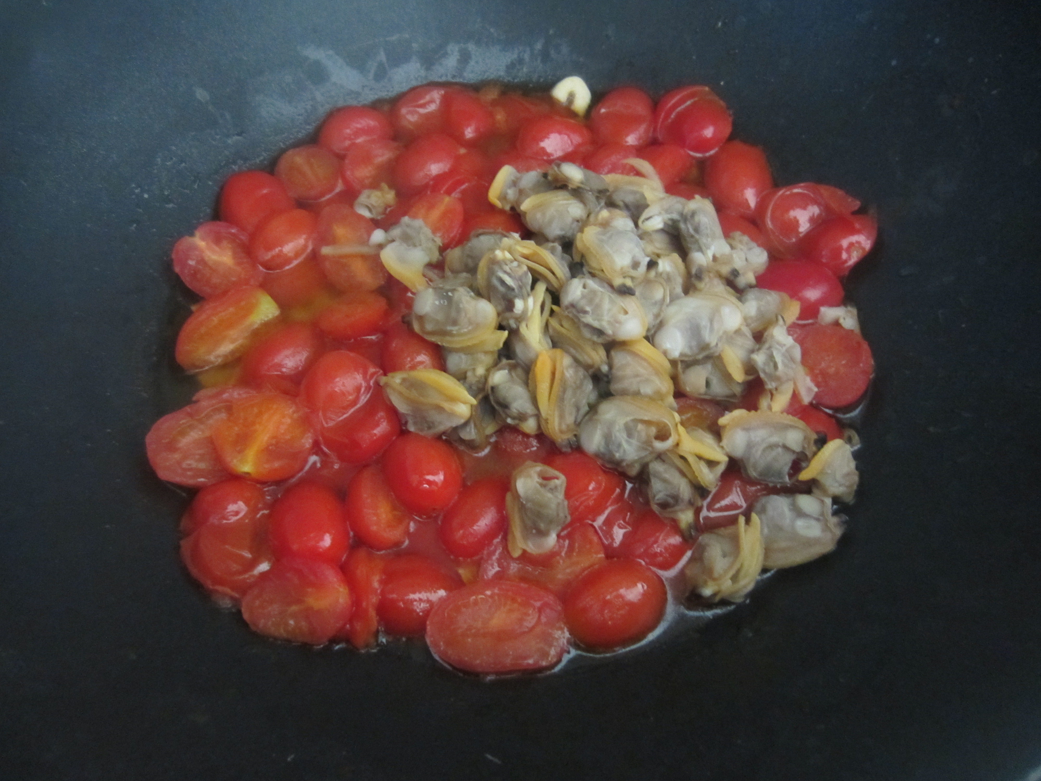 Once you put all the clams into the wok with the tomatoes , add also the clams water, filtering with a filter of cotton. Just a handkerchief in a colander is OK . This will prevent your plate has some sand in. If you find any clams that do not open , it means that it is bad and then throw it .