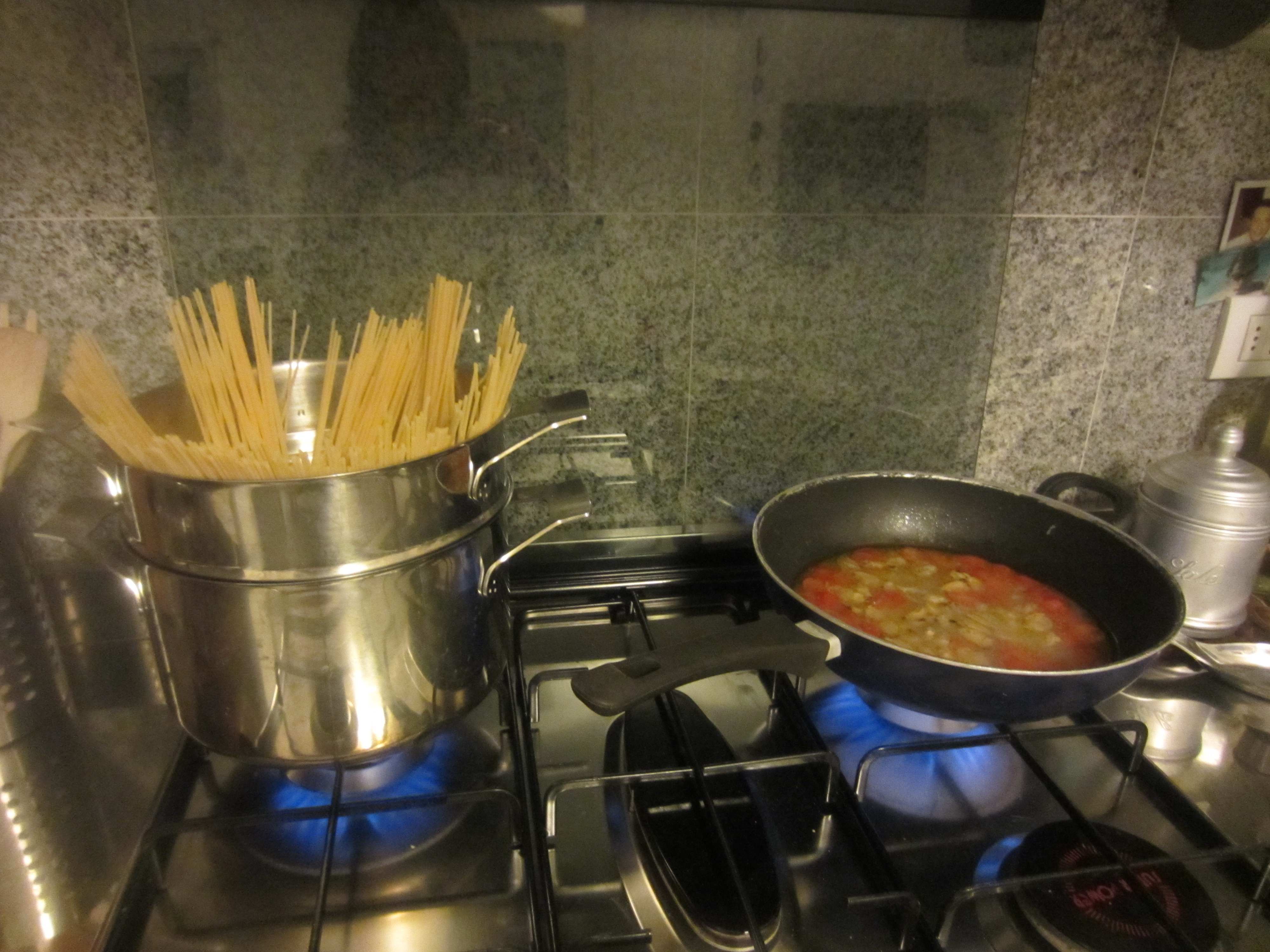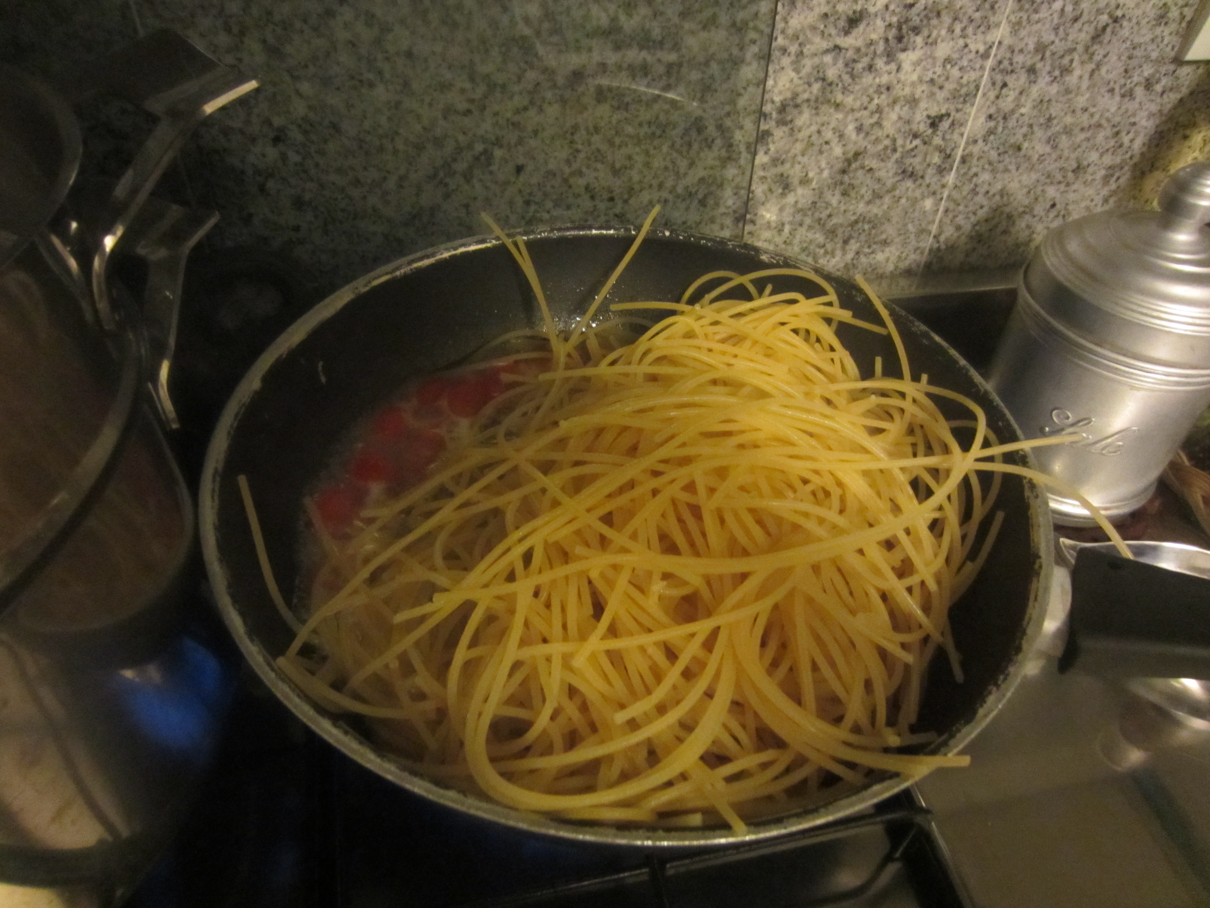 It ‘s time to boil water to cook the spaghetti . As soon as the water boils, add salt to taste and throw the spaghetti. At the same time turn on the heat under the wok with clams and tomato . Cook the spaghetti in the water for half the time required for cooking al dente, usually about 5 minutes.
